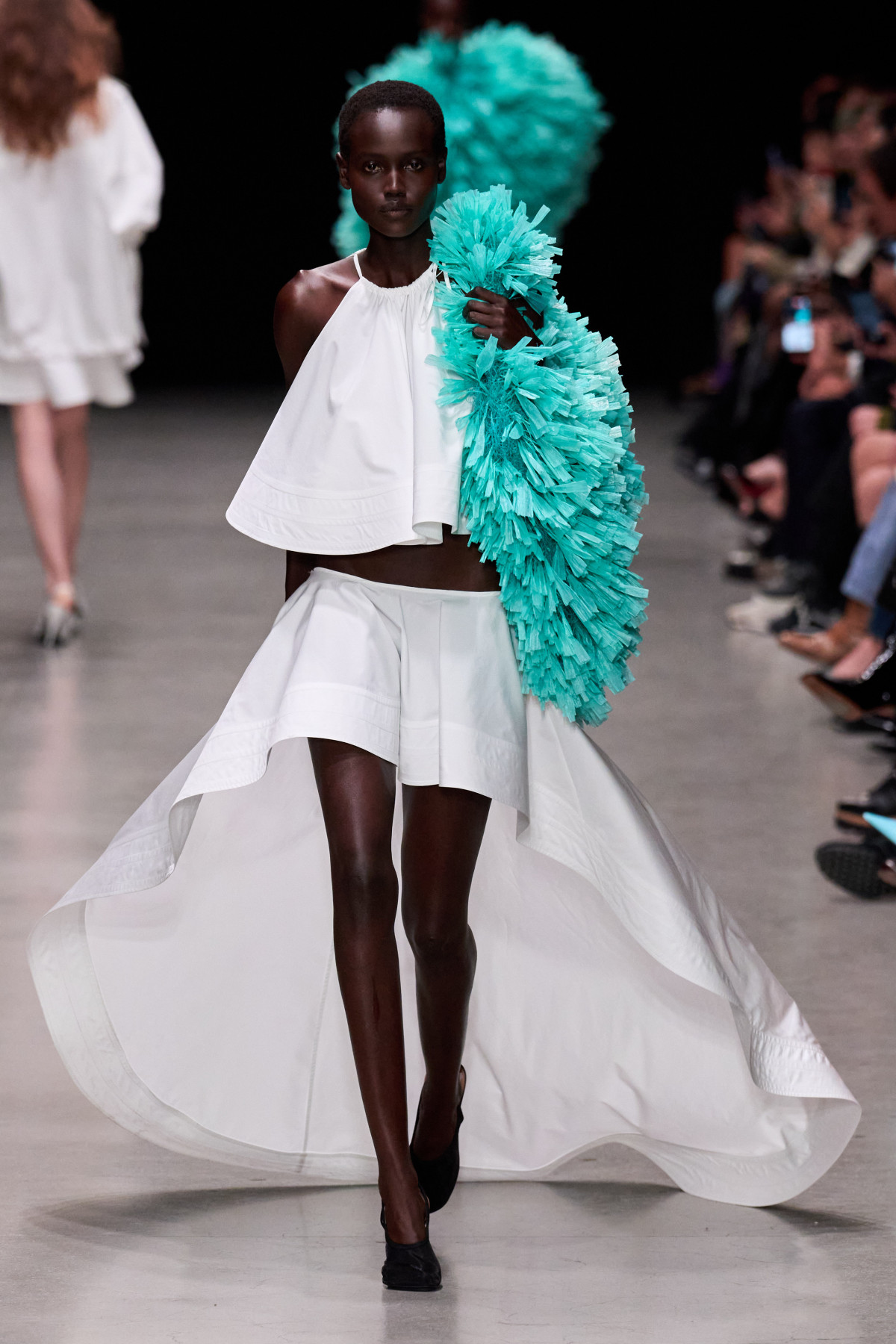Якщо ж розбирати візуальну складову лінійки, то тут дизайнерка залишилася вірною собі й продемонструвала низку елегантних образів, що вдало підкреслювали силуети й при цьому дарували свободу рухів і максимальний комфорт. Спочатку гості побачили сірі смугасті комплекти з новою версією сорочки — моделлю, що стягується на талії й розкльошується до низу. Далі були класичні структуровані костюми, невагомі шуби, що нагадували солодку вату, сукні з драпіруванням і воланами, а також боді, доповнені вже згаданим екологічним пір’ям.