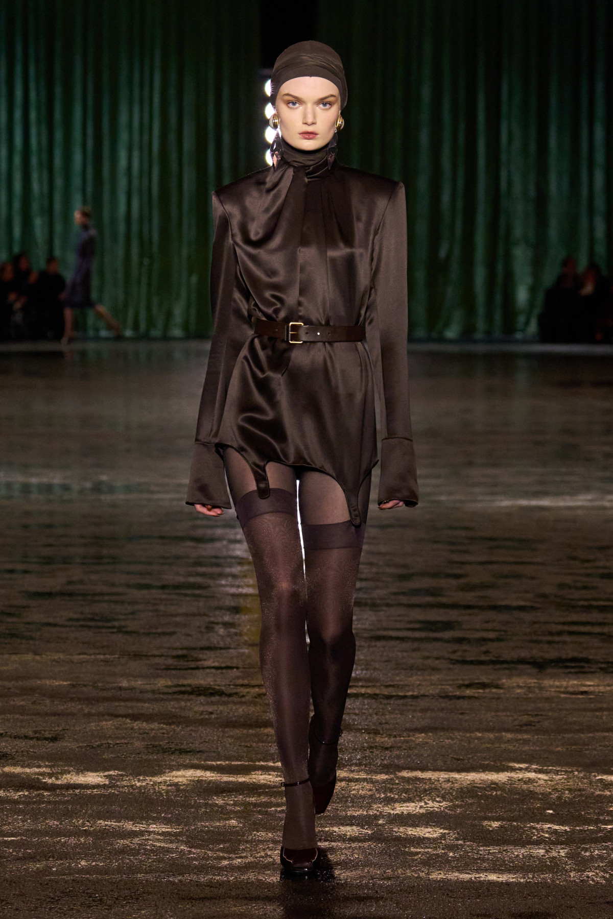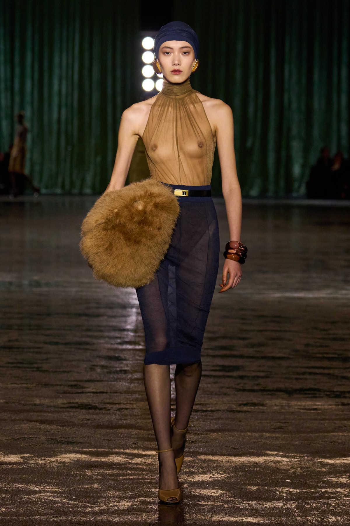 Дизайнер здебільшого акцентував на видовженому стрункому силуеті з підкресленою лінією талії. Головними предметами колекції стали прозорі мінісукні без бретелей; моделі міді з драпіруванням; спідниці-олівці, що поєднувалися з об’ємними піджаками із цупкої тканини й невагомими блузами, прикрашеними бантами; масивні шуби з кольорового хутра й уже класичні брючні костюми. З головних уборів на кожній моделі можна було помітити тюрбани, що були обв’язані навколо голови. Серед інших аксесуарів були запропоновані громіздкі браслети, тонкі ремені із золотими пряжками й емблемами YSL та довгі сережки переважно різних геометричних форм. Колірна гама коливалася від оливкових і темно-зелених відтінків до жовтуватих, коричневих, бежевих і синіх.