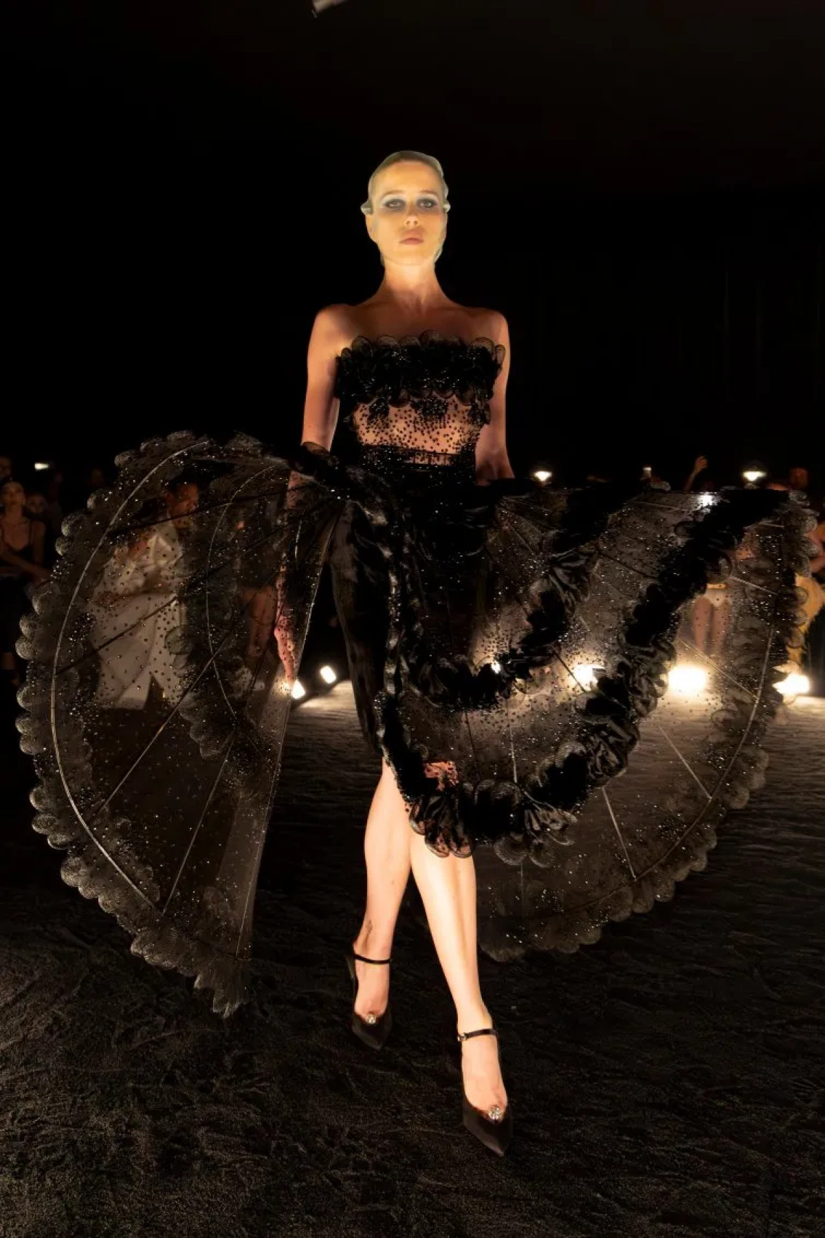 Відкрила показ модель у чорному оксамитовому кейпі з масивною сяйливою деталлю у вигляді крил фенікса, що немовби огортали плечі. Далі перед гостями постав образ із довгою сукнею з драпіруванням та вирізом до стегон. Також серед пам’ятних моделей опинилися чорна максі, всуціль розшита золотими латунними елементами, які створювали ефект луски; сукня-бюстьє, доповнена 3D-шипами, та комплект з атласного піджака з об’ємною фатиновою спідницею, розшитою паєтками.