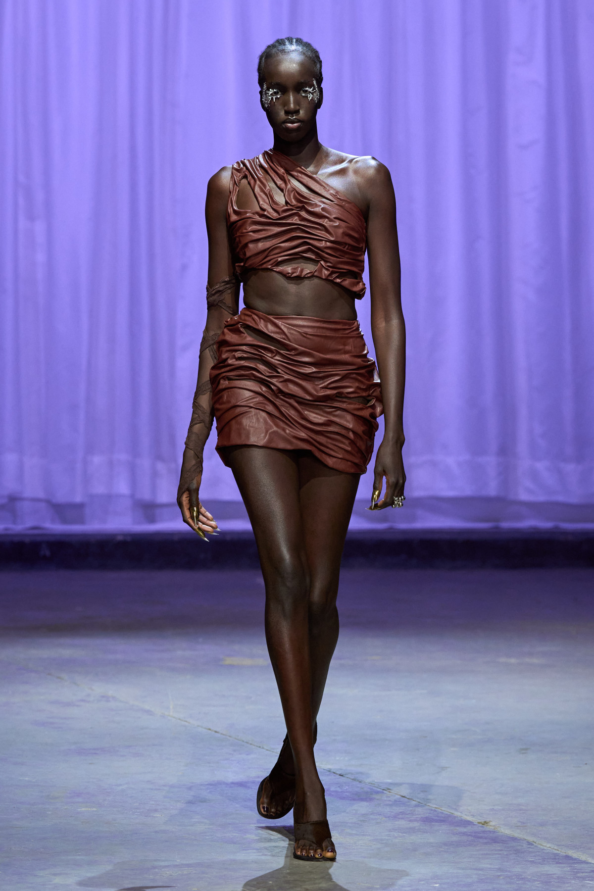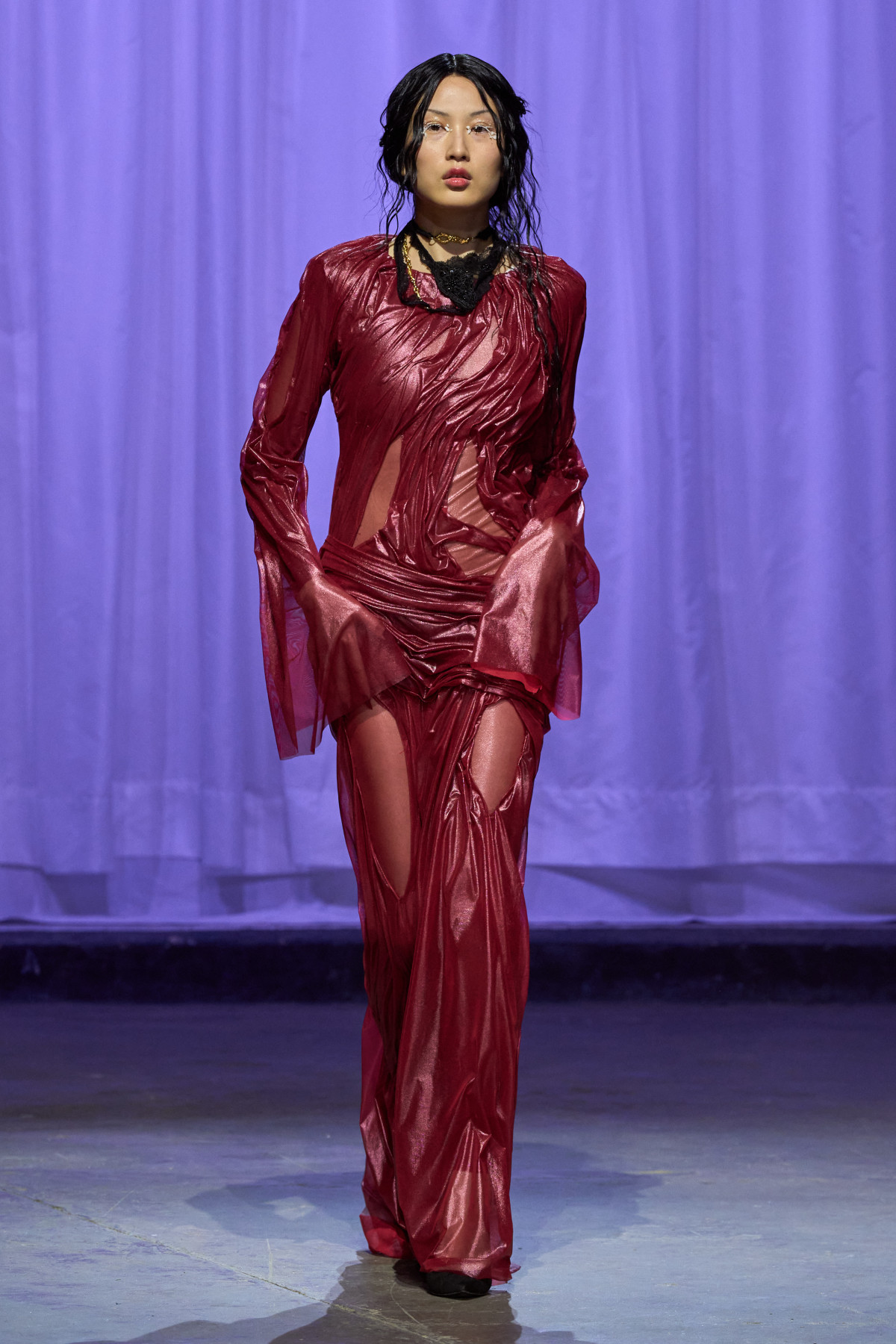 Бренд Di Petsa під керівництвом грецької дизайнерки Дімітри Петси продовжив досліджувати концепцію екофемінізму та зв’язок жінки з водою. У новій колекції дизайнерка знову звернулася до своєї знакової естетики: суконь з ефектом мокрої тканини, що підкреслюють природні лінії тіла, та складних силуетів, ніби розірваних на частини.