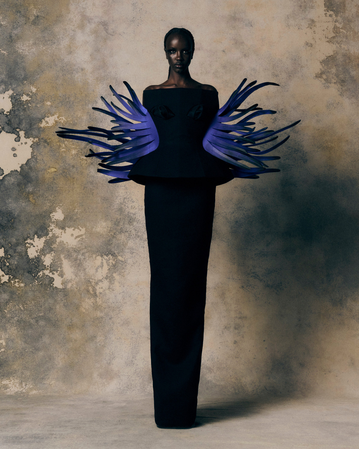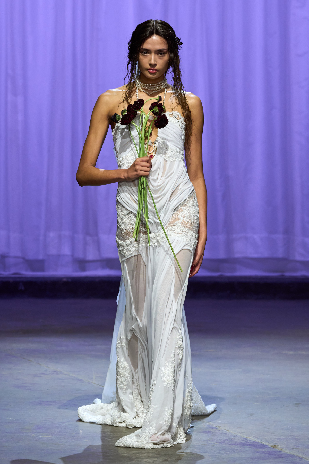 Шоу відкрила муза та близька подруга дизайнера — актриса Флоренс П’ю. Вона з’явилася на подіумі в чорній сукні з капюшоном, де жорсткий корсет контрастував із напівпрозорими вуалями, створюючи ефектну гру фактур. Під супровід віолончелей, що виконували композиції Metallica, її образ втілював сучасну готичну героїню, а легкі, майже невагомі вії лише підсилювали драматичний ефект.