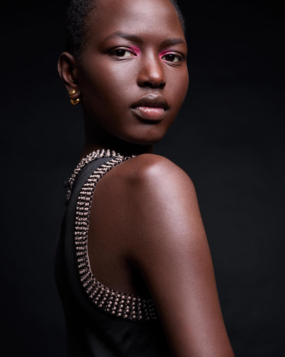 Кольоровий феєрверк контрастує з сяйнистою шкірою та лаконічною зачіскою. Пітер Філіпс за допомогою макіяжу нагадує нам: не варто шукати особливого приводу, щоб створити ефектний образ. До речі, цей надзвичайний макіяж чудово поєднується з чуттєвим трикотажем пісочного кольору. Так реалізм ready-to-wear зустрівся з розкішшю рівня от-кутюр у блискучому вечірньому вбранні.