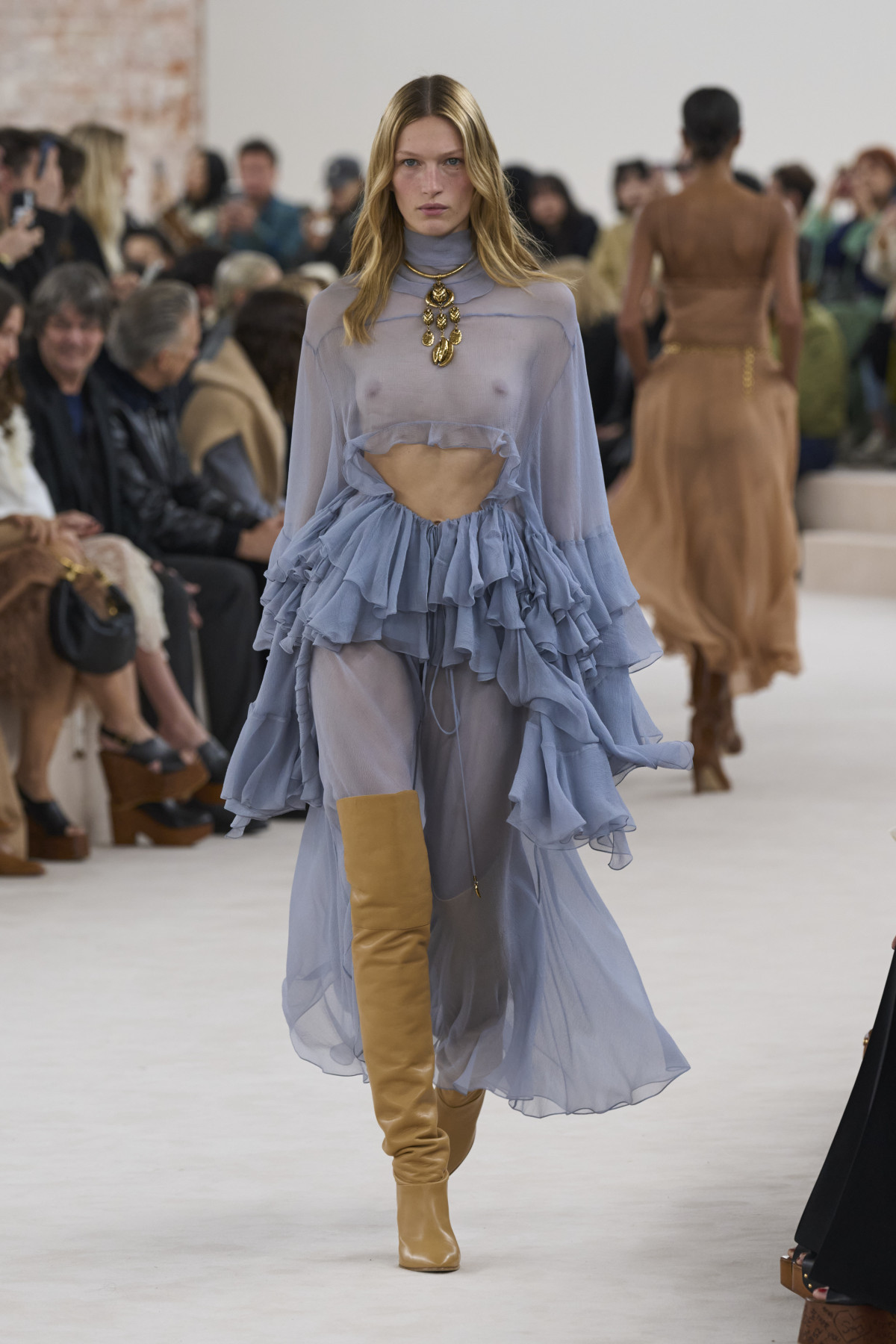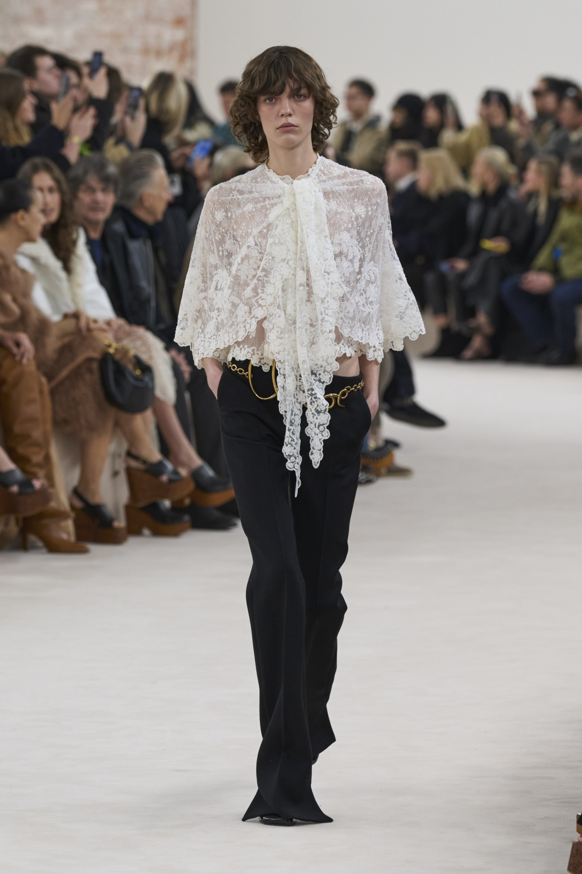 Також не могла пройти повз дебюту Чемени Камалі для Chloé. Плавні вільні силуети, повітряні форми та ніжні кольори стали справжнім втіленням жіночності та свободи. А чого тільки вартують окремі деталі: рюші на прозорих сукнях, бахрома на взутті, брюках і косухах, золоті прикраси у вигляді змій, що обвивають зап’ястки та шию моделей, та об’ємні підвіски на ланцюжках.