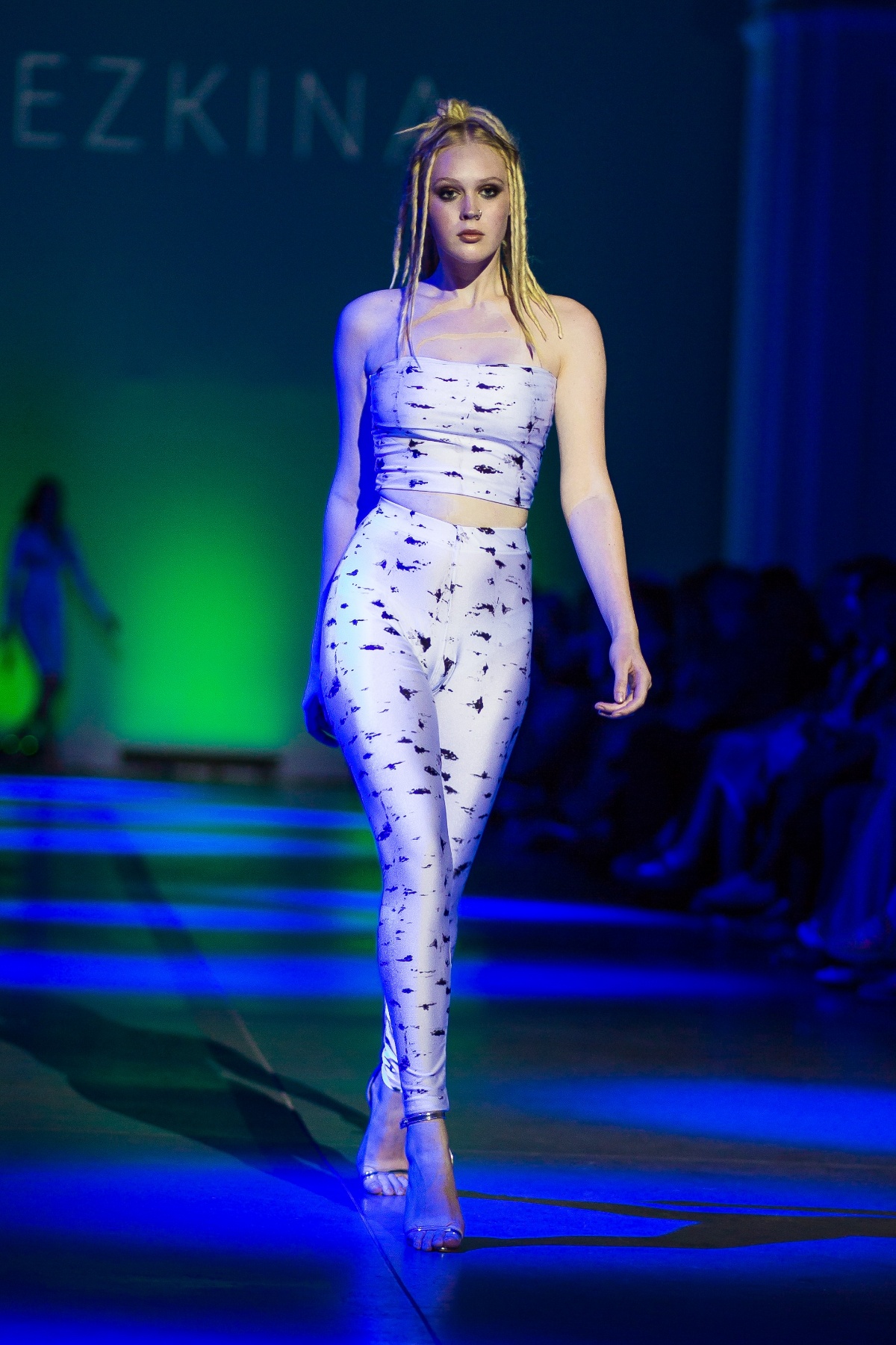 Самым ярким моментом показа стал финал – модели в леггинсах с березовым принтом создали атмосферу настоящей березовой рощи.