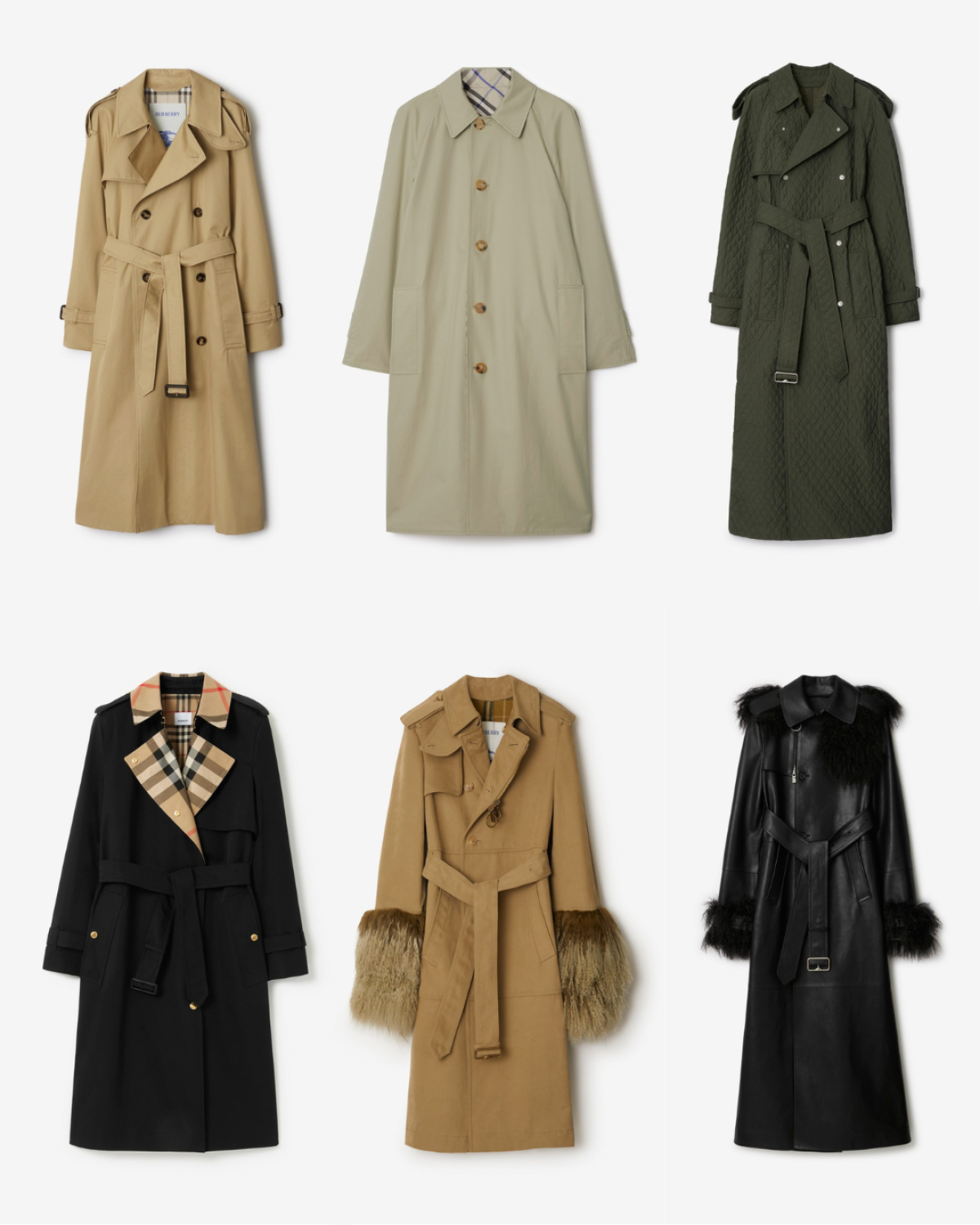 Сьогодні Burberry пропонує п’ять основних стилів тренчів, які залишаються актуальними з сезону в сезон, — Kensington, Chelsea, Waterloo, Camden і Paddington. Усі вони відрізняються особливими силуетами та довжиною: деякі — з більш м’якими регланами, а деякі, навпаки, з чіткішими лініями. Виготовляються тренчі на фабриці в Йоркширі: кожна модель складається з 80 окремих частин, на пошиття яких необхідно близько чотирьох годин.