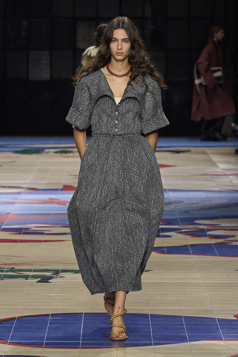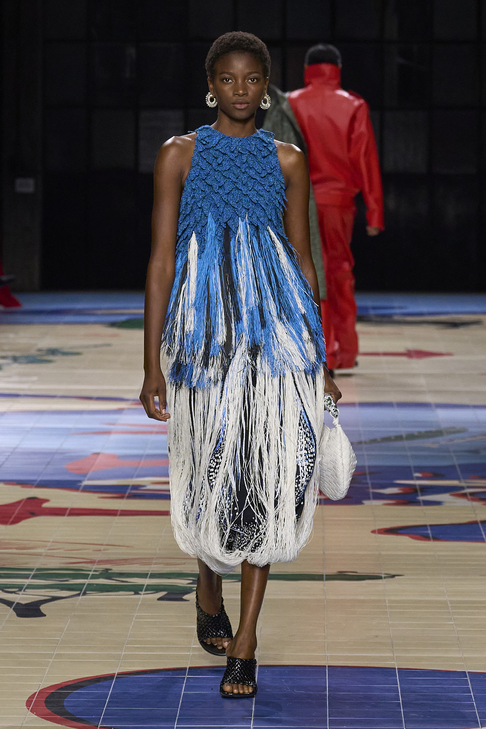 Дизайнер, як завжди, сфокусований на ускладнених та вишуканих силуетах звичних речей та преміальній якості ручної роботи, в тому числі, звичайно, зі шкірою. На подіумі ми побачили втілення ідеї мандрів у бахромі, твідових плащах, величезних сумках-шоперах та рюкзаках, принтах, що нагадують джунглі або пірʼя різноколірних птахів, купальні костюми з шортами, в`язані гачком сукні з рафії з гігантськими помпонами, як рибальські сітки. Це був один з тих випадків, коли дуже хотілося, щоб на показі була інформація про тканини, з яких виготовлений одяг, і техніки, використані для його створення, як легенда на карті.