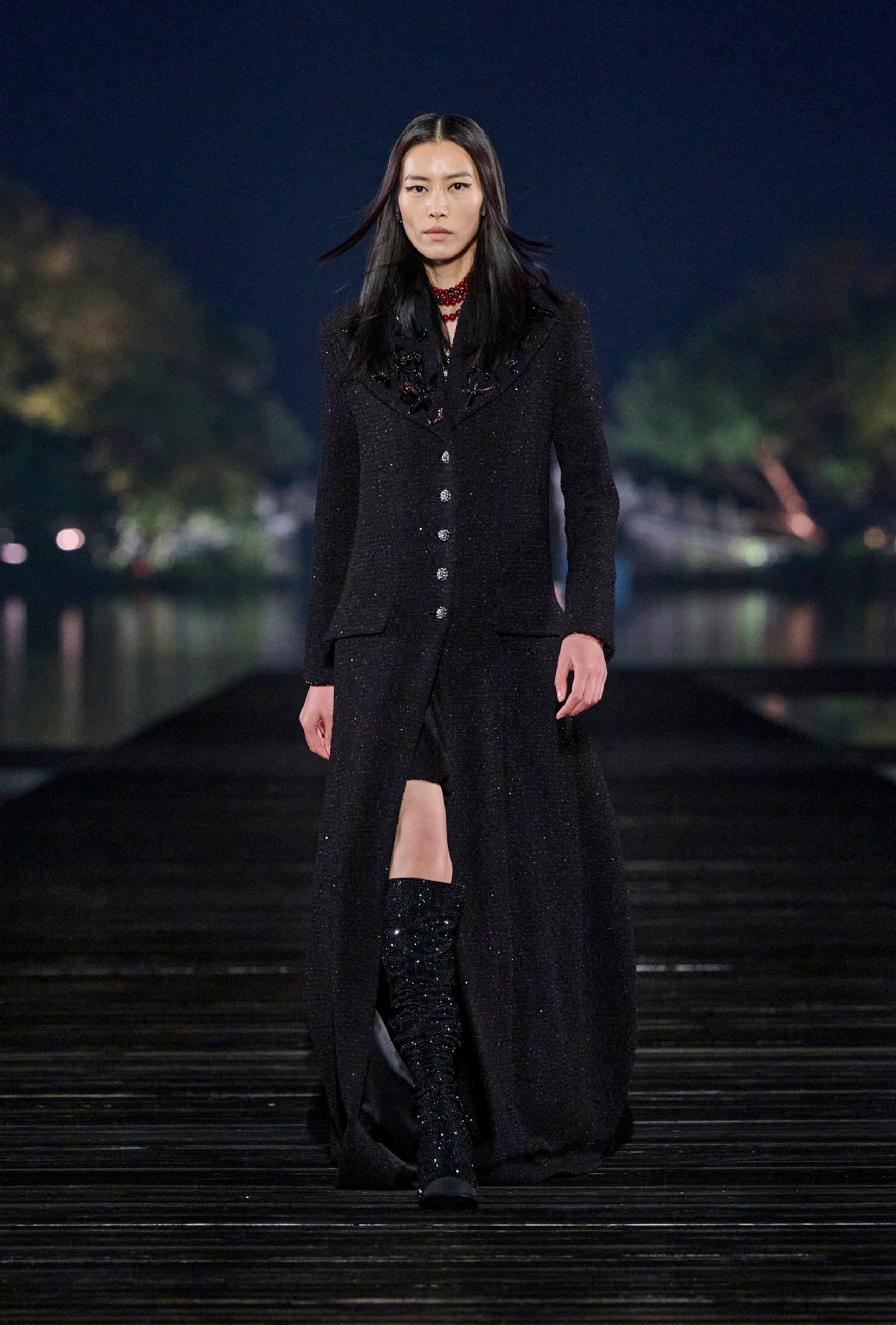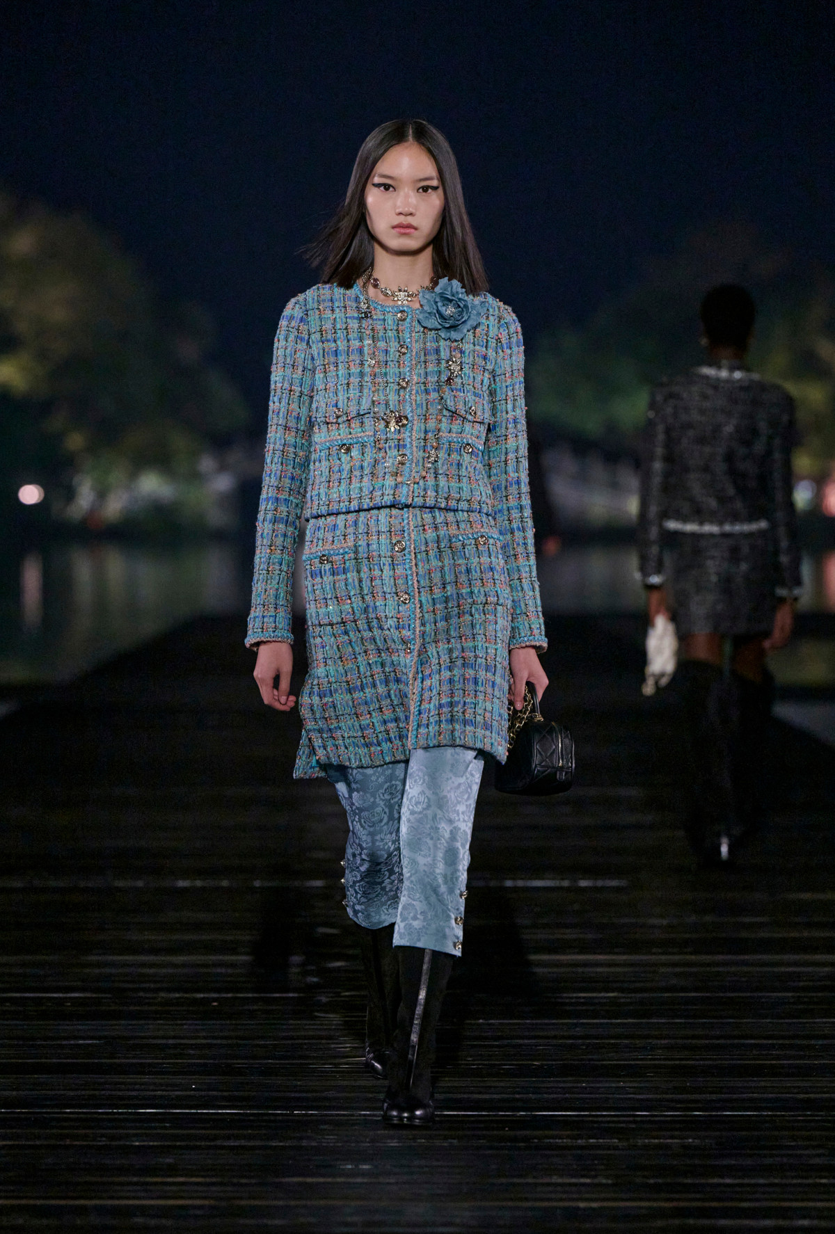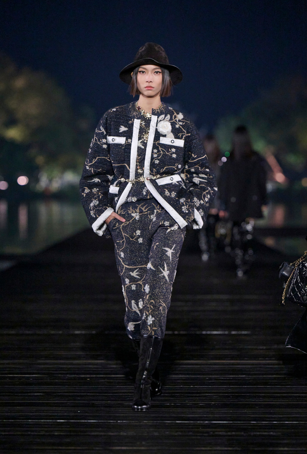 Перші образи запропонували довгі твідові пальта, доповнені сяйливими елементами, шкіряні тренчі з громіздкими кишенями, текстурні бушлати з квітковими зображеннями, а також теплі кардигани. Звісно ж, не обійшлася колекція й без знакових твідових і трикотажних комплектів з міні- та мідіспідницями. На багатьох елементах можна було прослідкувати відсилання до ширм Коко та інших китайських мотивів: так, блискуча флористична вишивка нагадувала малюнки на дерев’яних панелях, темна гладка шкіра — блиск лаку, плісировані спідниці — складки віяла, а денім — брижі на поверхні озера. Завершився показ романтичними й мрійливими нотками, презентувавши глядачам вечірні сукні та легкі піжамні комплекти. З кожним новим образом колірна палітра лінійки яскравішала: якщо спочатку ми спостерігали чорні, темно-сині, сірі й коричневі відтінки, то згодом вони поступилися місцем ніжним блакитним, рожевим, фісташковим і молочним.