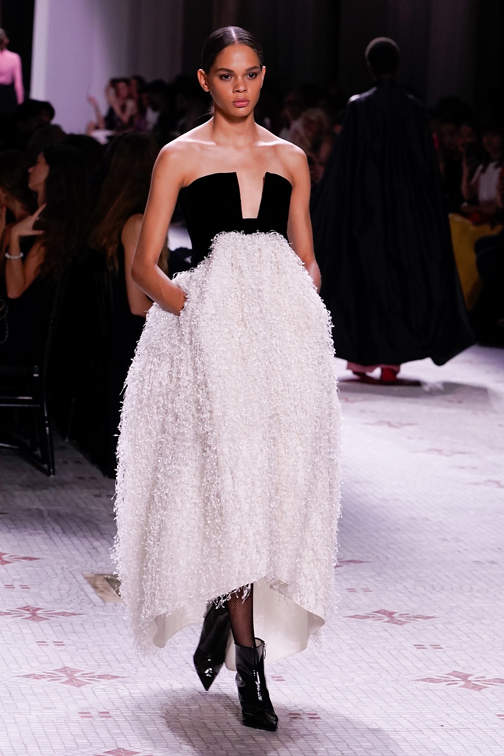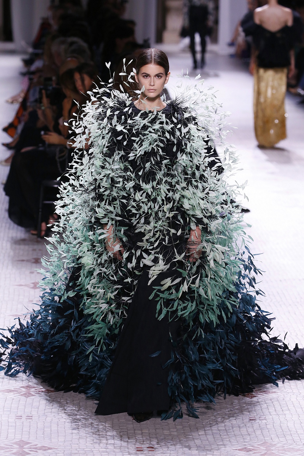 Завершала показ Кайя Гербер, которая появилась на подиуме в платье oversize, украшенном сотней миниатюрных перьев-лепестков. Образ, достойный любой красной дорожки!
