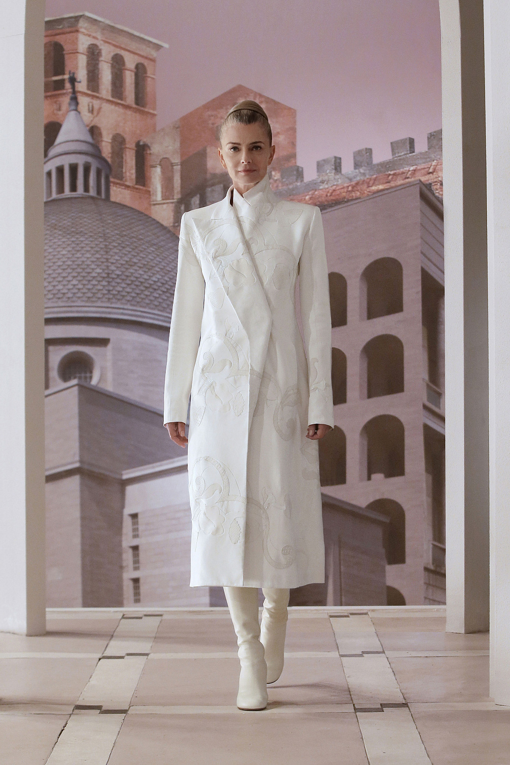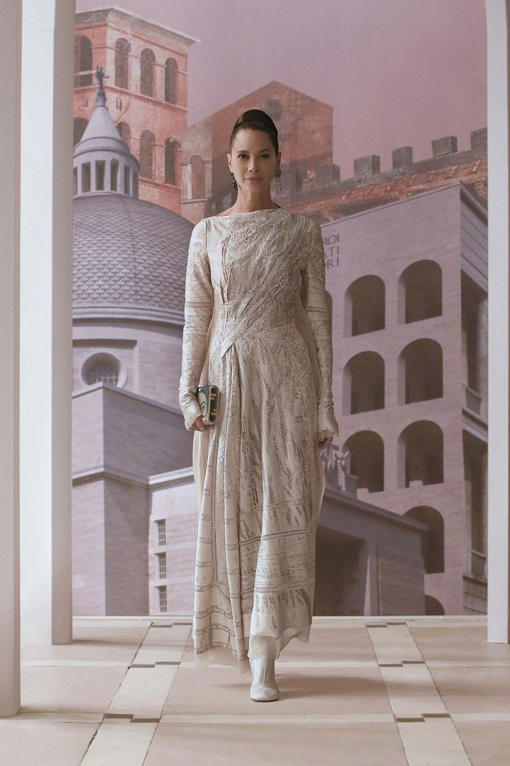 Вторая кутюрная коллекция Кима Джонса для Fendi была запечатлена в эмоциональном фильме Луки Гуаданьино, в котором такие супермодели, как Кейт Мосс, Кристи Терлингтон и Эмбер Валлетта, ходили по римскому театру в платьях, напоминающих статуи Вечного города.