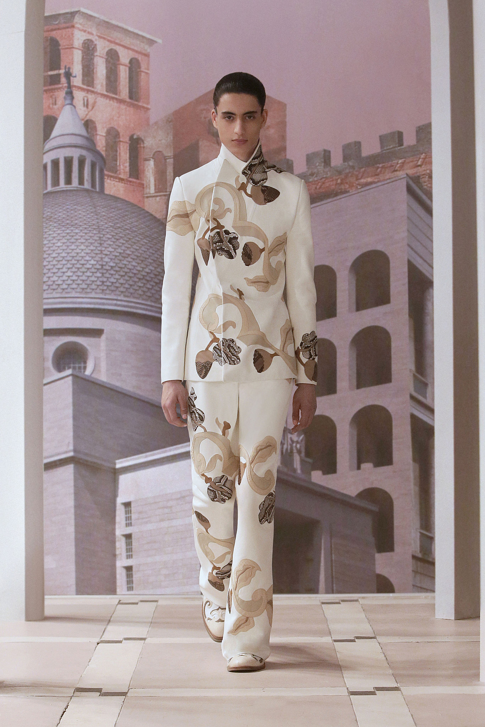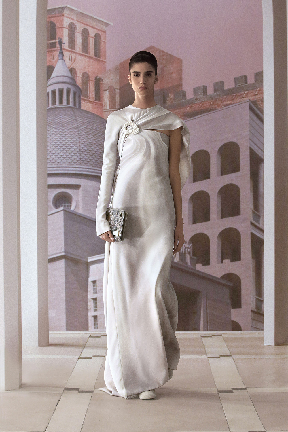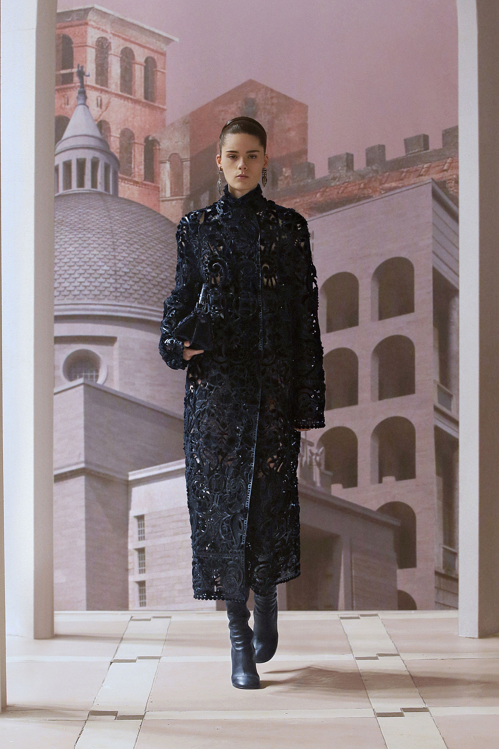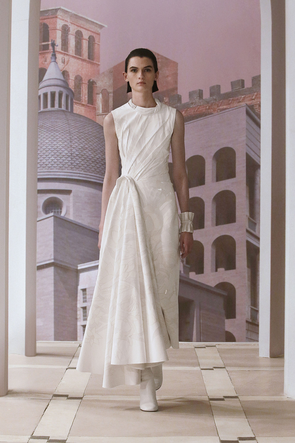 Наибольшее впечатление произвели силуэты — например, завораживающие конструкции платьев из невесомой ткани, которые украшены принтом в виде дыма или нечетких серых волн, напоминая тем самым застывшие в камне наряды богинь. Особенно много в коллекции было вещей со сложными ажурными узорами. Благодаря этому декоративному решению Джонсу удалось воплотить эстетику величественных зданий Рима, украшенных лепниной.