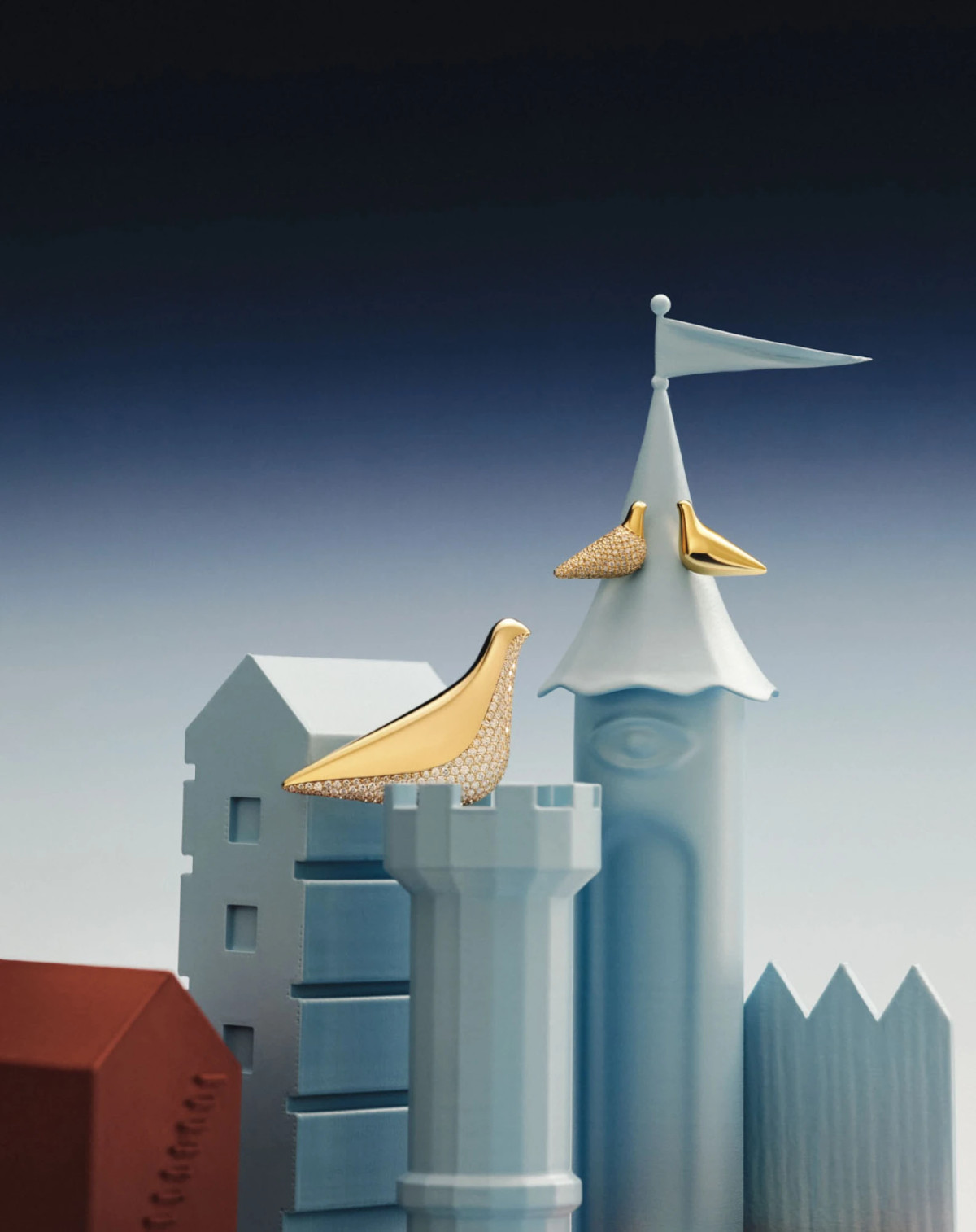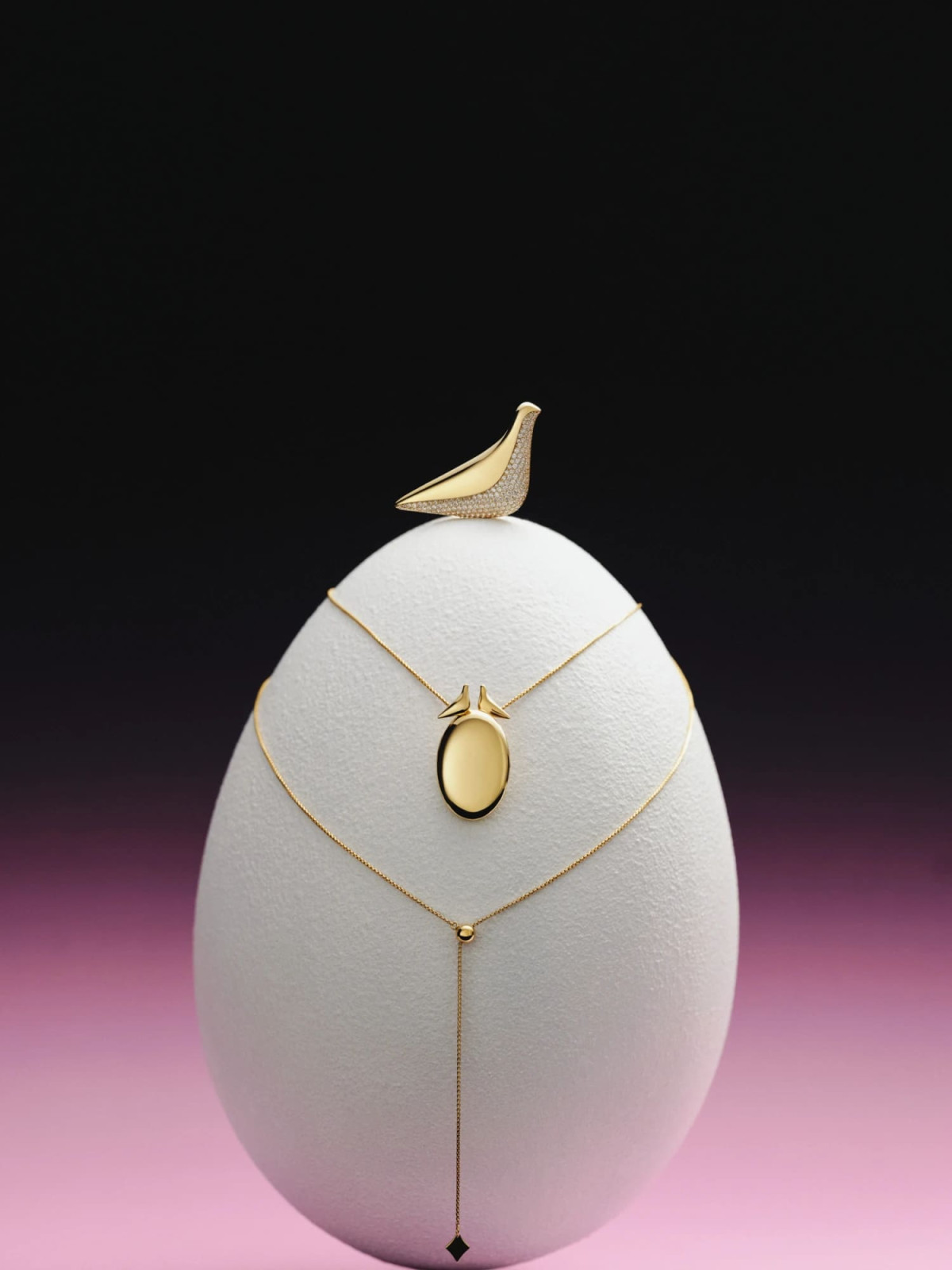 Яйце-райце — кольє-локет у формі овального яйця, натхненне казкою з Уманського повіту (1869). Усередині можна зберігати талісман — воно відкривається. На верхівці — пташка.