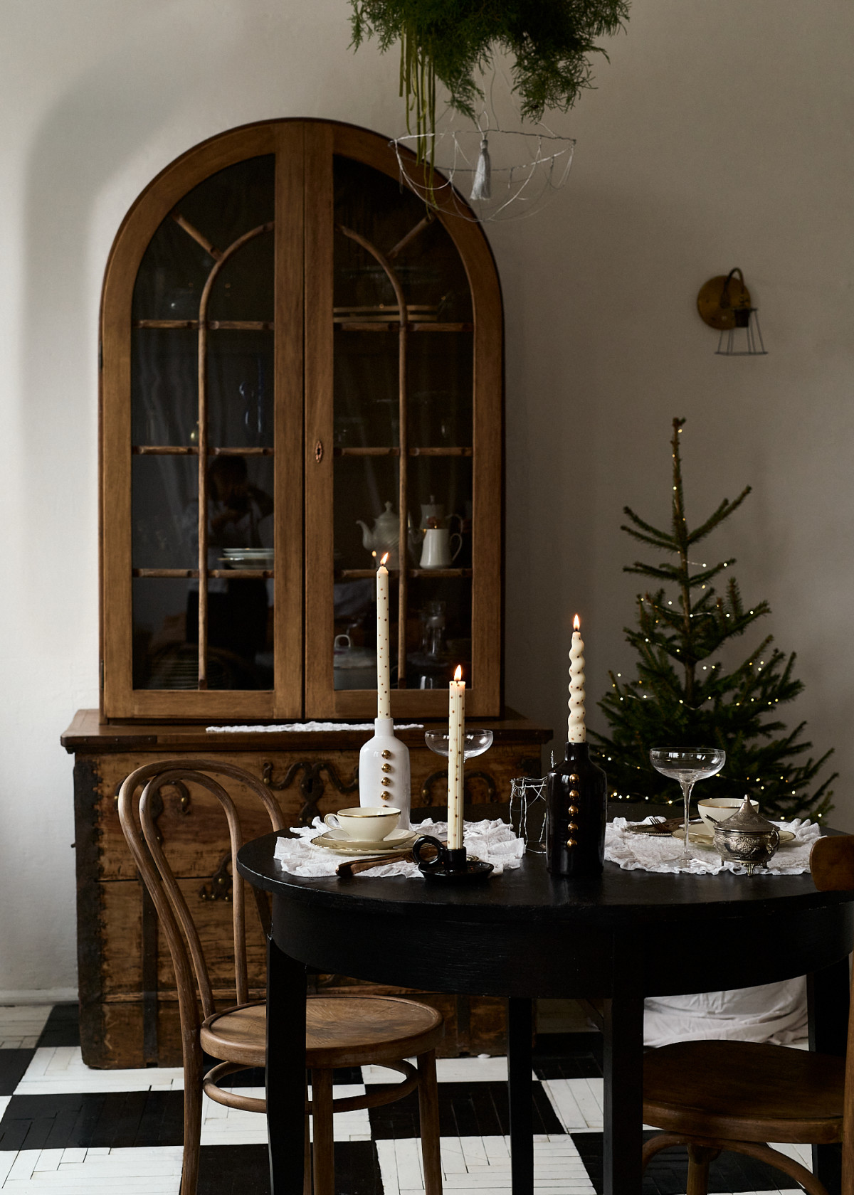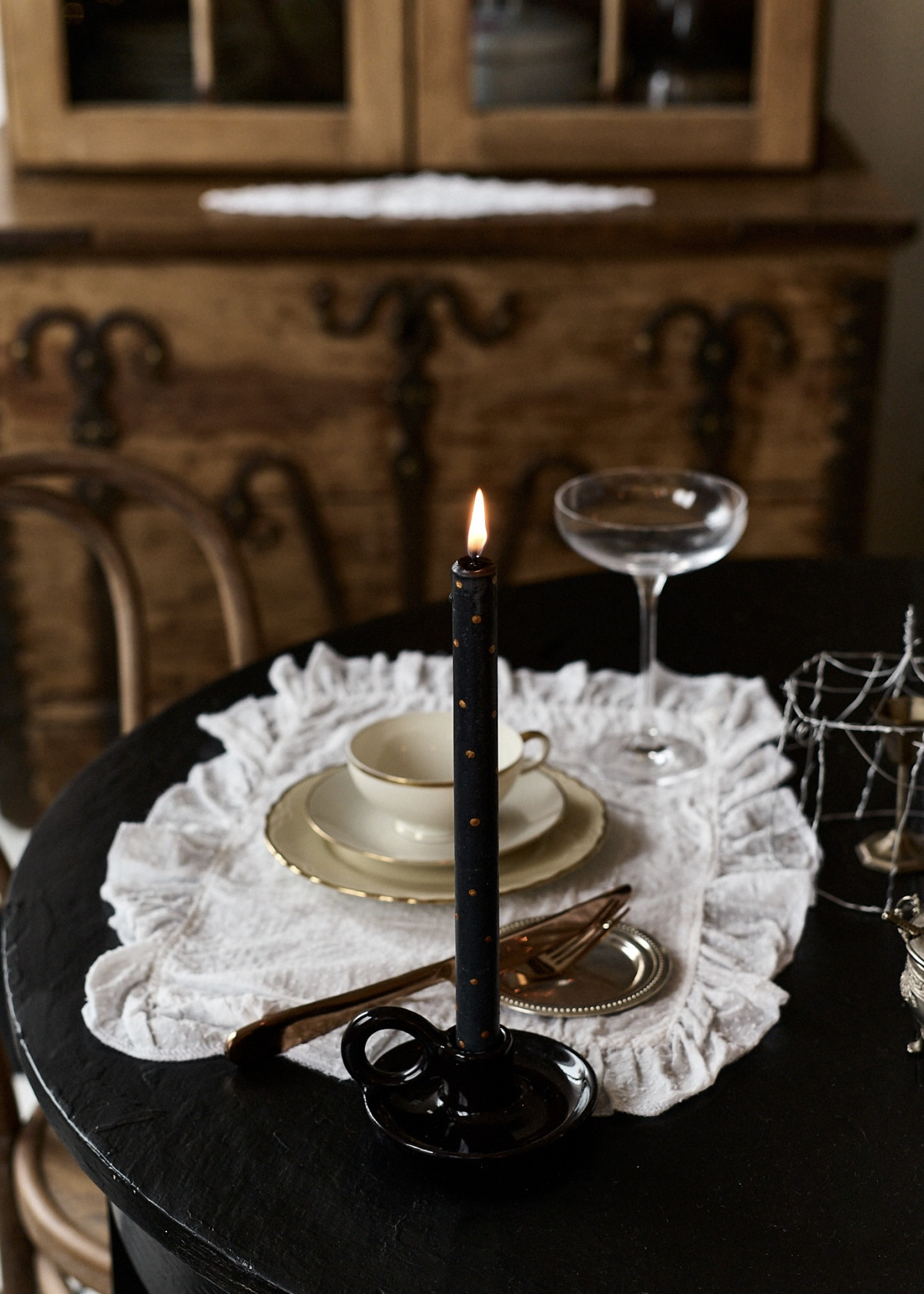 Підсвічники, представлені у чорному та білому кольорах, виконують роль структурного акценту. Вони надають світлу напрямок і темп, створюючи контраст і завершеність композиції. Завдяки ним звичайне сервіровування перетворюється на сцену зі світлом і тінню як головними елементами простору.