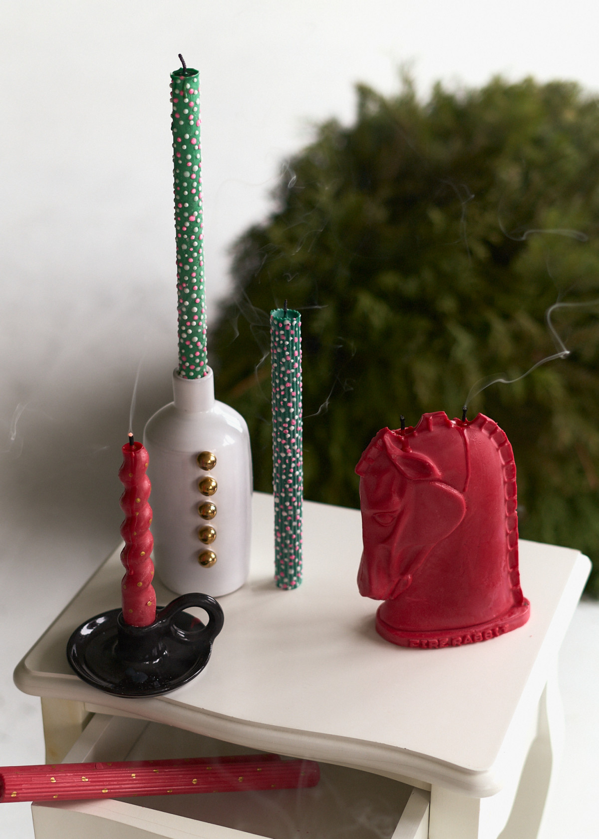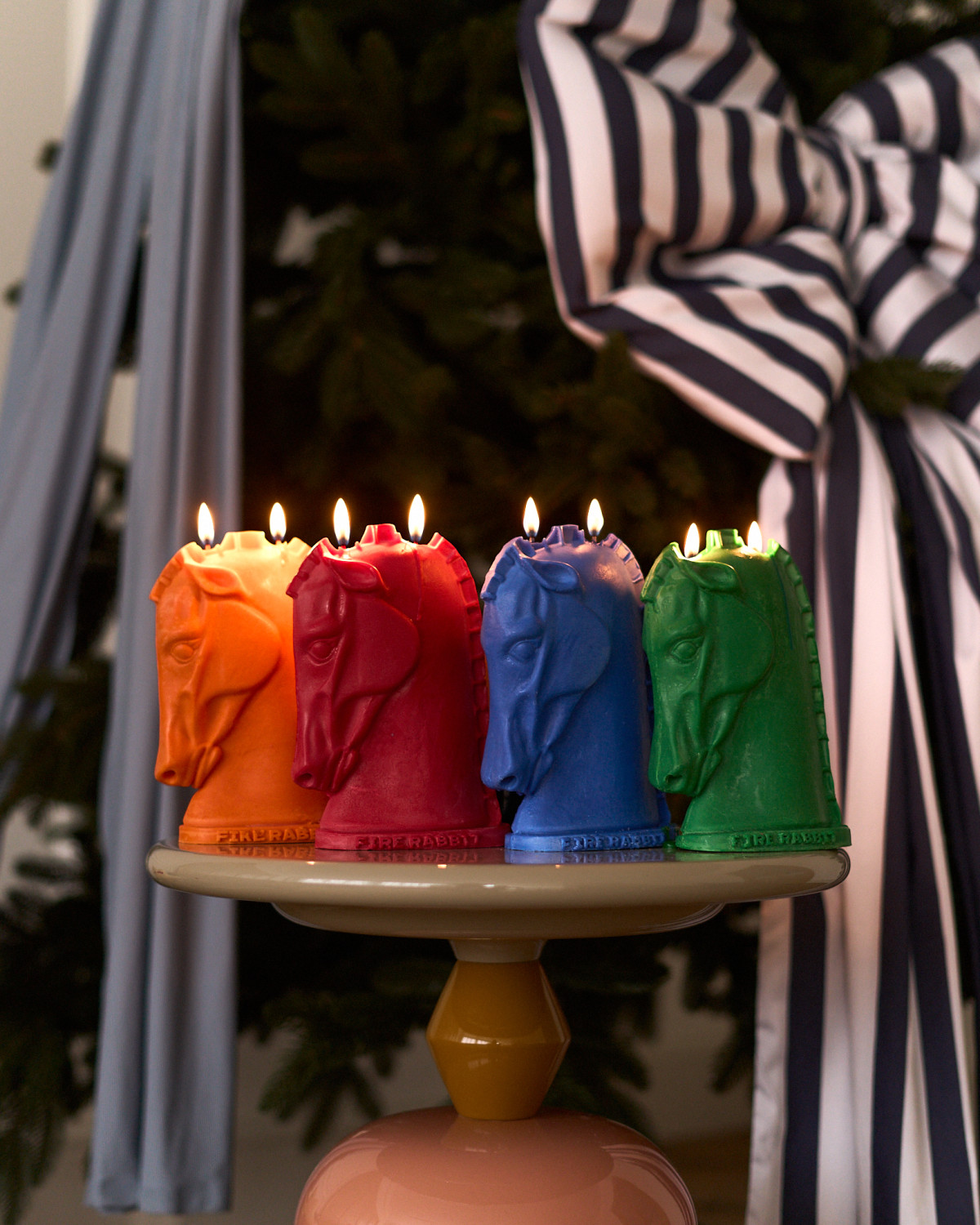 Центральним об’єктом святкової колекції свічок ручної роботи обрано Коня — символ прийдешнього року. У трактуванні Fire Rabbit це не шахова фігура в прямому сенсі, а гра з її образом. Об’ємна й чітка у своїй геометрії, форма втілює ідею ходу, який уже зроблено — свідомо та впевнено. Свічка представлена у виразній палітрі: від смарагдово зеленого та глибокого синього до насиченого червоного та помаранчевого. Такий Кінь виходить за рамки звичного декоративного елемента, перетворюючись на акцентний об’єкт, що формує атмосферу простору та задає йому енергійний настрій.