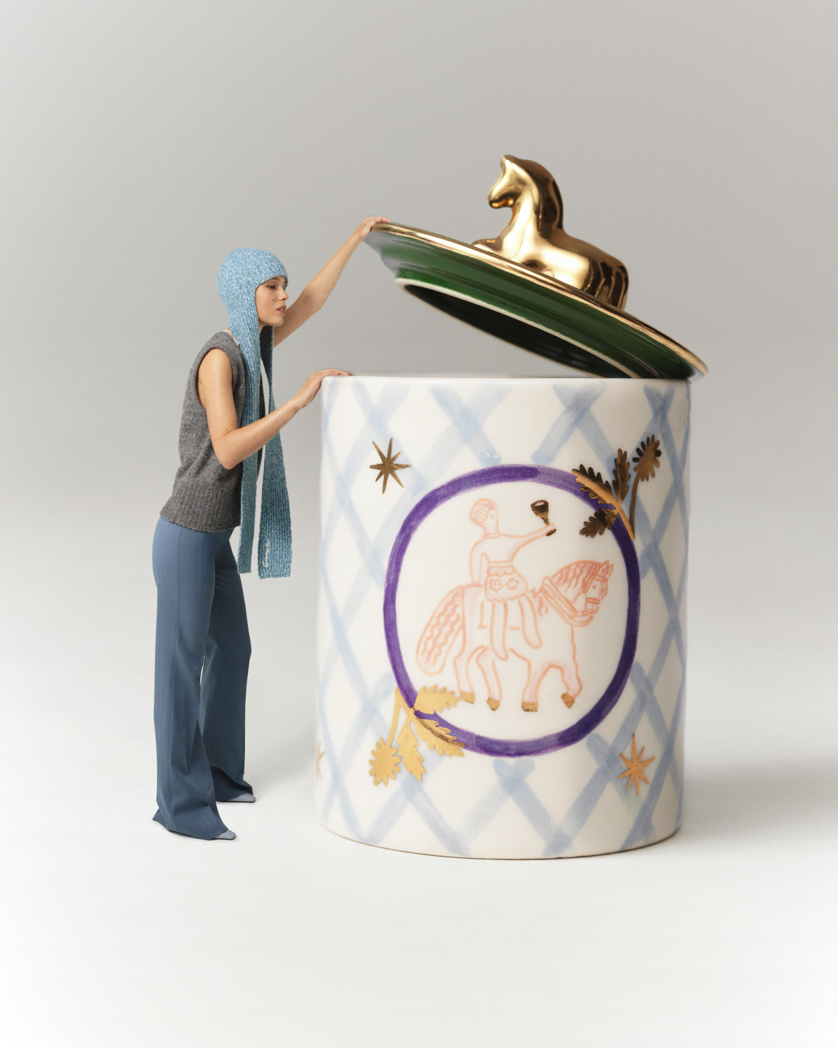 В колекції кераміки представлене розмаїття художніх тарілок, ємність для вина, цукорниці, чайники  й чашки з блюдцями нових форм, а маслянка та свічки переймають силует іграшки-коника. Вироби  виконані та розписані вручну у мʼякій палітрі, з яскравими акцентами та позолотою, як візуалізація  святкового настрою й оптимізму.
