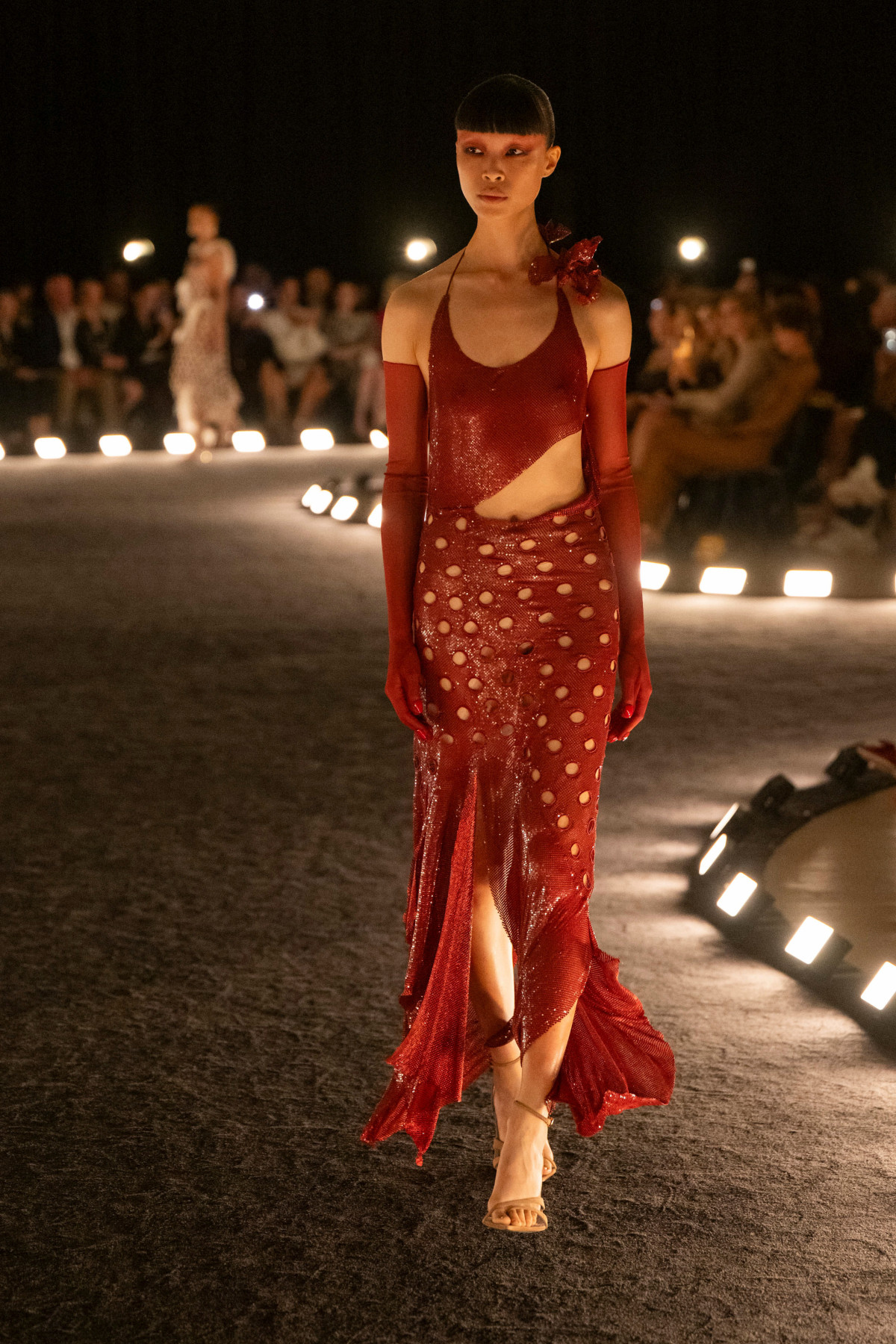 Архівні коди бренду також отримали нове прочитання: легендарна сукня «Сльози», створена у 1938 році, була переосмислена у 3D-версії, а вирізи стали не лише декоративним прийомом, а й знаком поваги до ДНК бренду. Окрім цього, Розберрі відмовився від жорстких корсетів і надмірного блиску — натомість він презентував м’які драпіровки та природні силуети, які підкреслюють вигини жіночого тіла.