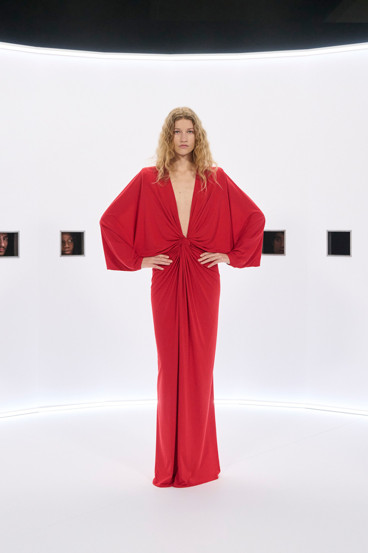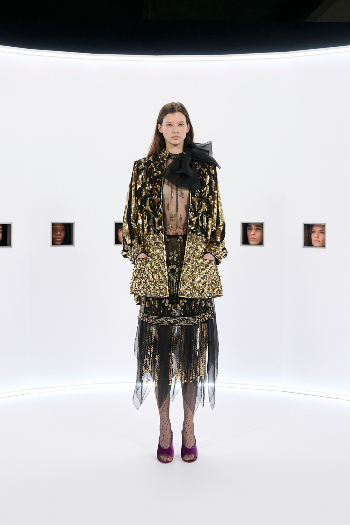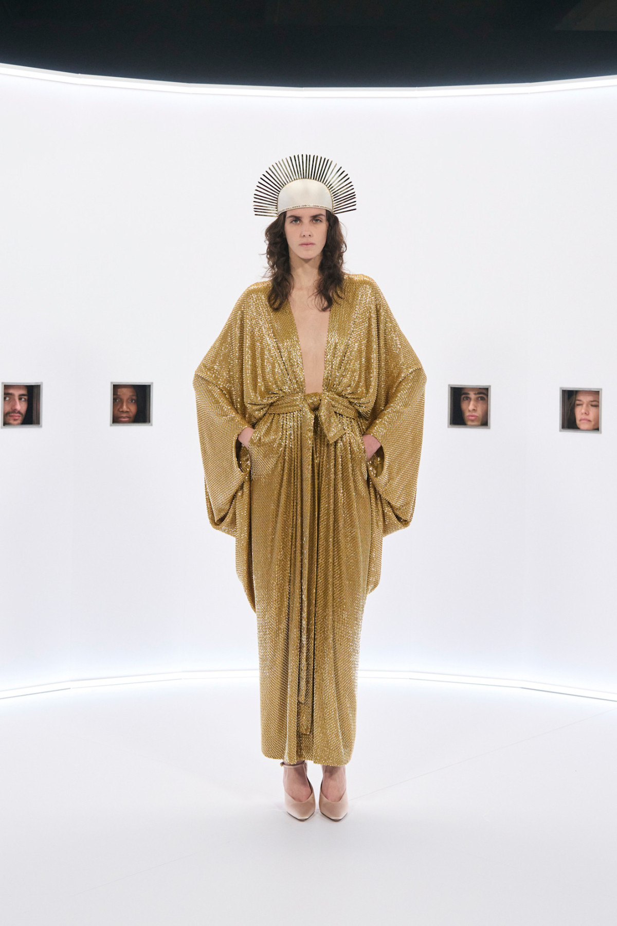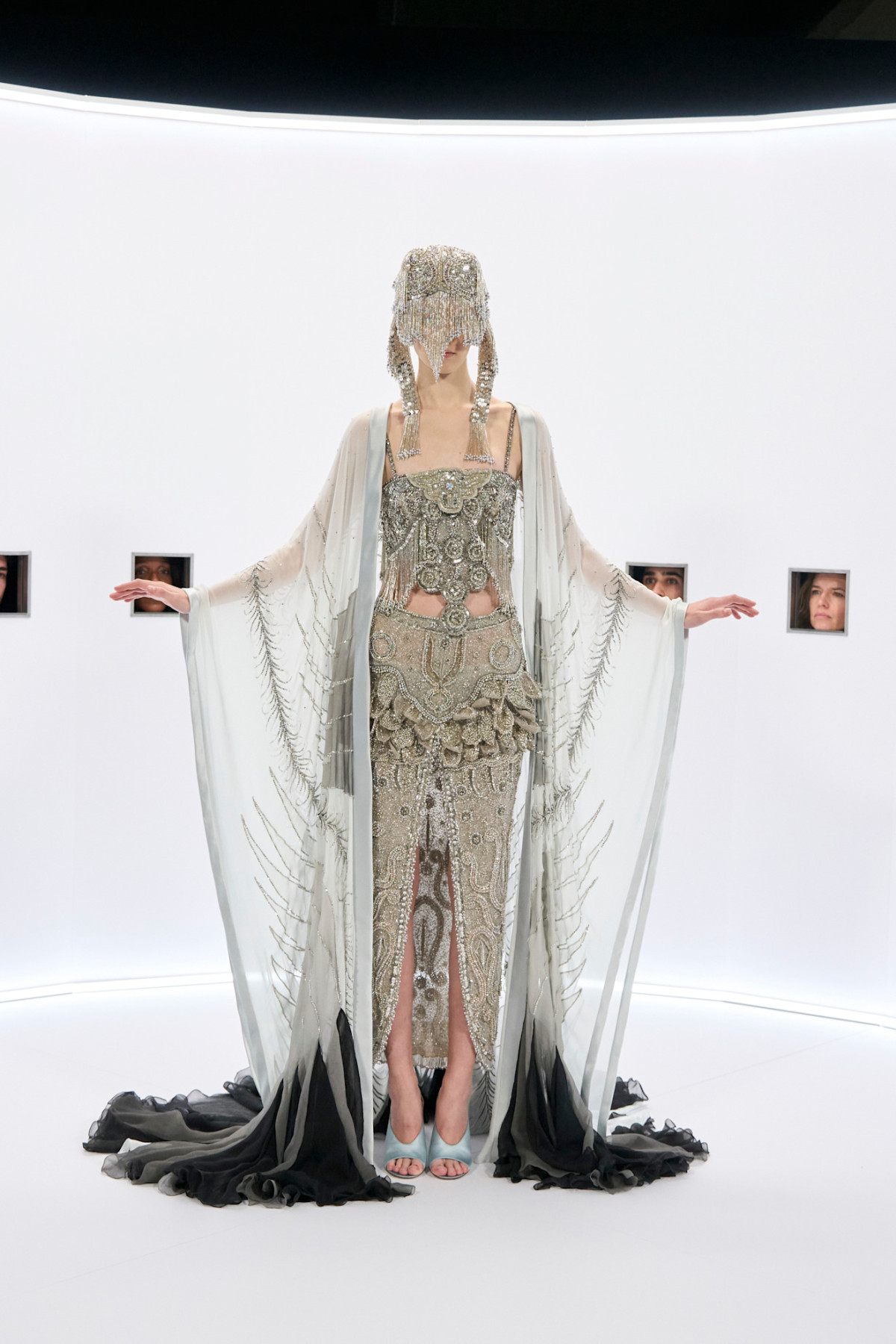 У самій колекції Мікеле залишився вірним власному почерку, але адаптував його до вимог couture. Складні образи, насичена декоративність, увага до символіки — усе це було подано стриманіше й зосереджено на майстерності ательє. Ключову роль відігравали текстильні рішення, ручна вишивка, робота з бісером і стеклярусом, а також багатошарові конструкції, які підкреслювали статус кожного образу як унікального виробу.