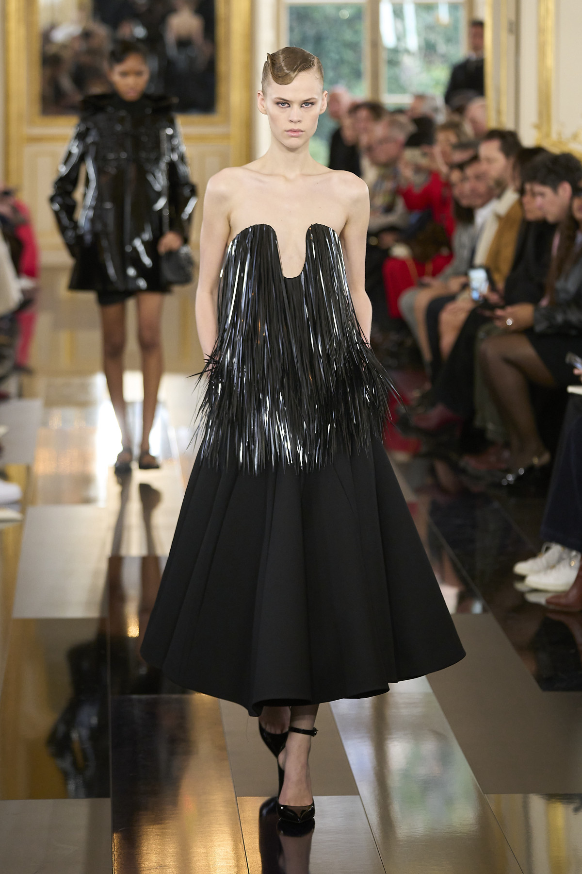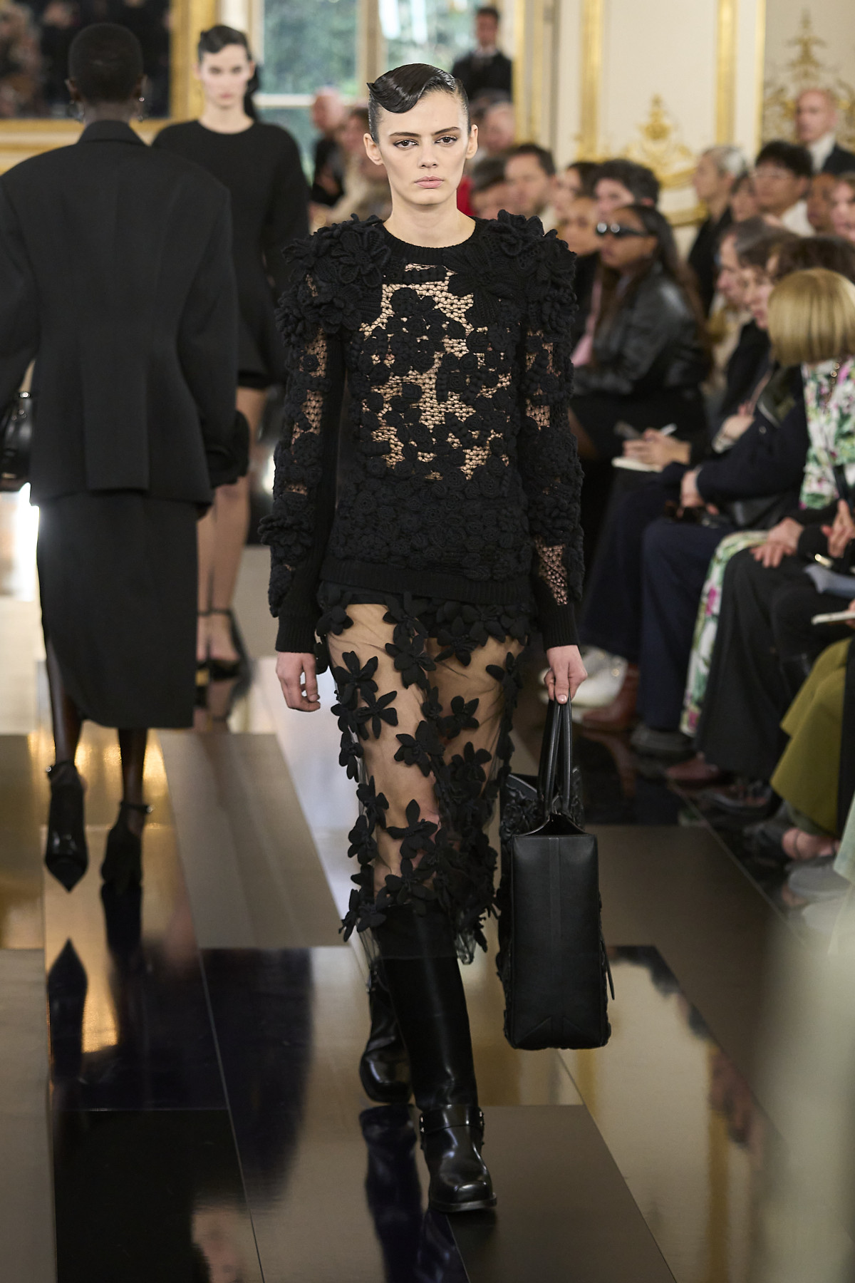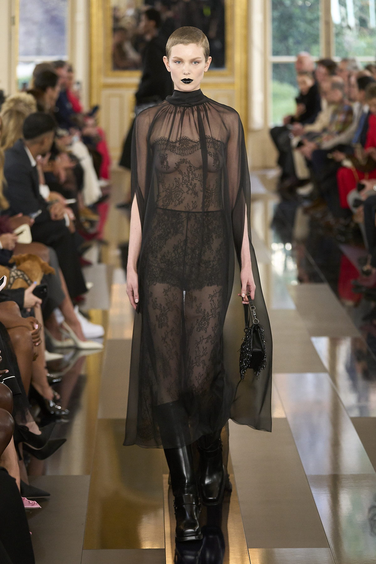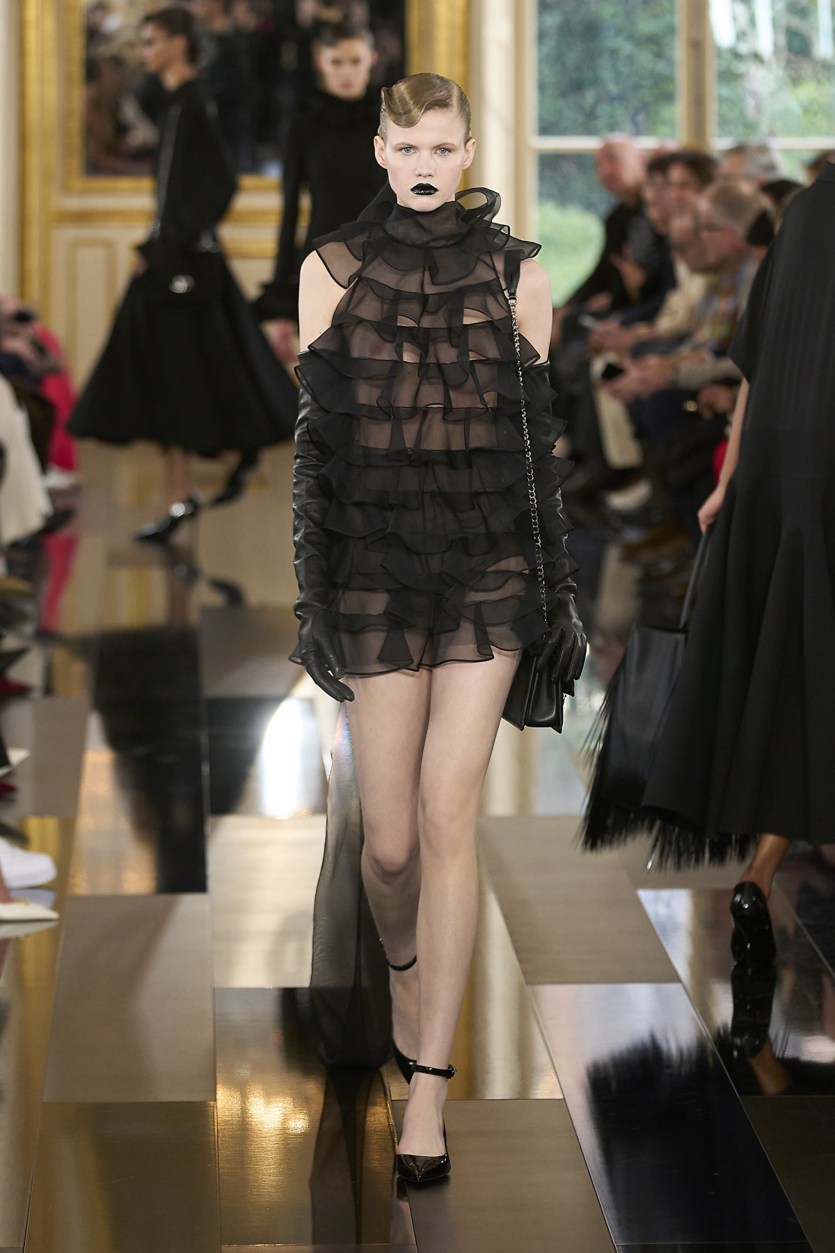 Замість того, щоб робити акценти на тонах, дизайнер зосередився на формах, силуетах і текстурах. Подіумом крокували моделі в коротких сукнях із довгими рукавами, доповненими об’ємними деталями у вигляді квітів; у варіантах довжини максі з вирізами, пір’ям чи бахромою і в оверсайз-худі, що поєднувалися зі спідницями. Також серед суконь особливу увагу варто приділити прозорим елементам з оборками, драпіруванням, мереживом і стразами. Верхній одяг представили лаковані куртки та довгі лаконічні пальта. В аксесуарах П’єрпаоло Піччолі зосередився на лакованих клатчах і сумках, доповнених бахромою та флористичними мотивами, ременях, довгих шкіряних рукавичках і сережках різних геометричних форм. Від чорного відтінку не відходили навіть у макіяжі: більшість моделей крокували з темною помадою на вустах.
