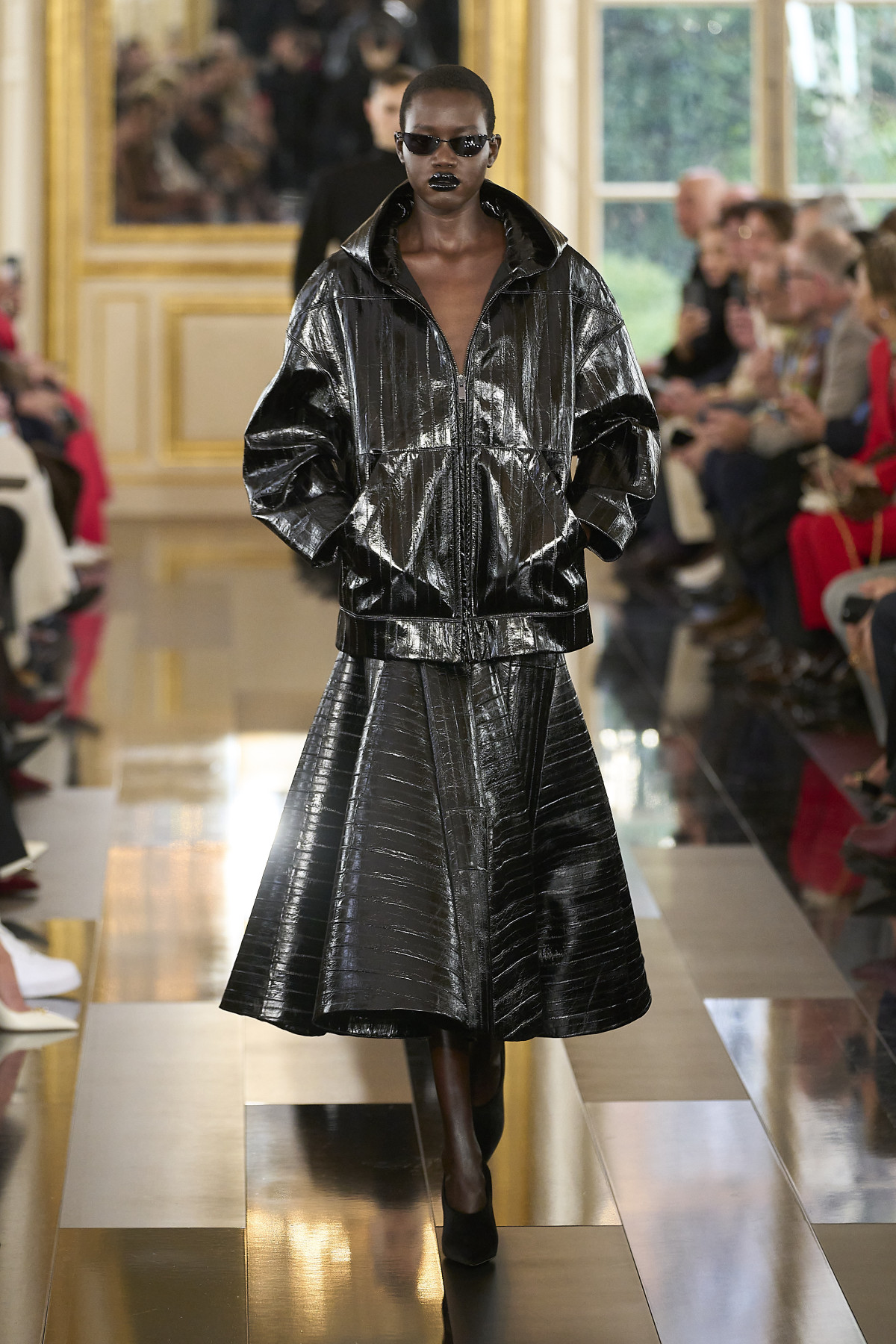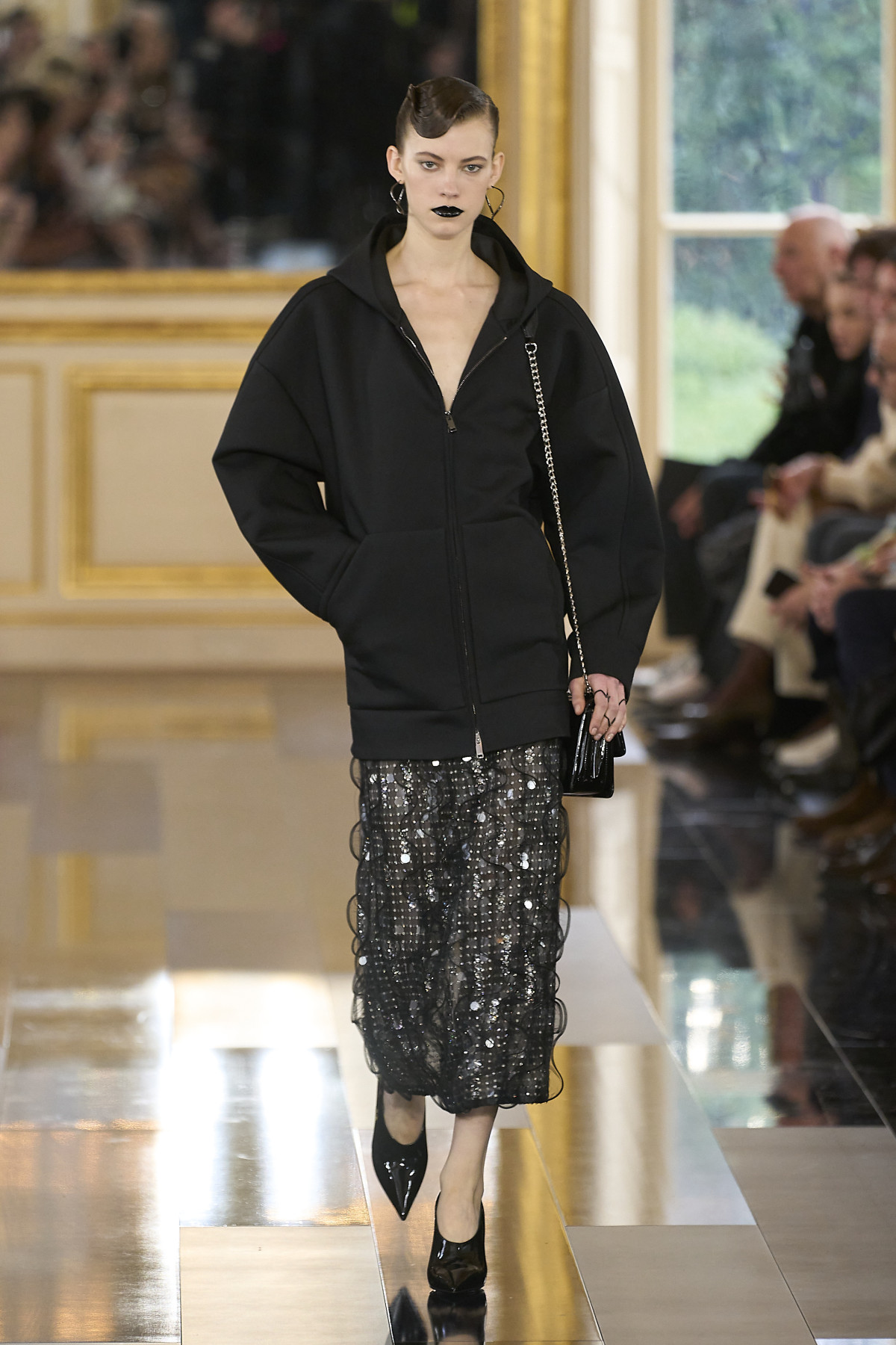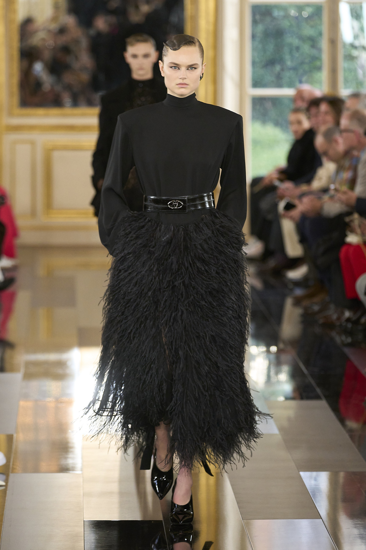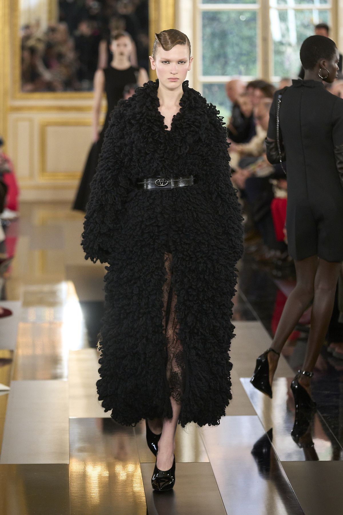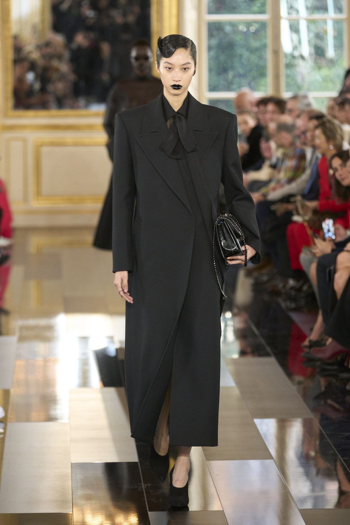 Замість того, щоб робити акценти на тонах, дизайнер зосередився на формах, силуетах і текстурах. Подіумом крокували моделі в коротких сукнях із довгими рукавами, доповненими об’ємними деталями у вигляді квітів; у варіантах довжини максі з вирізами, пір’ям чи бахромою і в оверсайз-худі, що поєднувалися зі спідницями. Також серед суконь особливу увагу варто приділити прозорим елементам з оборками, драпіруванням, мереживом і стразами. Верхній одяг представили лаковані куртки та довгі лаконічні пальта. В аксесуарах П’єрпаоло Піччолі зосередився на лакованих клатчах і сумках, доповнених бахромою та флористичними мотивами, ременях, довгих шкіряних рукавичках і сережках різних геометричних форм. Від чорного відтінку не відходили навіть у макіяжі: більшість моделей крокували з темною помадою на вустах.