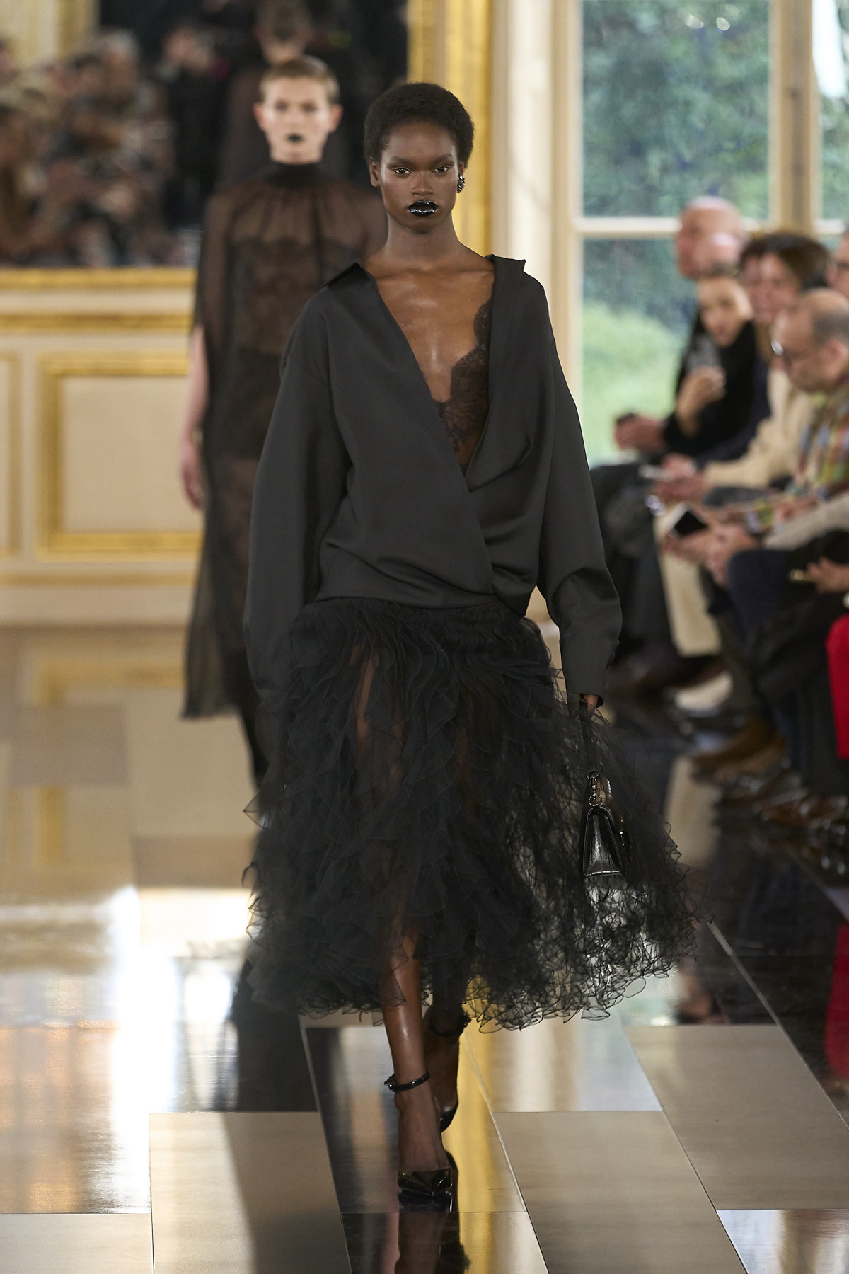 Замість того, щоб робити акценти на тонах, дизайнер зосередився на формах, силуетах і текстурах. Подіумом крокували моделі в коротких сукнях із довгими рукавами, доповненими об’ємними деталями у вигляді квітів; у варіантах довжини максі з вирізами, пір’ям чи бахромою і в оверсайз-худі, що поєднувалися зі спідницями. Також серед суконь особливу увагу варто приділити прозорим елементам з оборками, драпіруванням, мереживом і стразами. Верхній одяг представили лаковані куртки та довгі лаконічні пальта. В аксесуарах П’єрпаоло Піччолі зосередився на лакованих клатчах і сумках, доповнених бахромою та флористичними мотивами, ременях, довгих шкіряних рукавичках і сережках різних геометричних форм. Від чорного відтінку не відходили навіть у макіяжі: більшість моделей крокували з темною помадою на вустах.