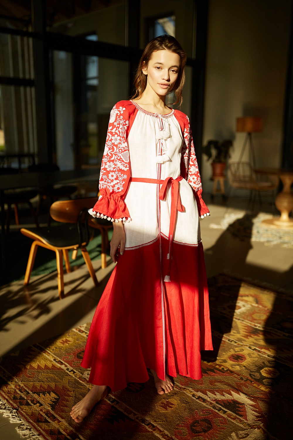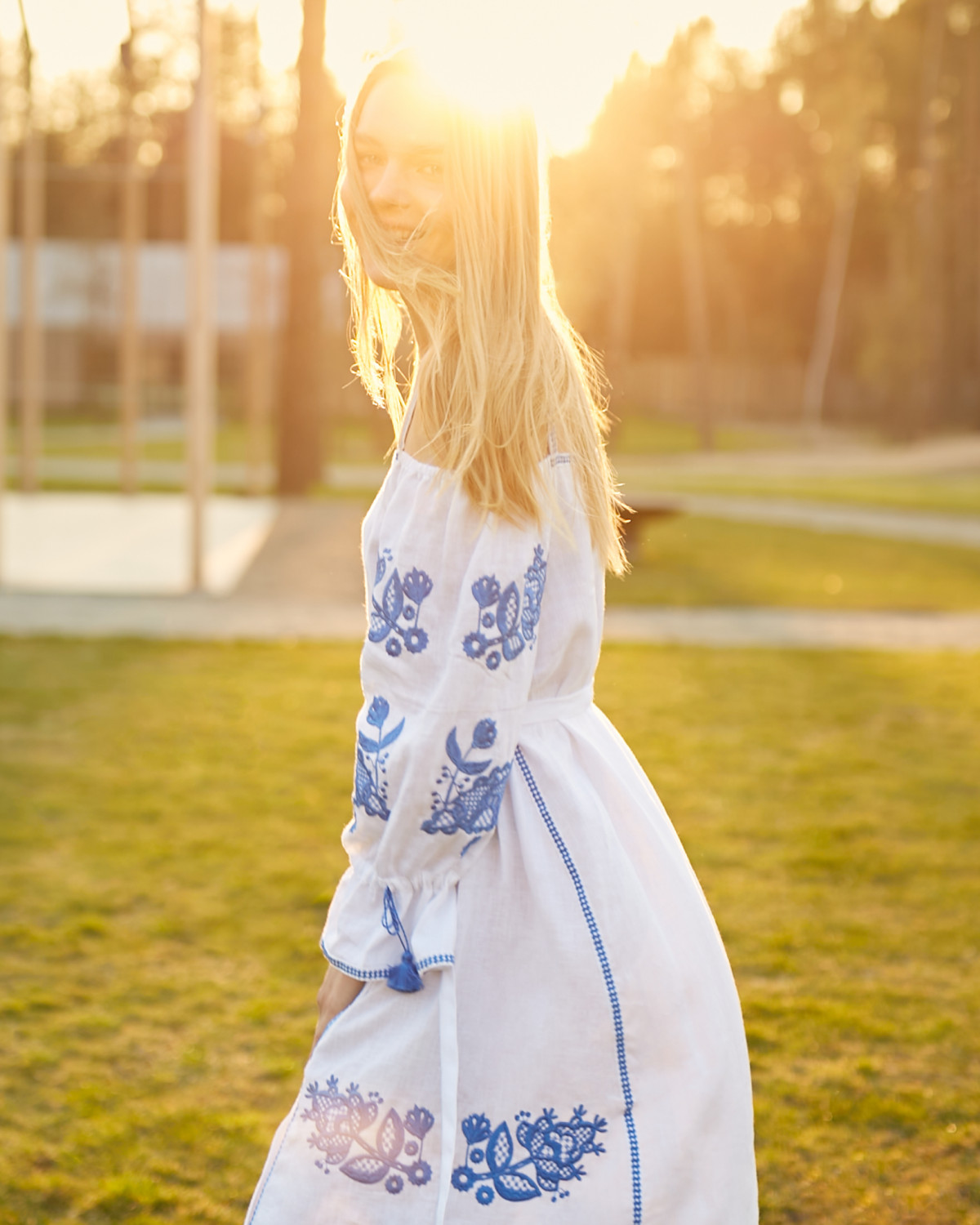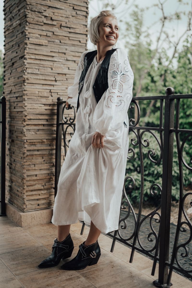 Я предлагаю носить вышиванки с ботинками, сабо, кедами. Мое любимое комбо — утонченные минималистичные босоножки и женственная льняная вышиванка. Еще люблю сочетать легкие платья-вышиванки с косухой.