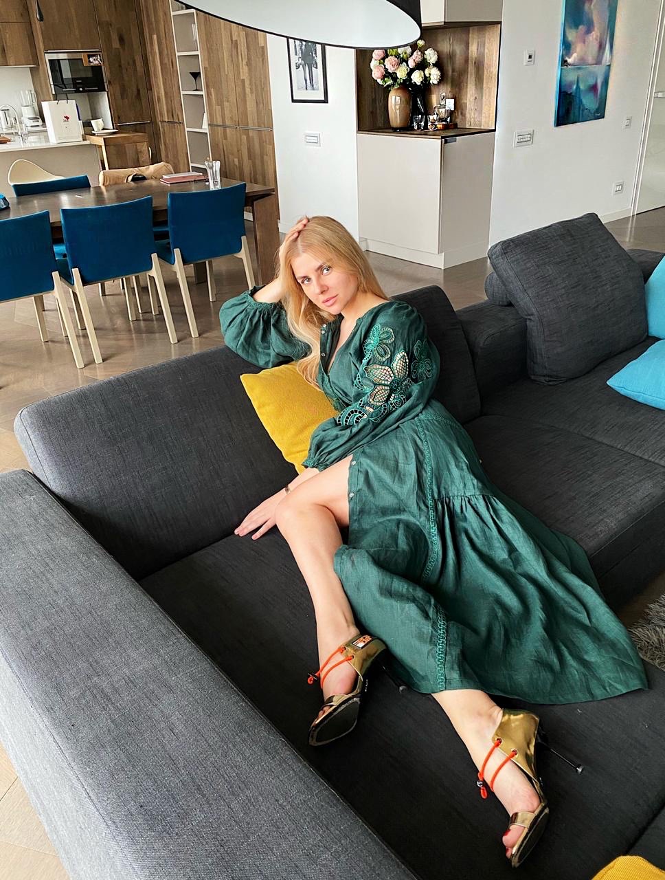 С вышиванками у меня давняя любовь, в моем гардеробе их очень много. В этом сезоне рекомендую носить бохо-платья и сорочки с сандалиями в греческом стиле. Их можно накидывать поверх одежды. Еще один тренд сезона — мой любимый изумрудный цвет.