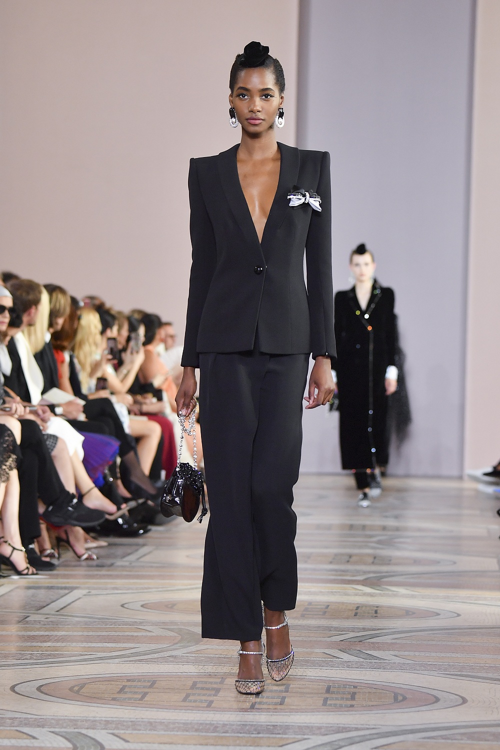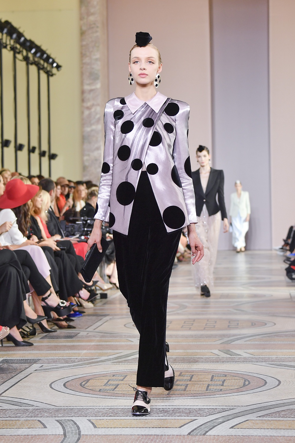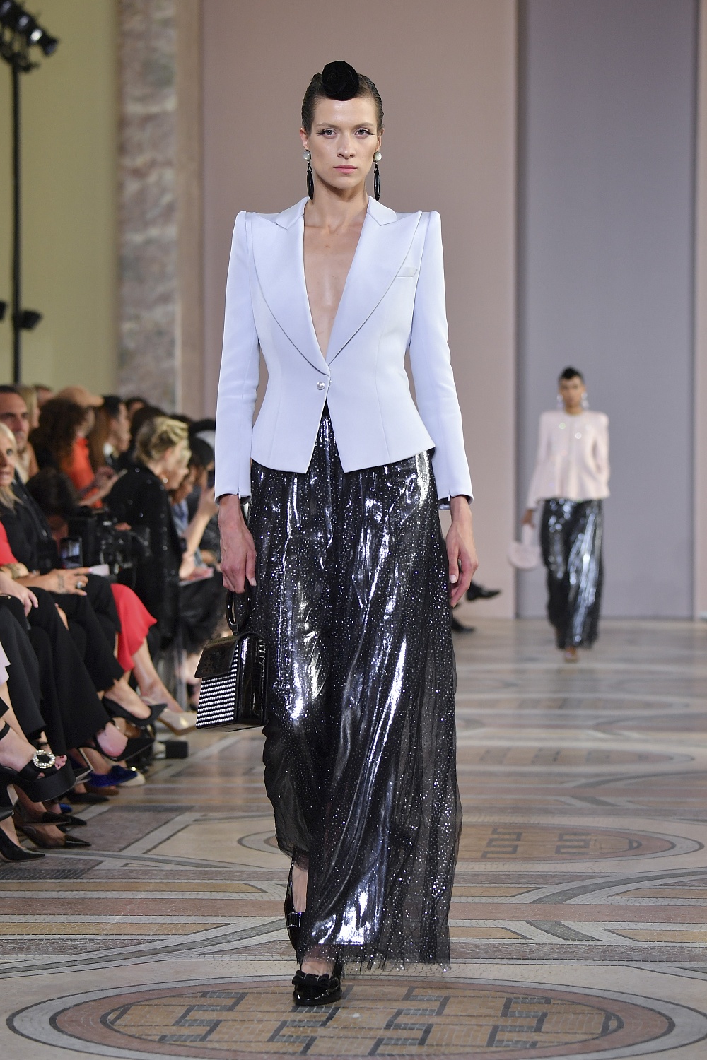 При этом бренд остался верным своему ДНК и представил на суд публики новую линейку приталенных жакетов и платьев в пайетках.