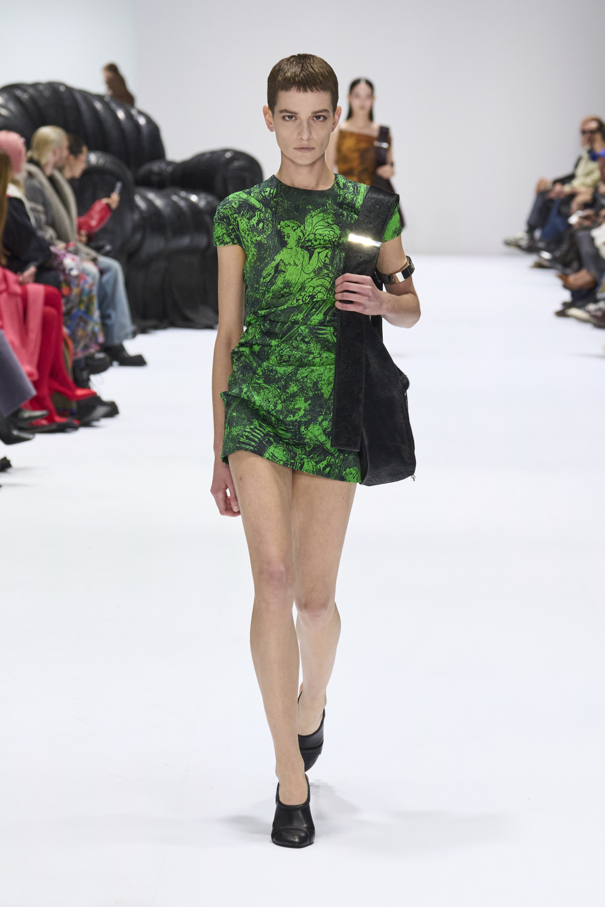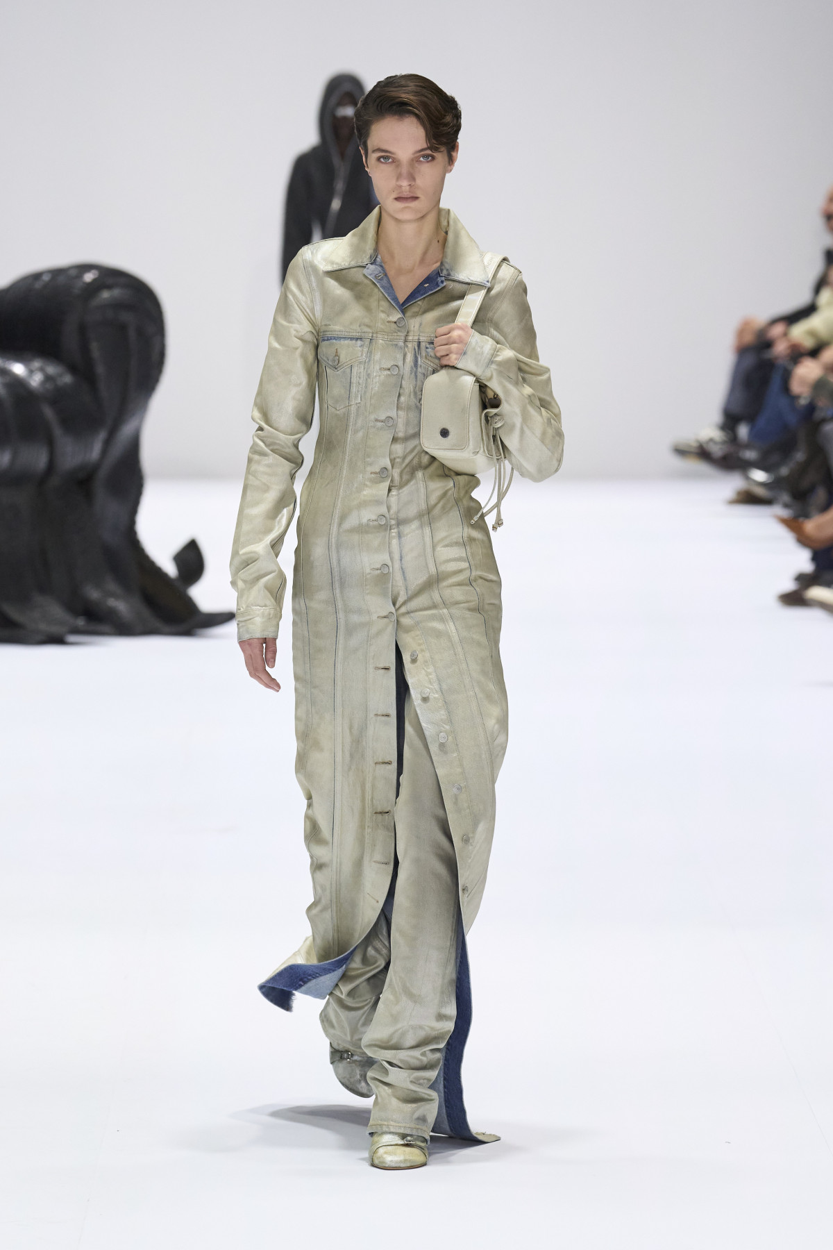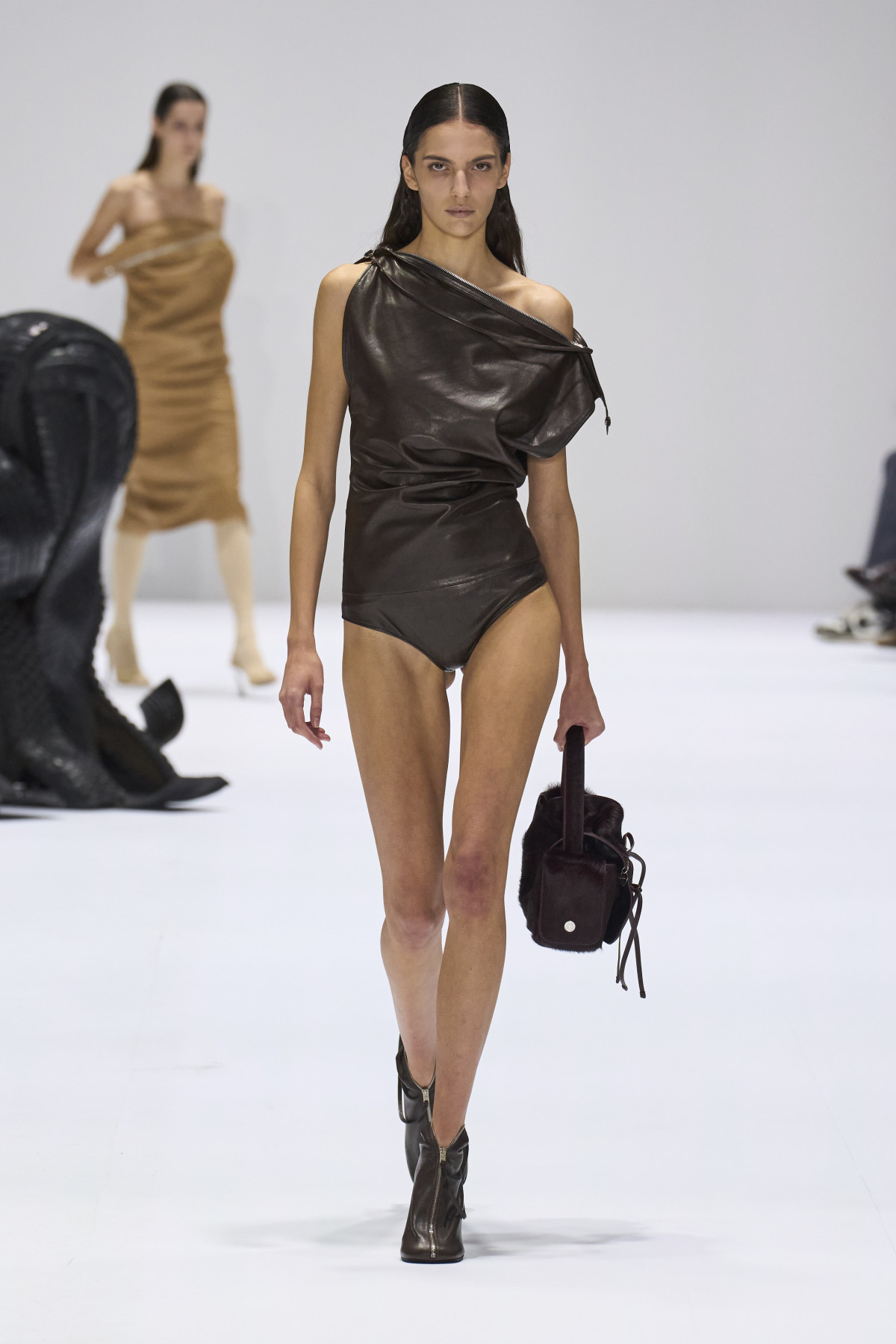 Відкрили шоу скульптурні шкіряні мінісукні з коміром-стійкою та формованими чашечками на ліфі, які підкреслено виділяли талію і збільшували стегна; обтислі комбінезони та боді. Згодом шкіра перейшла й на моделі з драпіруванням — спідниці й сукні міді з деталями у вигляді застібок. Денім же у цій колекції прозирав на комірцях, штанах та аксесуарах. Джонні Йоханссон також вдався до техніки trompe l`œil, представивши образи, що здалеку здавалися немовби виготовленими з темної та світлої джинсової тканини, однак зблизька виявлялися шкіряними.