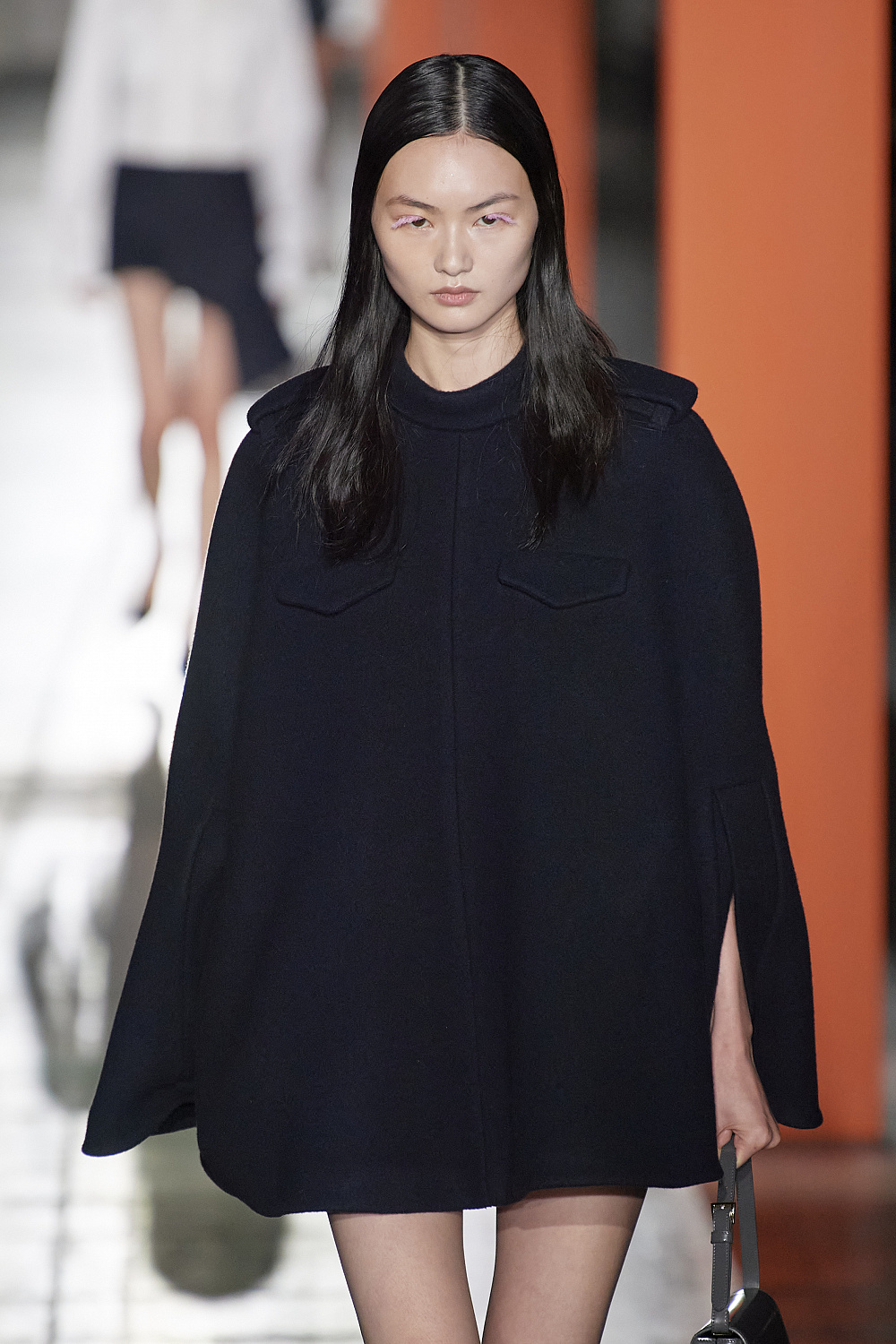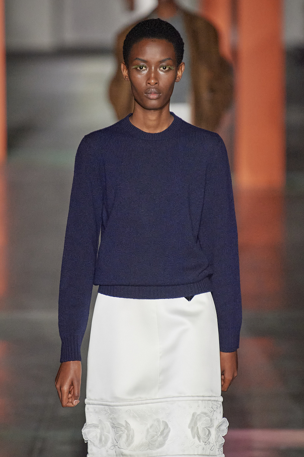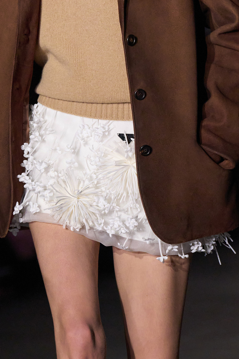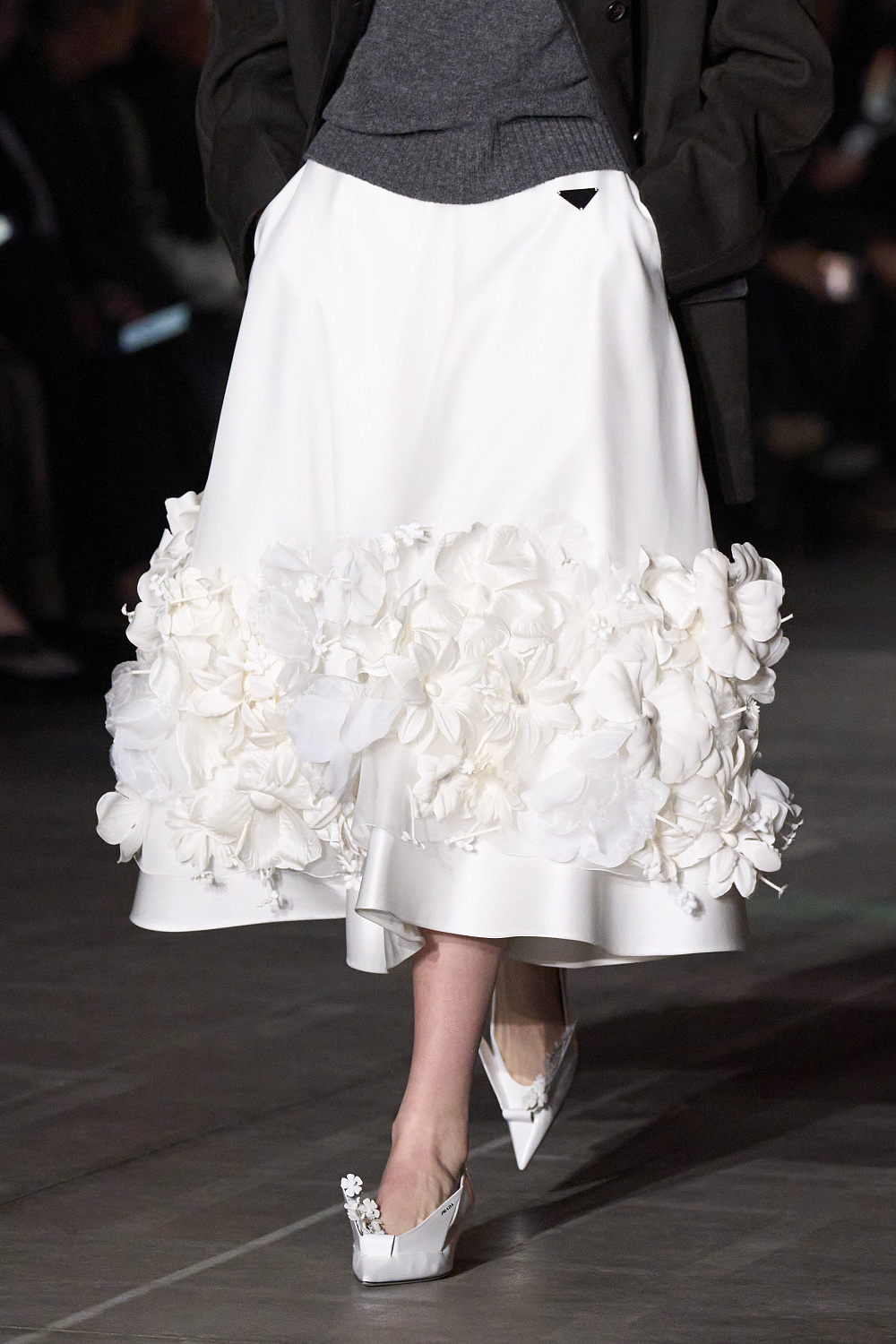 Найзнаковіші речі з осінньо-зимової колекції Prada: спідниці з квітами, деталлю, яку творчий дует Рафа Сімонза та Міуччі Прада вирішив залишити з попереднього сезону; додаткові комірці на жакетах, кардиганом і пальтах, часто акцентного кольору; сорочки, спідниці та жакети, виконані в офісному стилі. Ще одна цікава деталь — маленька краватка у тон сорочці.