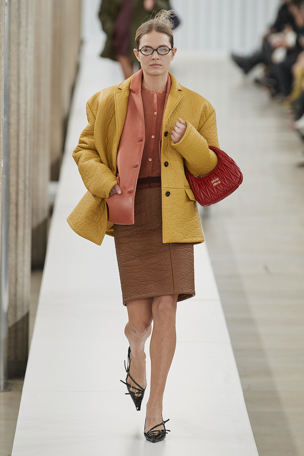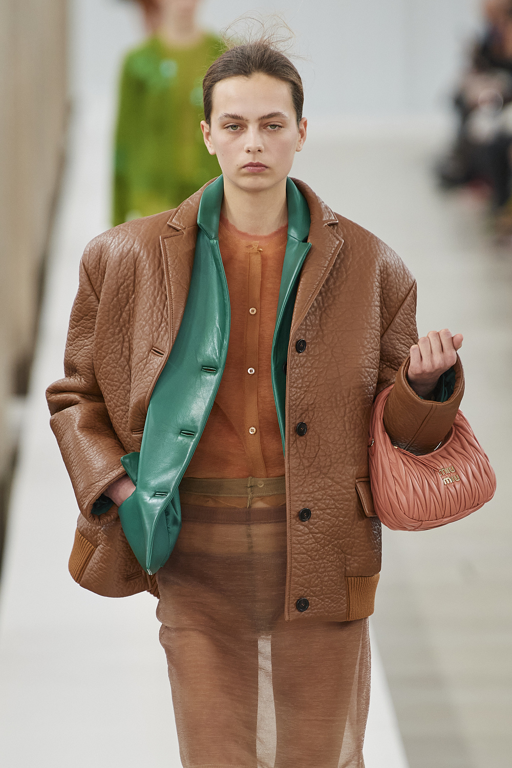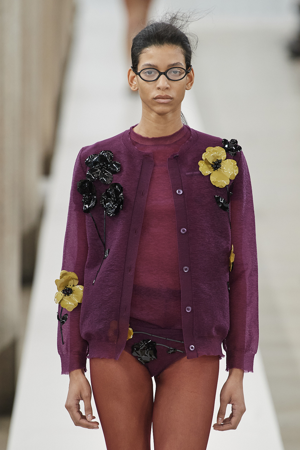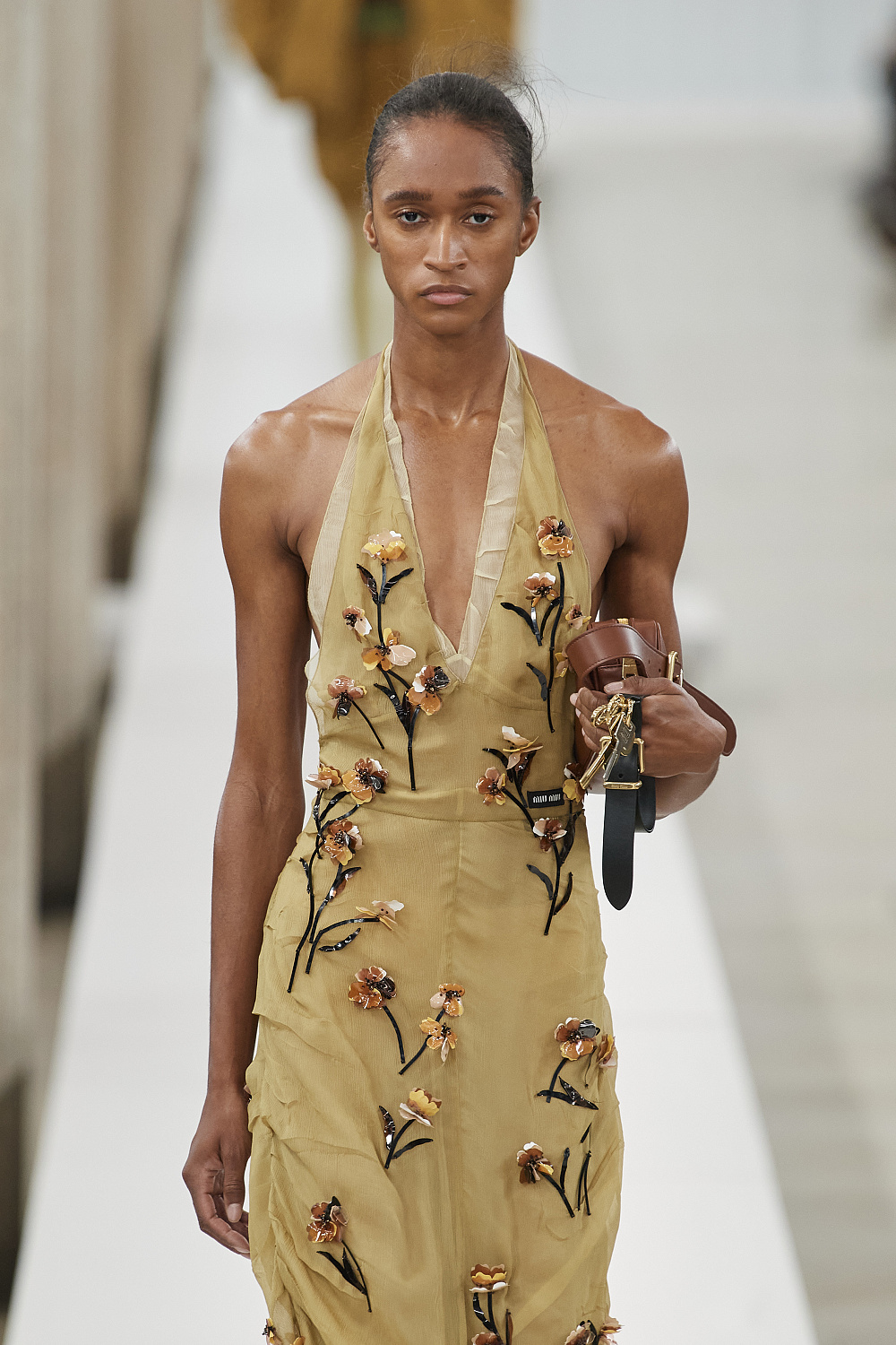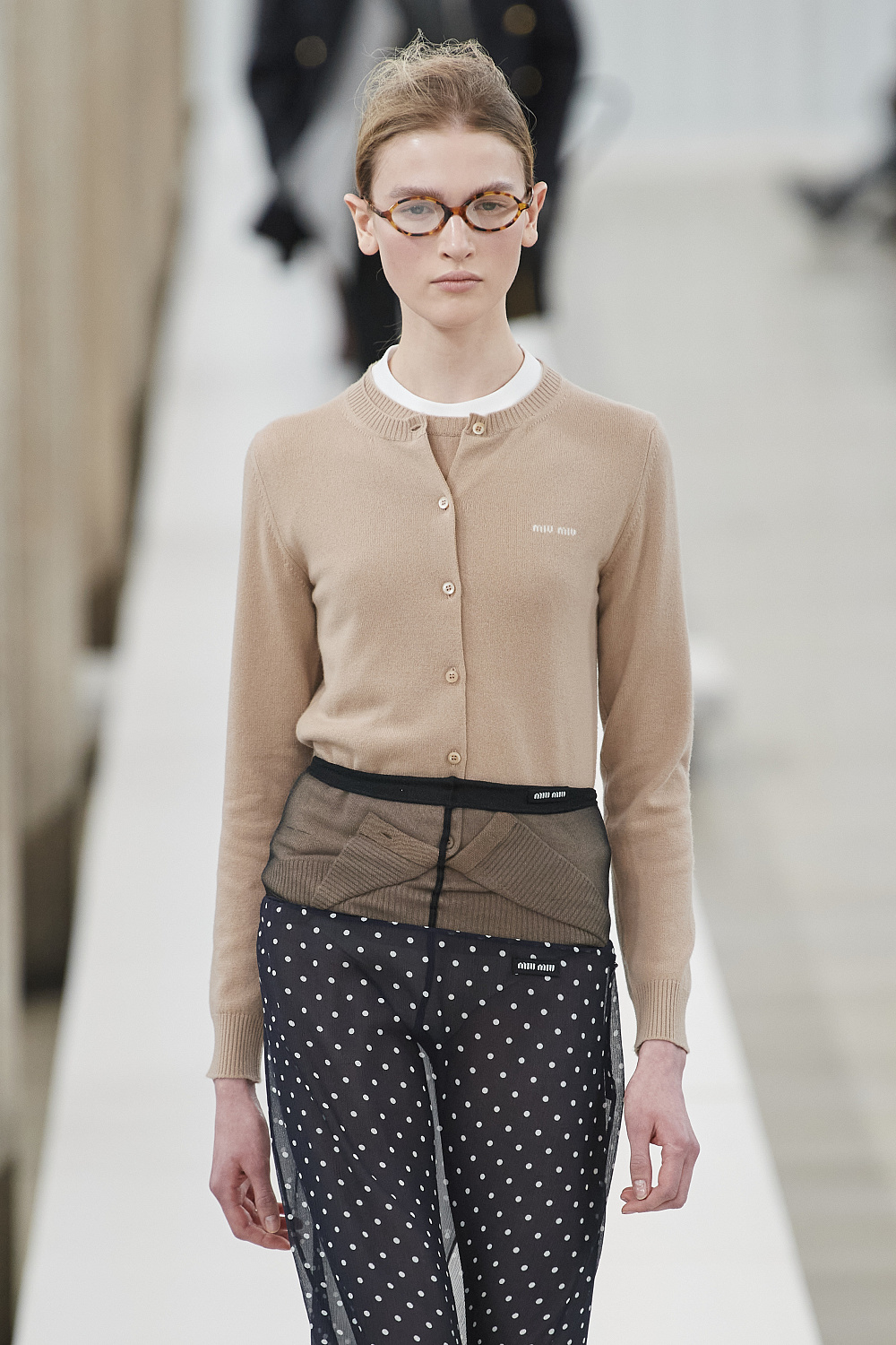 Показ Miu Miu у чомусь був також про офісний стиль: спідниці-олівці, ділові штани на низькій посадці, тоненькі кардигани тощо. Однак значно більше на подіумі виділялися прозорі тканини на топах, сукнях, спідницях і шортах, трендові луки «без низу», окуляри, що нагадують ті, які носила Керолін Бессетт-Кеннеді, сумка-хобо, яку полюбили всі зірки streetstyle. Звісно, колекція не обійшлася без квітів, фактур, багатошаровості та блискіток.
