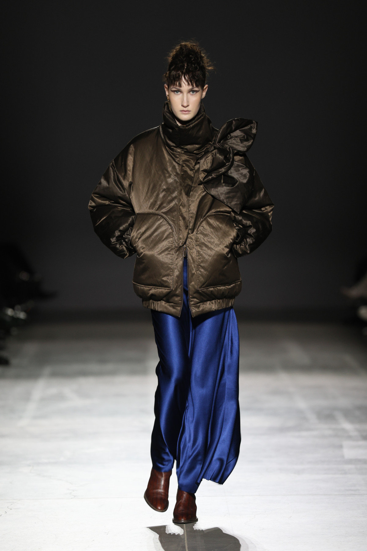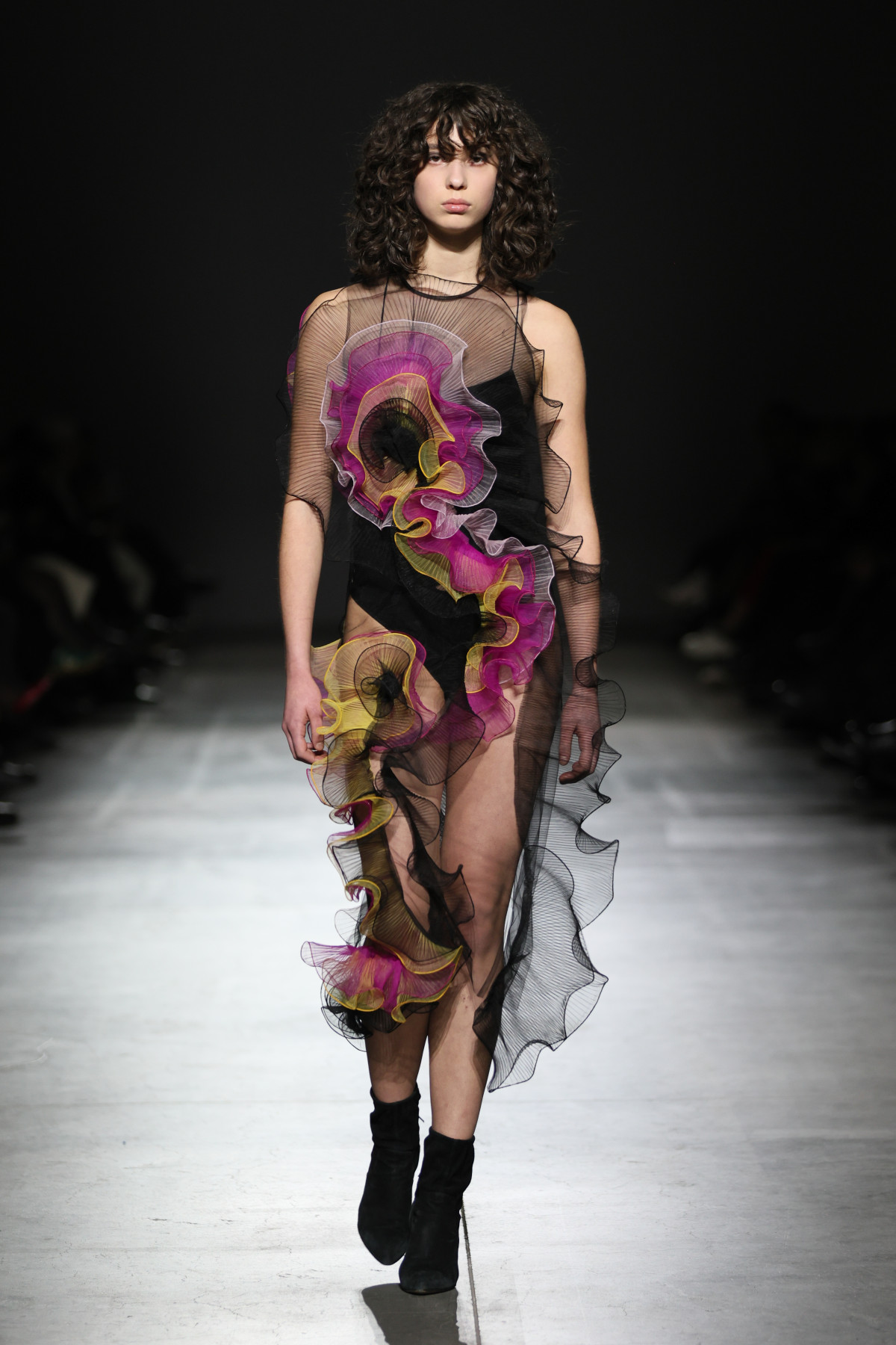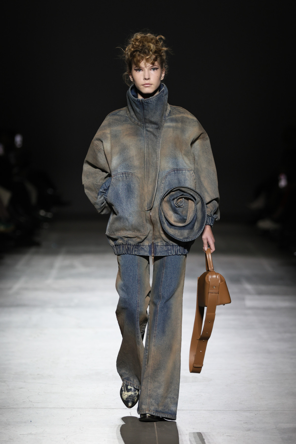 Дизайнерка переосмислила складники ДНК бренду: прозорі та структуровані моделі поєднувалися з твідом та вовною, а мінісукні з гіпюру контрастували із денімом, обробленим до іржаво-коричневого кольору. Бомбери з квітковими аплікаціями та асиметричні спідниці відсилали до гранжу, зберігаючи елегантні силуети. Інновації також торкнулися хвилястих форм, з’явившись у воланах зі щільних матеріалів.