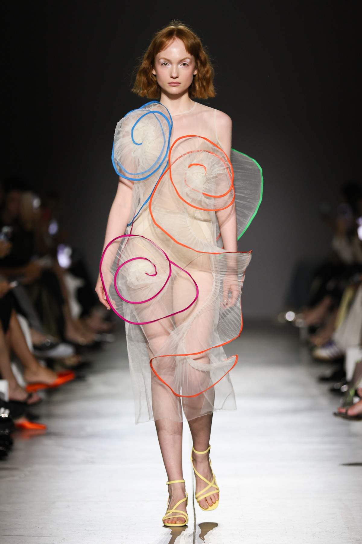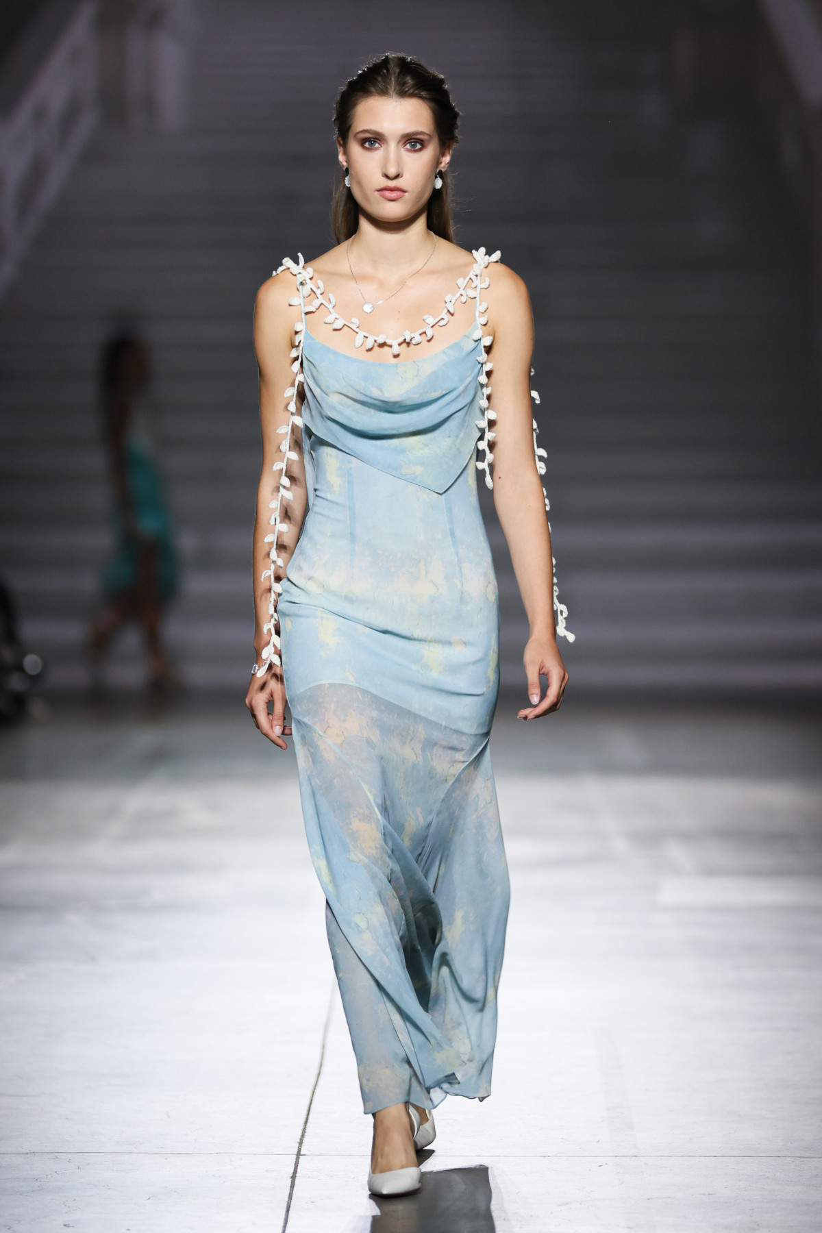 Силуетні форми — підкреслено легкі й невагомі, від приталених суконь з драпіруванням до більш об’ємних, що нагадують грецькі тоги та римські туніки. Кольори колекції також є відсиланнями до картин епохи Відродження — поєднання чорного, білого, коричневого із жовтим, рожевим та бірюзовим. У принтах та декорі вже традиційно Дар’я Донець використовує найрізноманітніші мушлі.