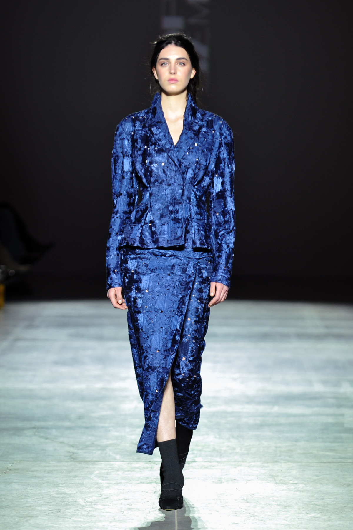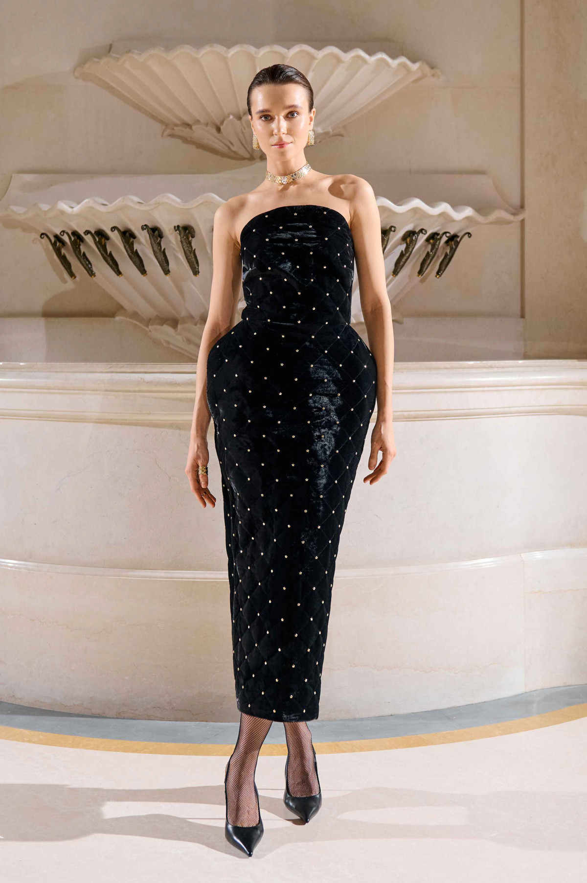 Важливу роль відіграють текстури: оксамит, стрази, стьобані візерунки та фактурні тканини. Палітра з чорного, айворі, та насиченого синього, доповнена металевими бусинами та деталями, що відбивають світло.