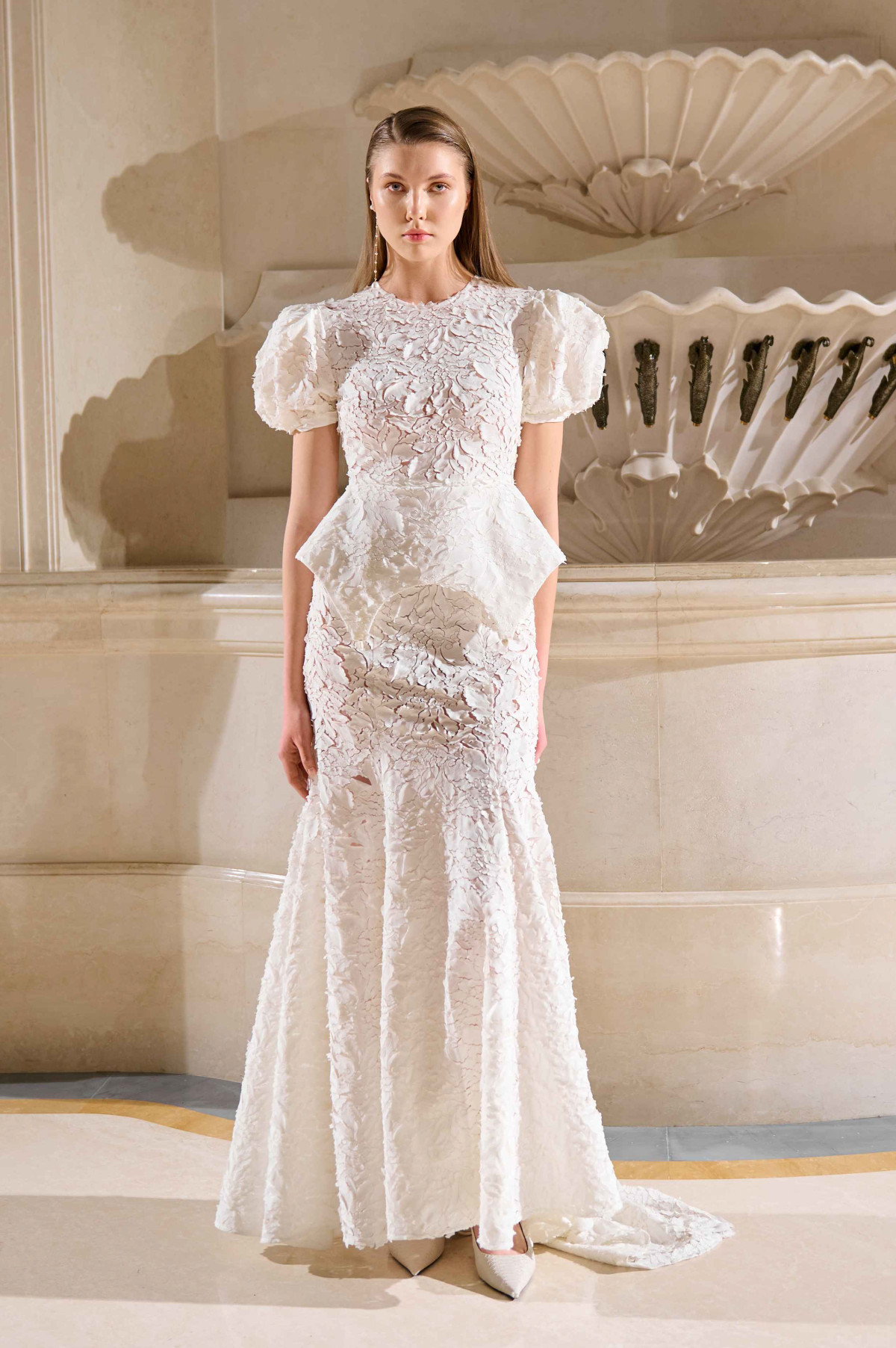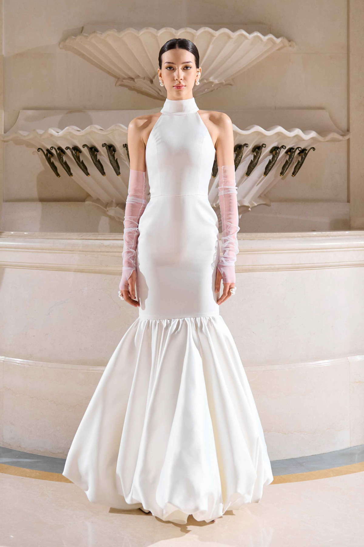 Ключовий образ колекції — максі-сукня кольору айворі з баскою з декоративними підв`язками.