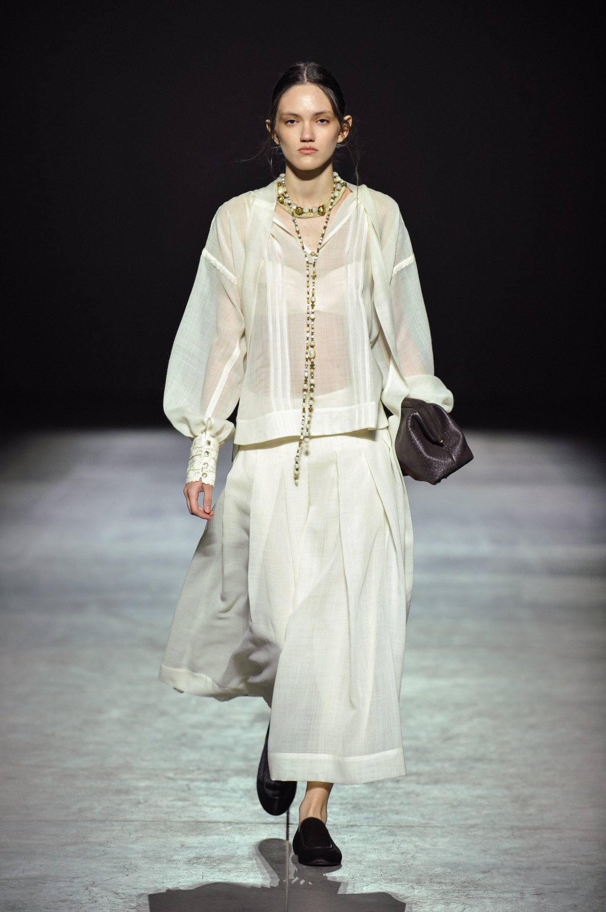 Палітра — відтінки бежевого, пудрового рожевого, блакитного, бузкового, оливкового, які структурує чорний. Фактурність стає однією з ключових тем колекції. Двошарова вовна й штучне хутро поєднуються з прозорими шифонами, шовком і органзою. Бавовна та віскоза додають практичності.