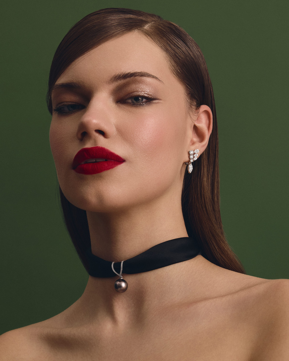 Перлини Таїті вирізняються природною темною палітрою — від графітового до глибокого зеленого з металевим відблиском. На відміну від класичних білих перлин, вони рідко бувають ідеально круглими, що лише підвищує їхню колекційну цінність. Поєднання перлини з шовковою стрічкою відсилає до історичних прикрас початку ХХ століття, коли коштовні камені часто носили максимально невимушено.