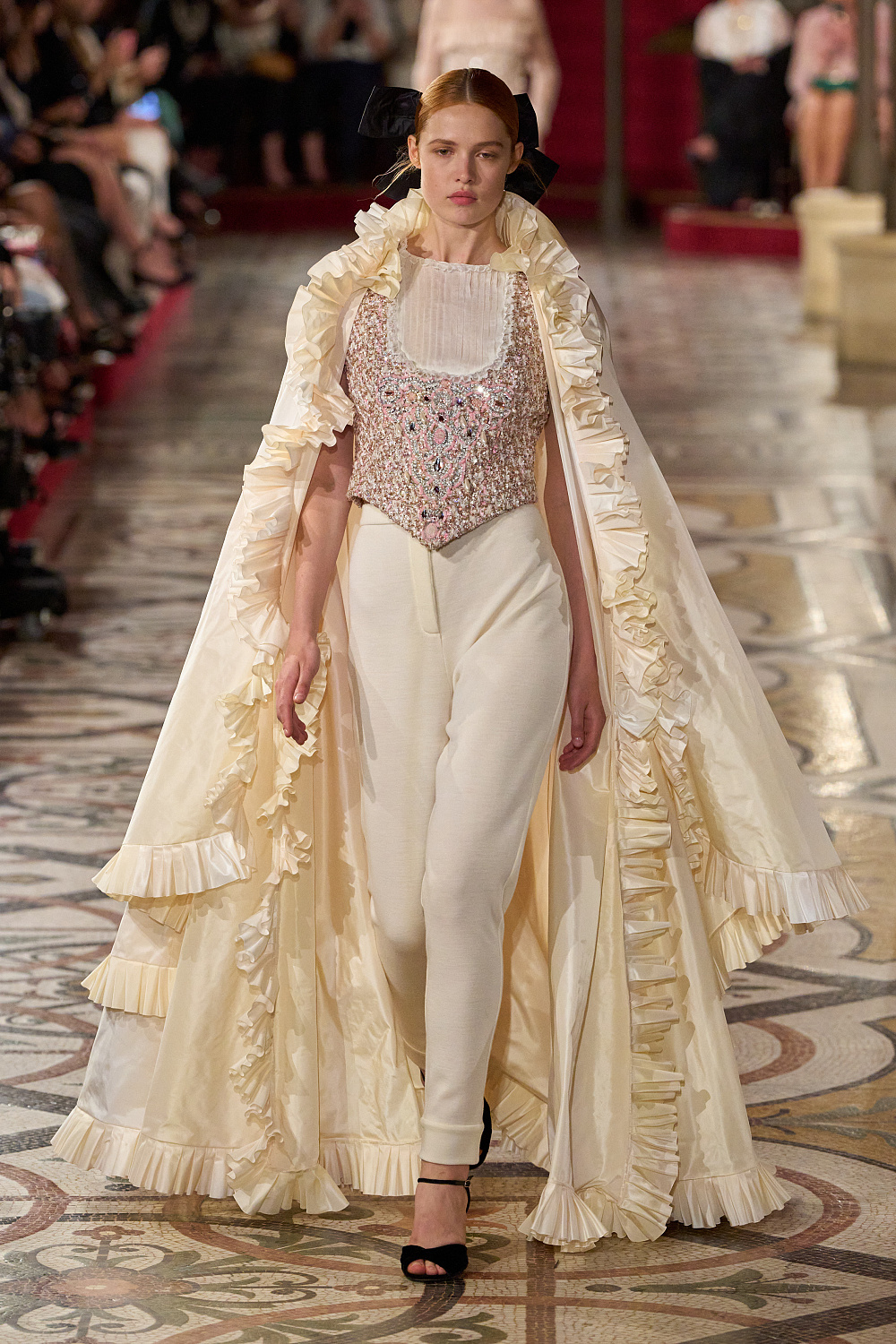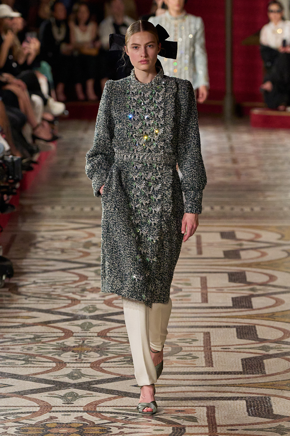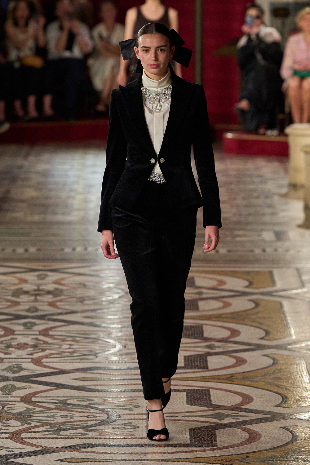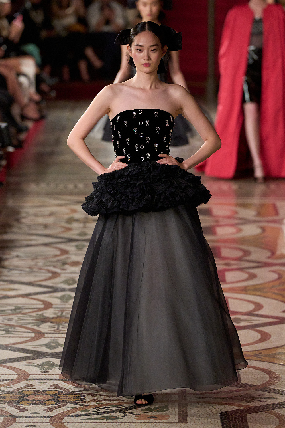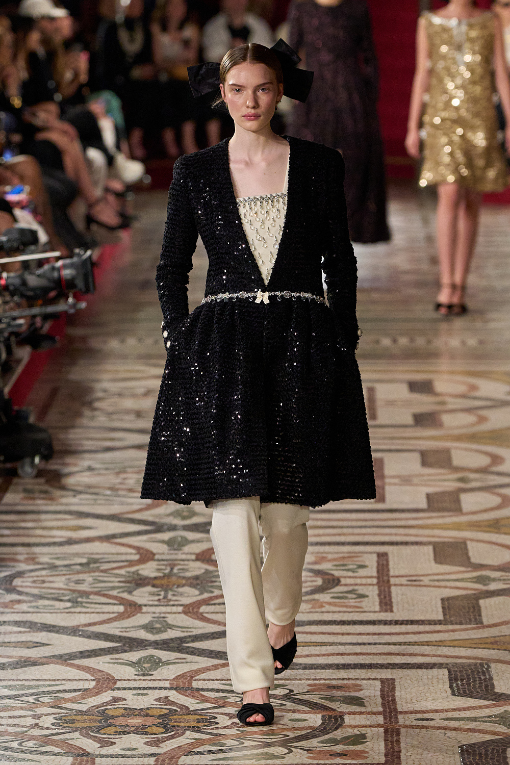 Першою на подіум вийшла Вітторія Черетті в довгому драматичному плащі з об’ємними рукавами та високим коміром з рюшами. Крім цього, були представлені чорні оксамитові смокінги, напівпрозорі сукні з сяйливими деталями, бальні моделі та вже класичні твідові комплекти. Завершив показ традиційно весільний образ, що складався з довгої молочної сукні з рукавами-буфами, корсетом, розшитим квітами, та пишною спідницею.