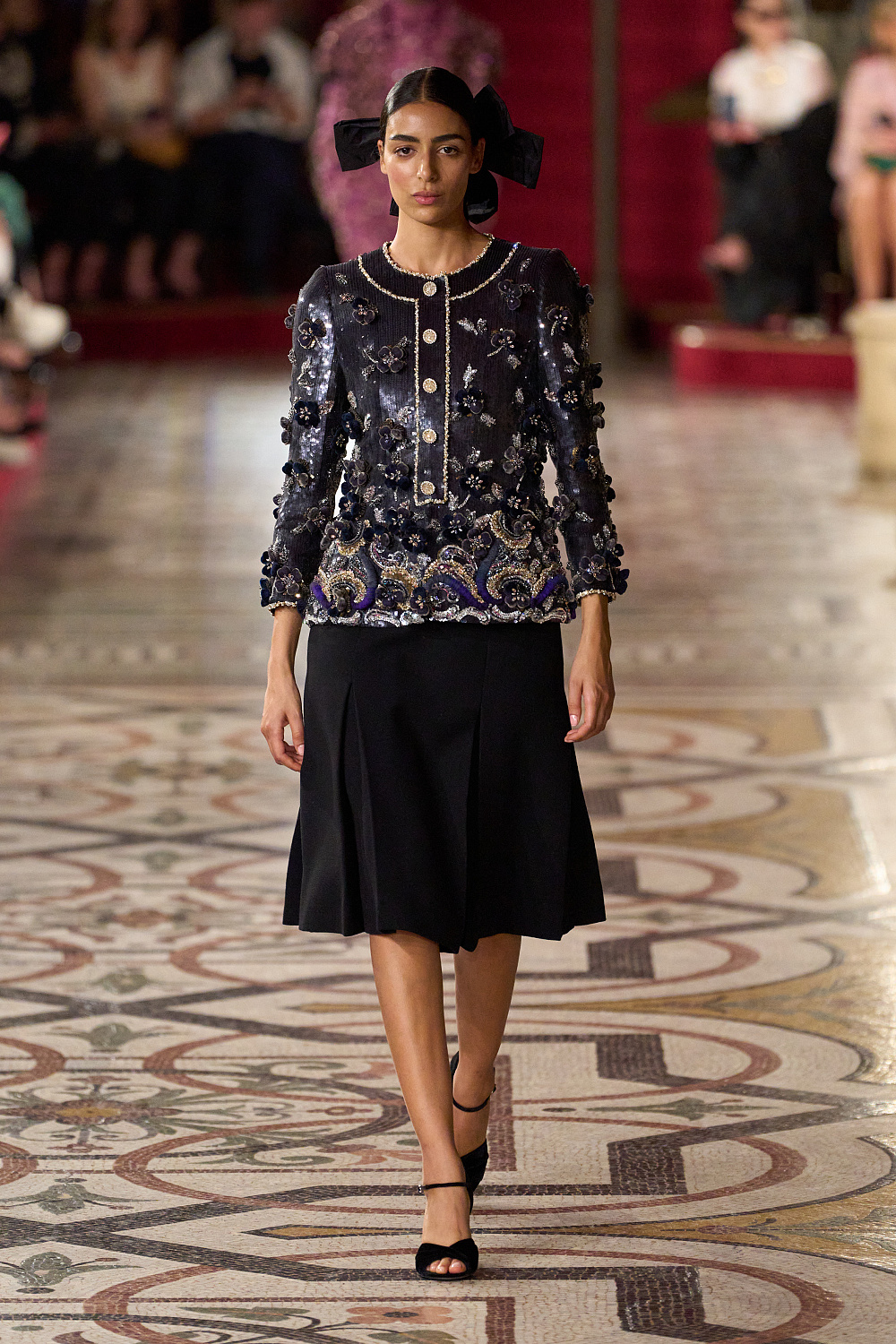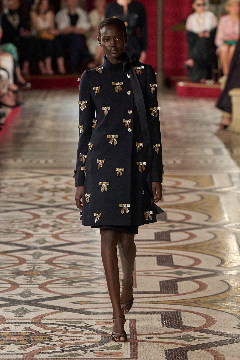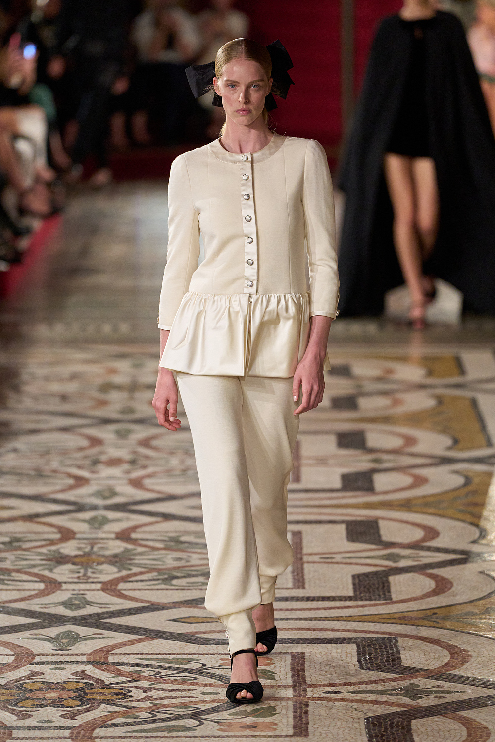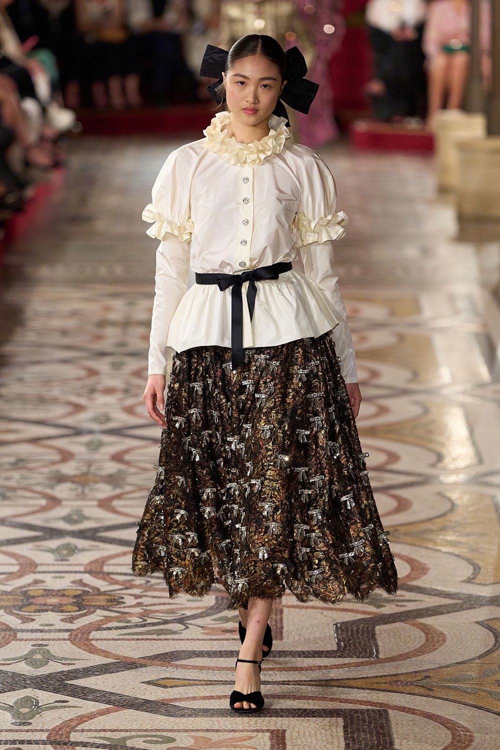 Першою на подіум вийшла Вітторія Черетті в довгому драматичному плащі з об’ємними рукавами та високим коміром з рюшами. Крім цього, були представлені чорні оксамитові смокінги, напівпрозорі сукні з сяйливими деталями, бальні моделі та вже класичні твідові комплекти. Завершив показ традиційно весільний образ, що складався з довгої молочної сукні з рукавами-буфами, корсетом, розшитим квітами, та пишною спідницею.