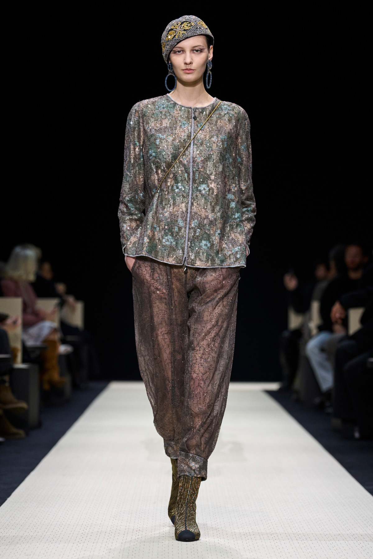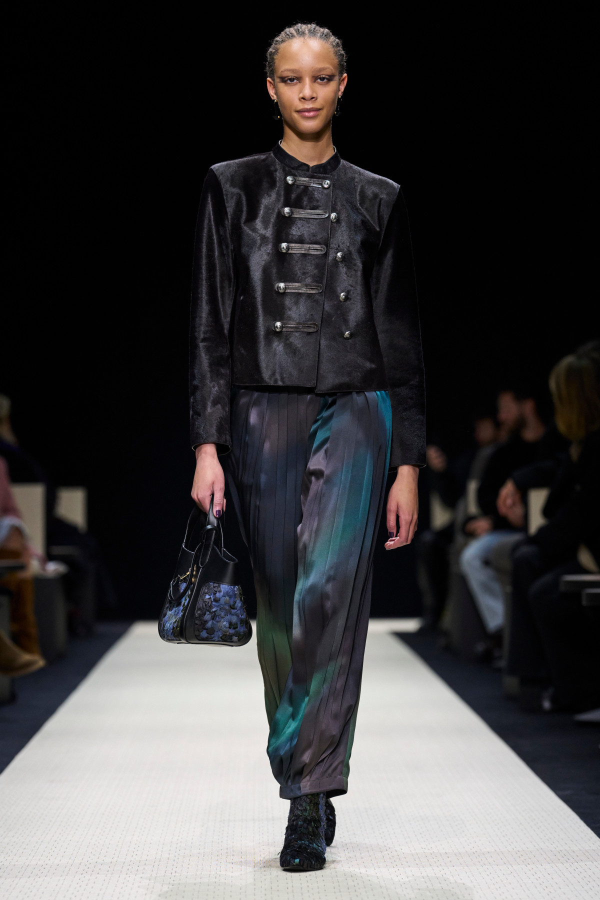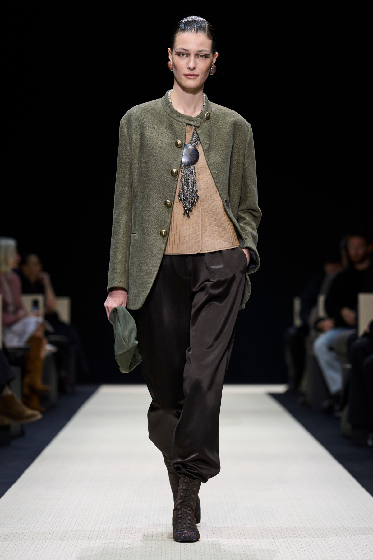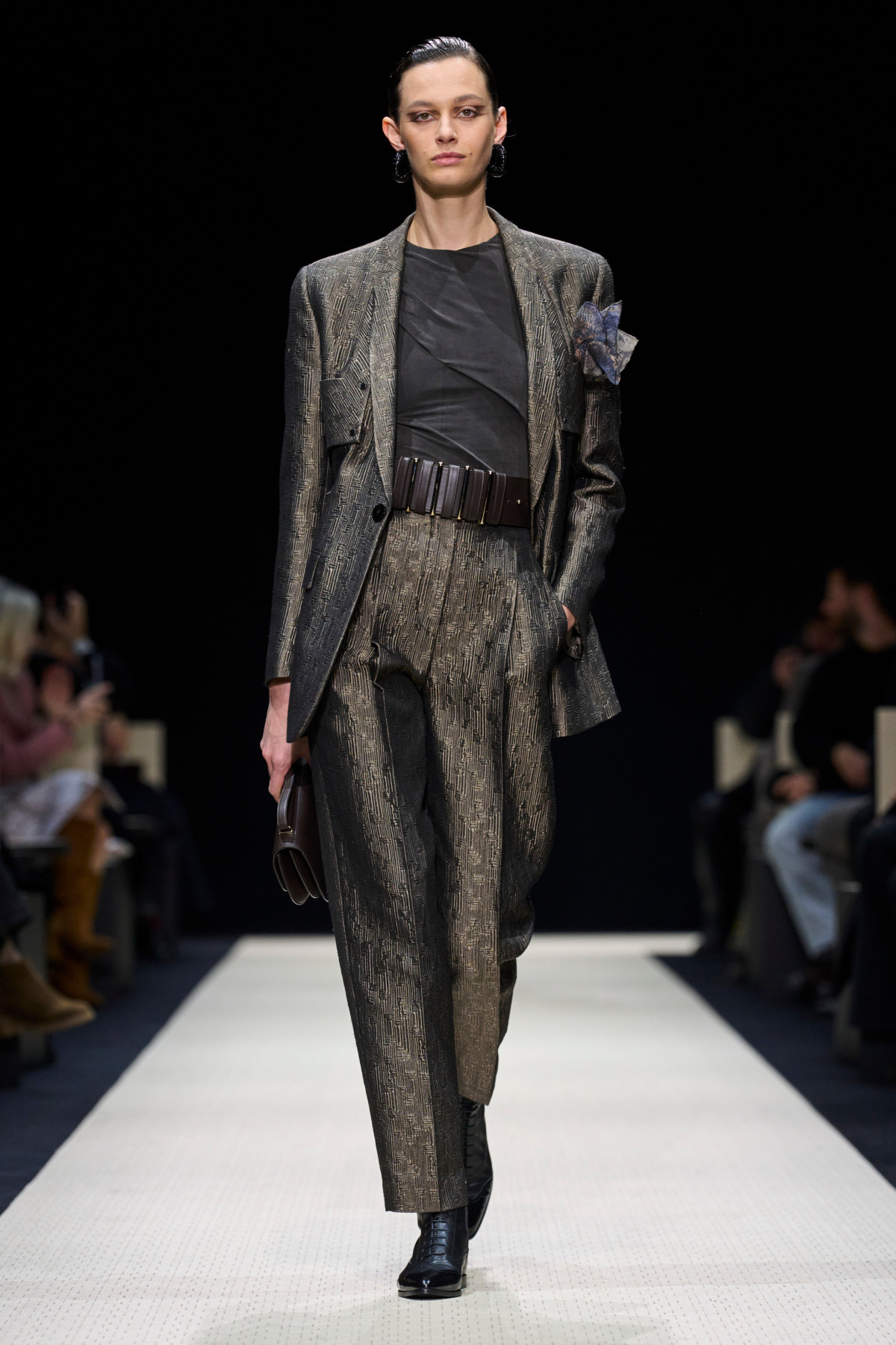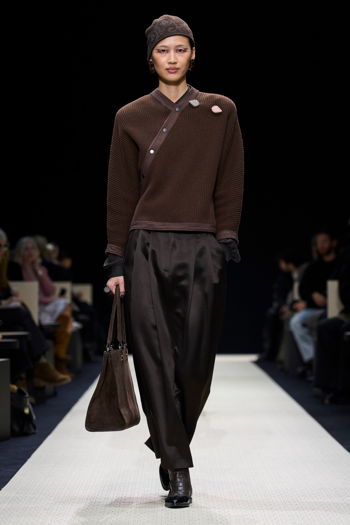 Жінка Giorgio Armani ніколи не виглядає метушливою чи напруженою. Вільні силуети, м’який кашемір і оксамит створили атмосферу невимушеної елегантності, завдяки якій модниці так полюбили одяг бренду. Зокрема, ми побачили вже знайому нам класику в новому прочитанні: базові тренчі зі шкіряним окантуванням; довгі пальта у шоколадному, графітовому та оливковому відтінках; кольорові хутряні шуби; струмливі комплекти з брюками, що плавно огортали тіло; романтичні блузи й кардигани та жакети з коміром-стійкою.