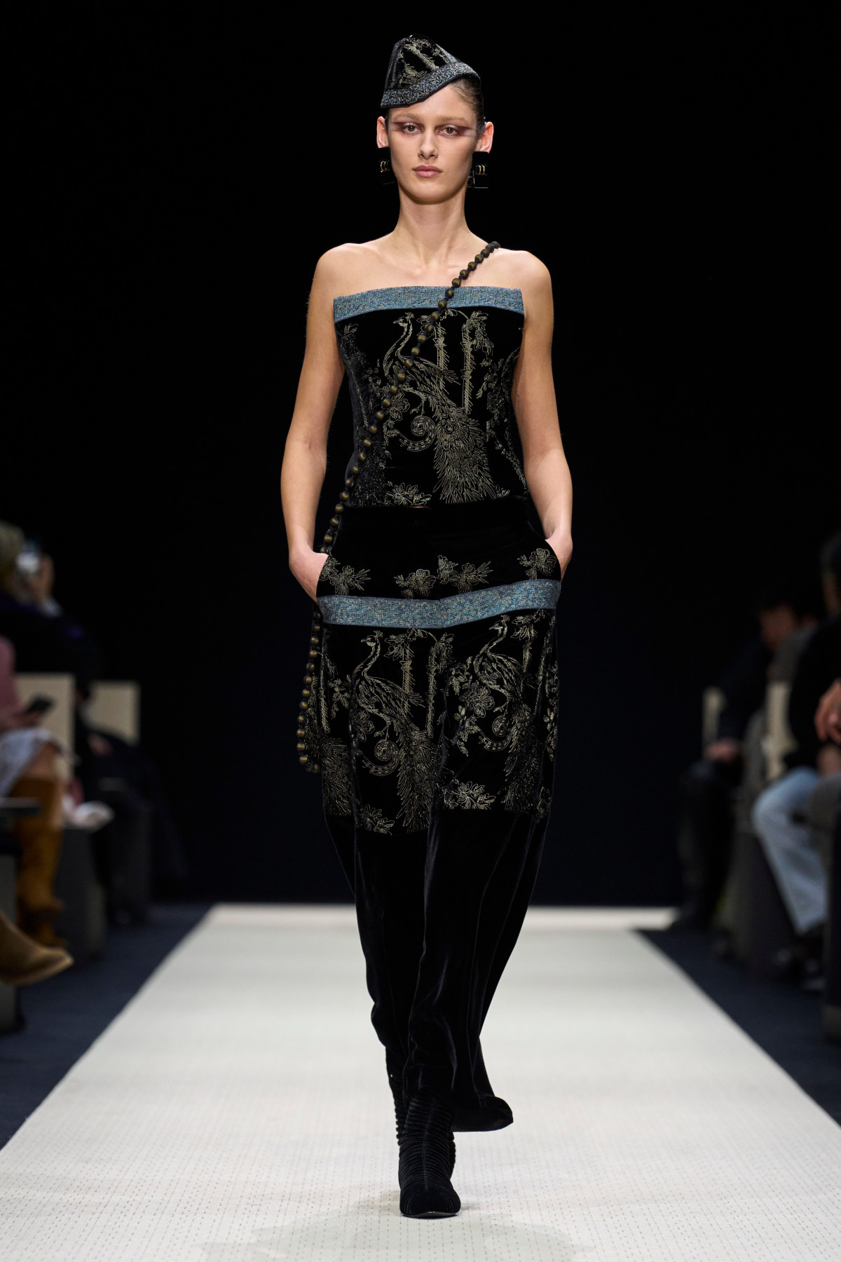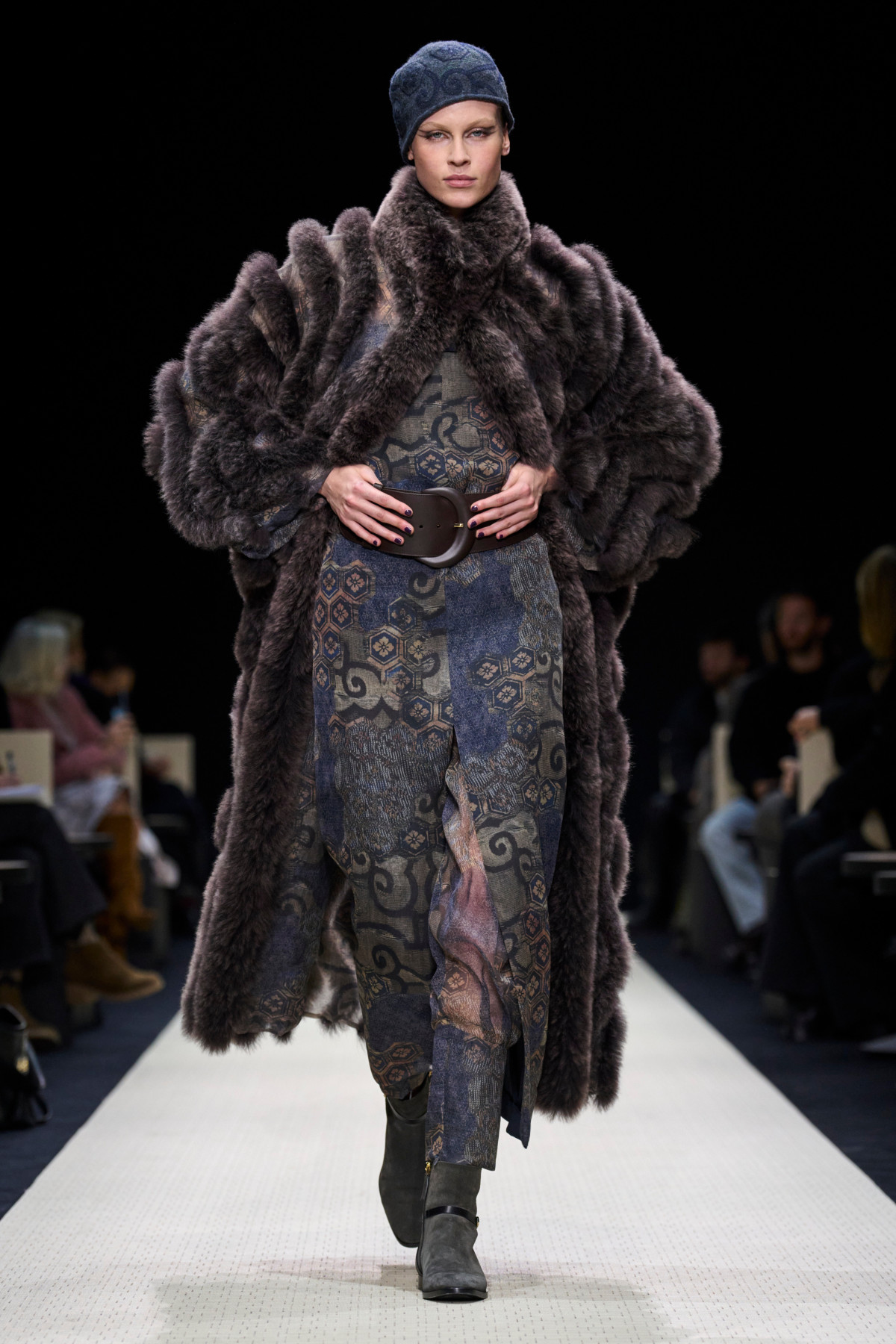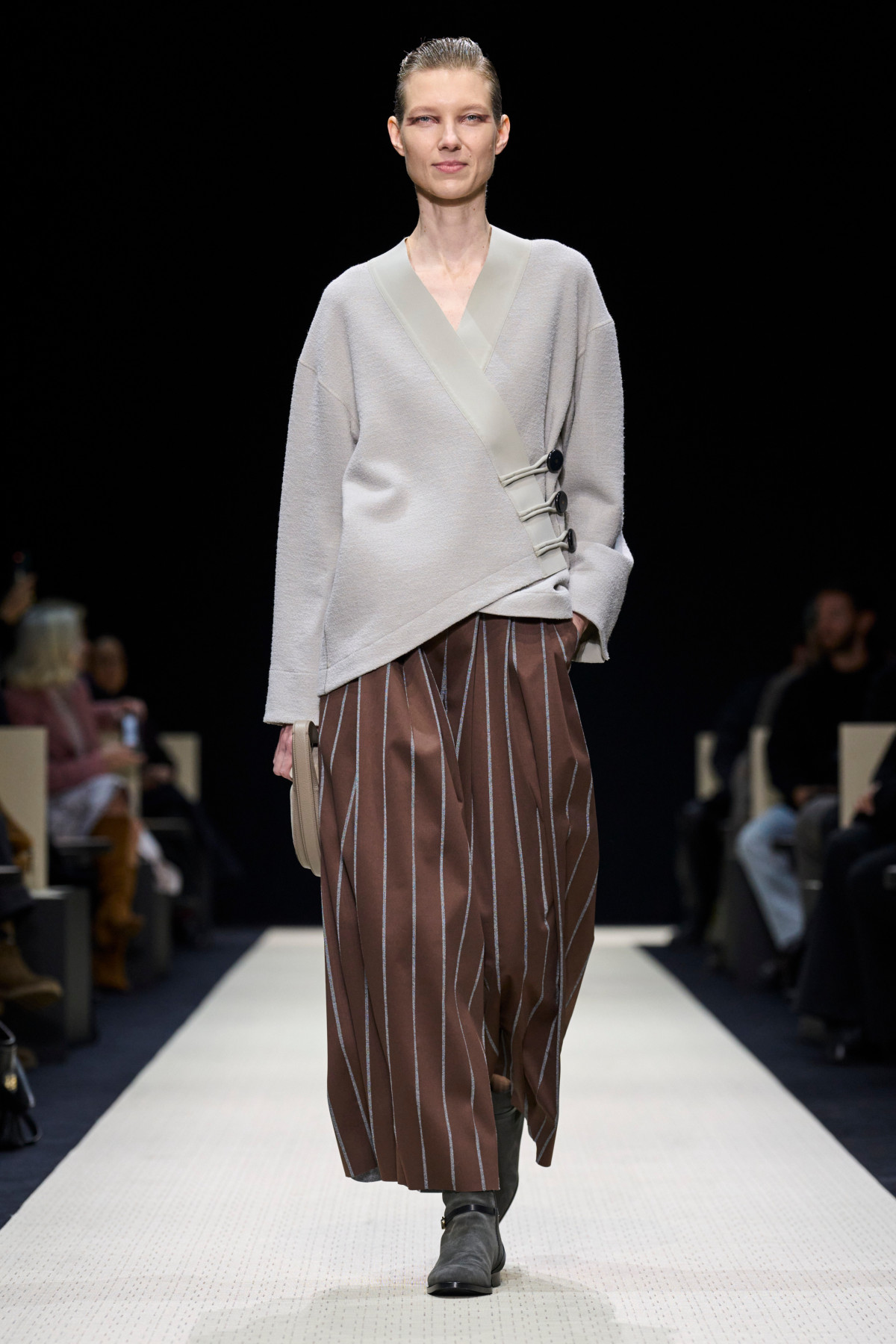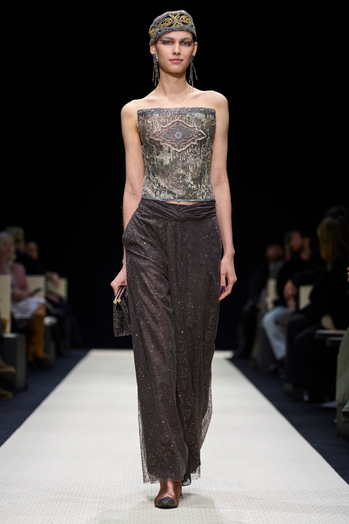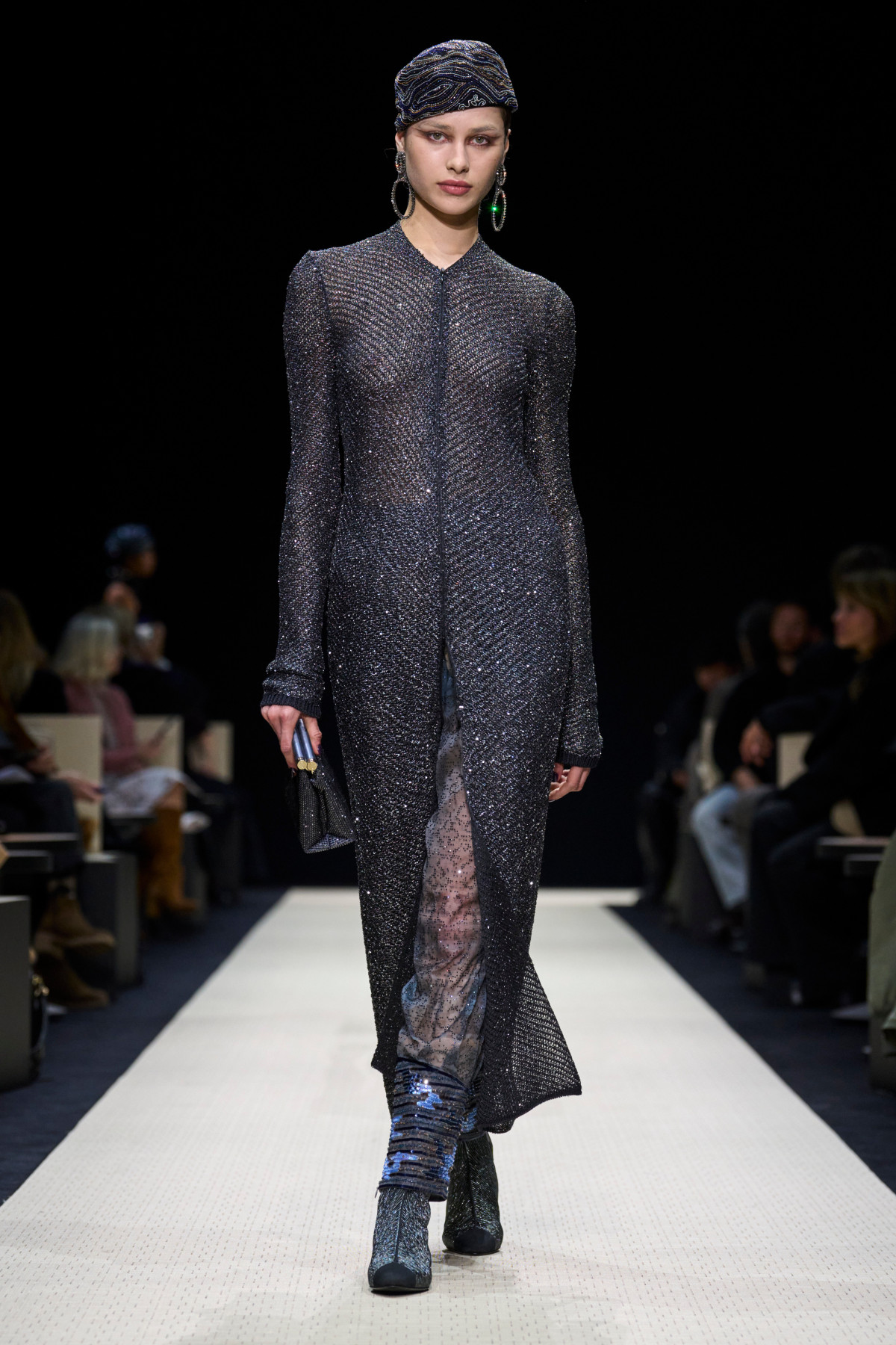 Жінка Giorgio Armani ніколи не виглядає метушливою чи напруженою. Вільні силуети, м’який кашемір і оксамит створили атмосферу невимушеної елегантності, завдяки якій модниці так полюбили одяг бренду. Зокрема, ми побачили вже знайому нам класику в новому прочитанні: базові тренчі зі шкіряним окантуванням; довгі пальта у шоколадному, графітовому та оливковому відтінках; кольорові хутряні шуби; струмливі комплекти з брюками, що плавно огортали тіло; романтичні блузи й кардигани та жакети з коміром-стійкою.
