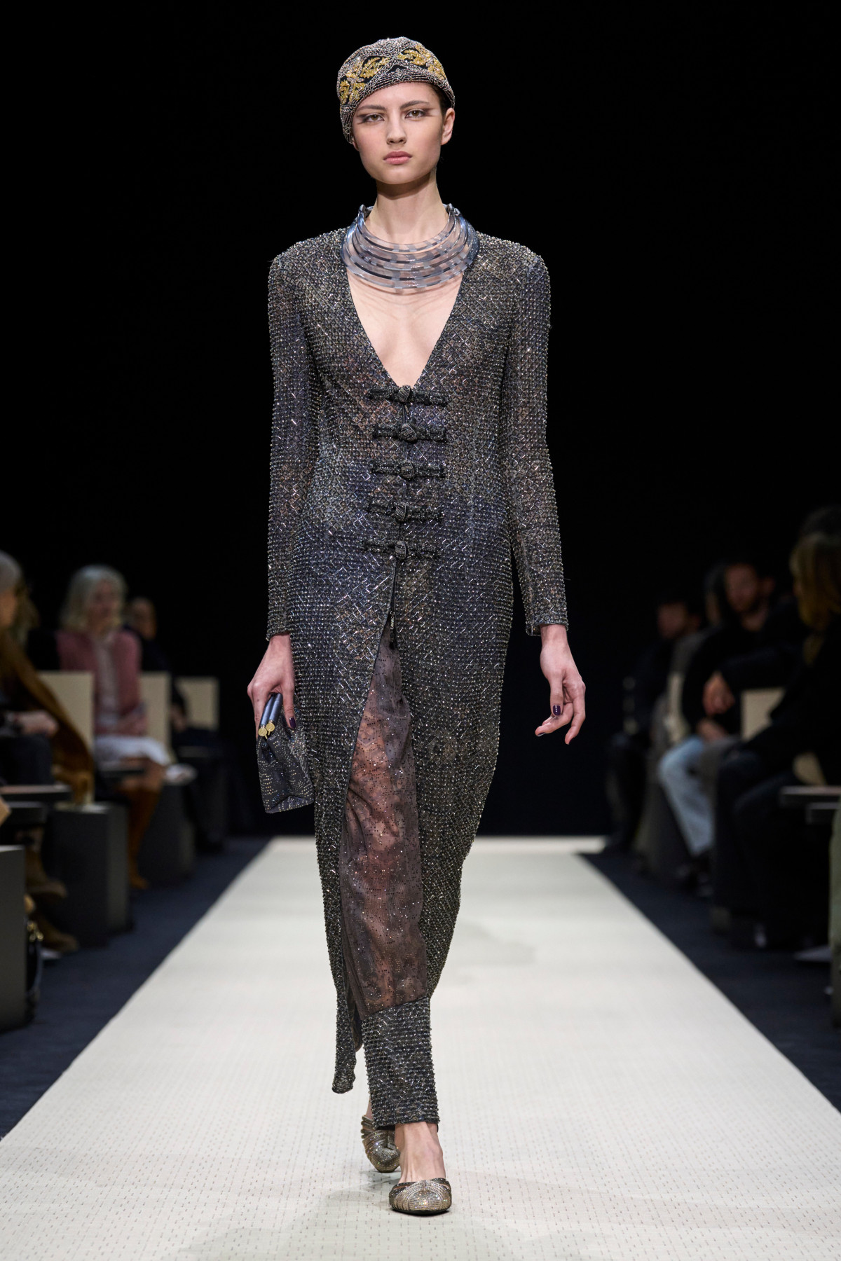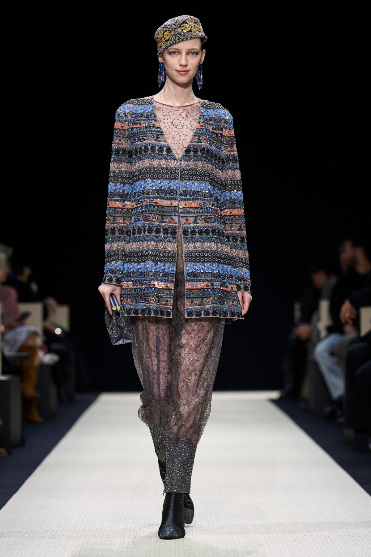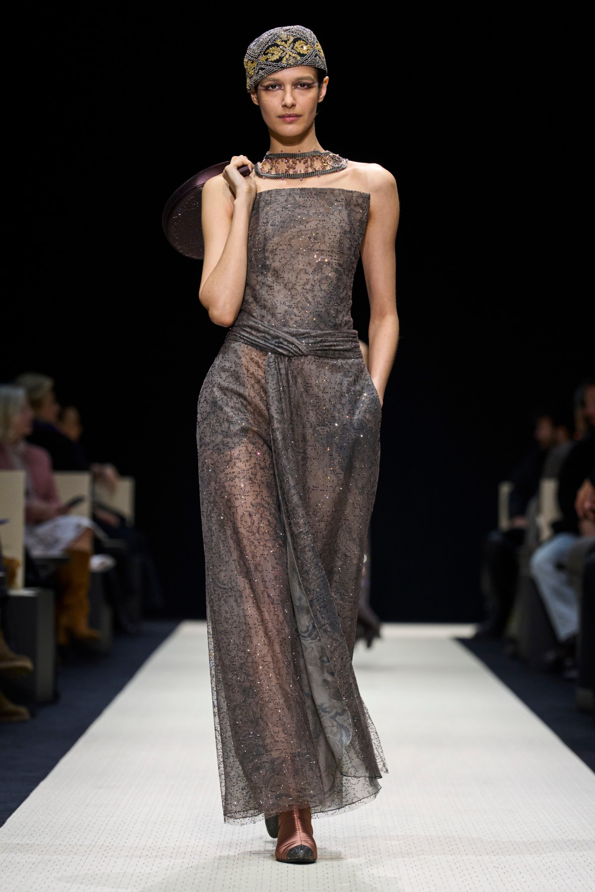 Палітра лінійки також зберегла традиційну для Джорджіо Армані естетику: спочатку глядачів зустріли ніжні відтінки персикового, сірого та бежевого, які впродовж усього шоу змінилися на глибокі сині, коричневі, зелені й чорні.