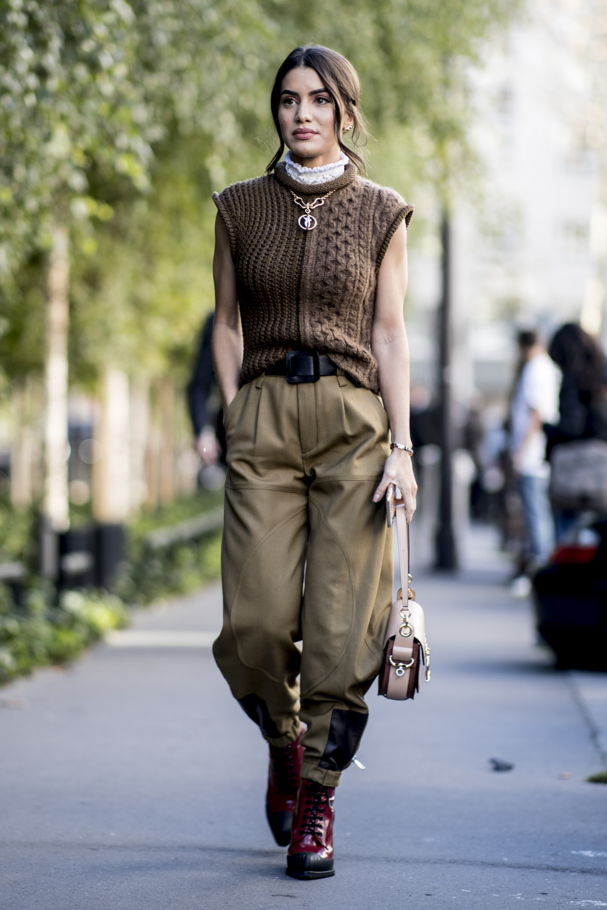 Военные брюки - из грубой ткани, зауженные к низу - идеальная основа для повседневных образов. Они отлично сочетаются со свитерами, будь то объемный свитер крупной вязки, или минималистичный гольф в рубчик. Альтернатива - белая футболка, которая в этой сезоне уместна решительно со всем.