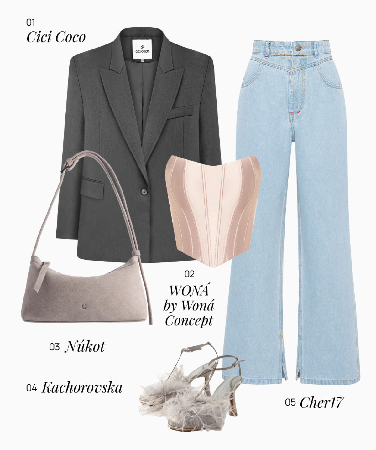 Джинси залишаються незмінною основою гардероба завдяки своїй універсальності — вони легко комбінуються з будь-яким верхом. Саме тому прямі джинси ідеально доповнюють ніжно-рожевий корсет, формуючи образ, який підходить як для повсякденних виходів, так і для вечірніх побачень, а оверсайз-жакет додає потрібного контрасту. Окрім цього, одним із ключових трендів 2025 року залишається пухнасте взуття. Такі туфлі не лише відповідають актуальним тенденціям, але й стають стильним акцентом, гармонійно доповнюючи образ.