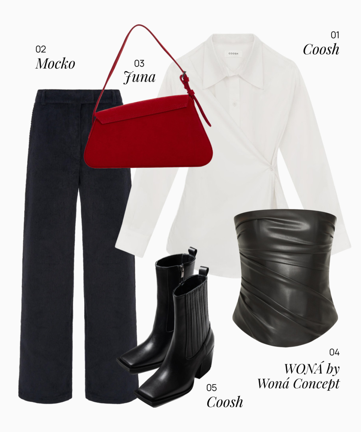 Залишайте сорочку трішки вільною, дозволяючи корсету підкреслювати лінію талії. Щоб завершити аутфіт, доповніть його прямими чорними штанами та стильними шкіряними черевиками. Додайте яскраву деталь до образу за допомогою аксесуарів, як-от червоної сумки.