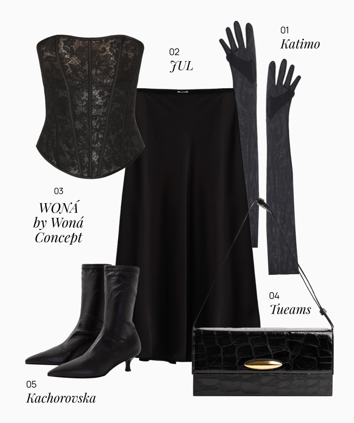 Повністю чорний образ завжди актуальний, і цей варіант — не виняток. Тут він виглядає особливо вдало завдяки поєднанню різних фактур. Мереживний корсет додає образу виразності, а атласна спідниця міді робить силует витонченим та жіночним. Щоб зробити образ ще цікавішим, доповніть його прозорими подовженими рукавичками та гостроносими чоботами, що візуально зроблять ноги стрункішими й додадуть образу шарму.