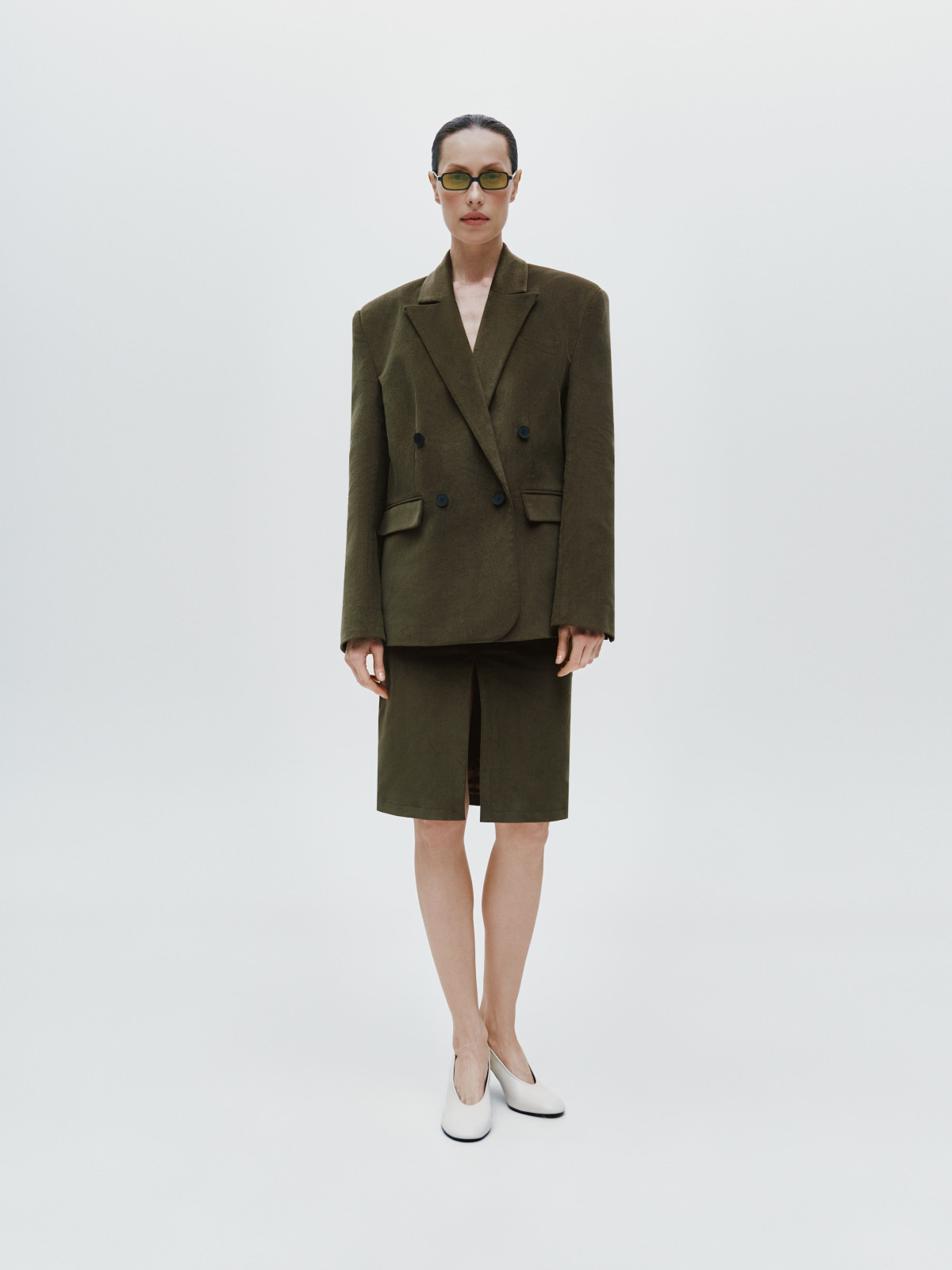 Матеріал з виразною текстурою та глибиною цього сезону стає одним із найактуальніших виборів для модних образів. Його м’яка, але водночас багатогранна поверхня створює ефект розкоші, який ніколи не виходить із моди. Цієї весни зелені відтінки вельвету гармонійно поєднуються з палітрою шоколадних, блакитних та пастельних кольорів. Розкішне втілення цього тренду — костюм від Mocko з двобортним жакетом та спідницею до коліна з високим розрізом. Бездоганний образ для зустрічі весни!