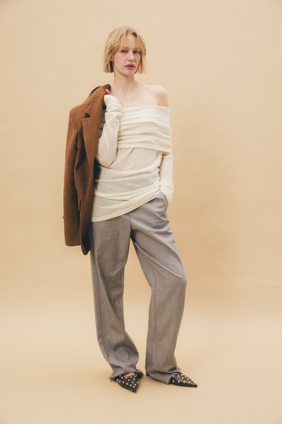 Базові елементи гардероба, такі як біла футболка чи лонгслів, залишаються актуальними незалежно від сезону. Проте дизайнери повсякчас прагнуть додати до цих звичних речей щось нове, що привертає увагу і робить образ таким, що запам`ятовується. Лонгслів від iam у кремовому відтінку — це відмінний приклад. Виконаний з вовни, він поєднує ніжну текстуру з напівпрозорістю, яка разом із відкритими плечима створює шлейф легкості та елегантності. Ця все ж базова, але не тривіальна річ, тепер слугує полотном для створення складних образів із кількома акцентами.