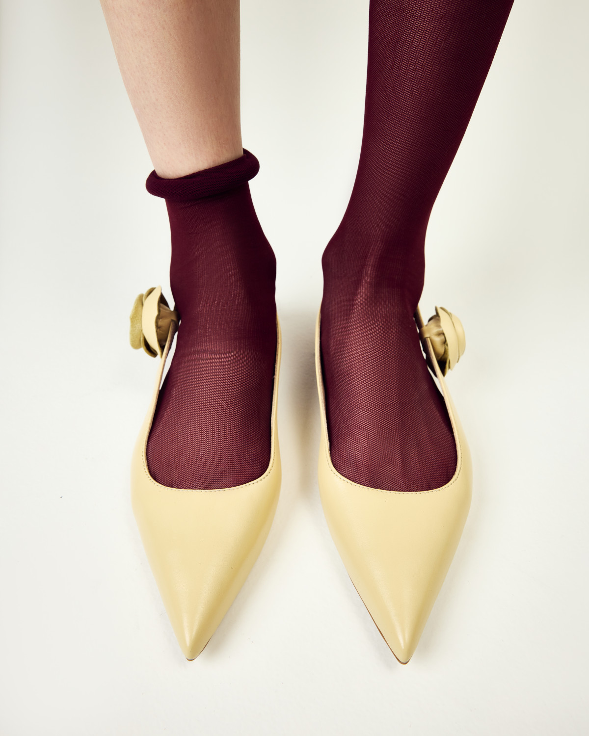 Балетки цієї весни стають справжньою fashion-заявою, особливо якщо це модель з бананової шкіри на низькому підборі, як у Lookie Atelier. Гострий носок додає витонченості, а ніжний теплий відтінок — між вершковим маслом і лимонним кремом — відображає головну кольорову тенденцію сезону. Колекція натхнена текстурами весни, її кольорами та пробудженням природи. У цьому взутті ніби зафіксований момент весняного заходу сонця: теплий, м’який, мінливий. А ще — продовжується квіткова тема бренду: святкові сатинові квіти стали об’ємнішими, а нові шкіряні квіткові аплікації тепер прикрашають навіть пари на щодень. Ця модель — втілення елегантності й практичності. Її легко поєднувати і з летючими сукнями, і з брючними костюмами, а м’яка бананова шкіра робить їх комфортними на цілий день.