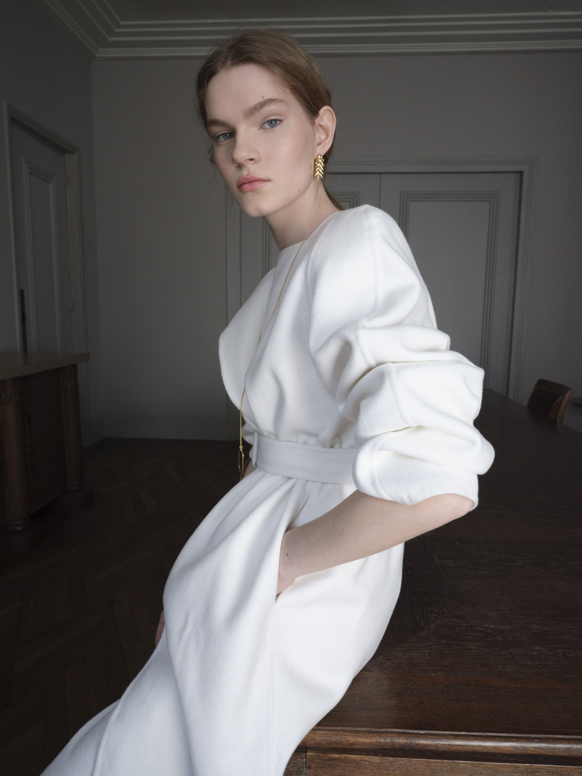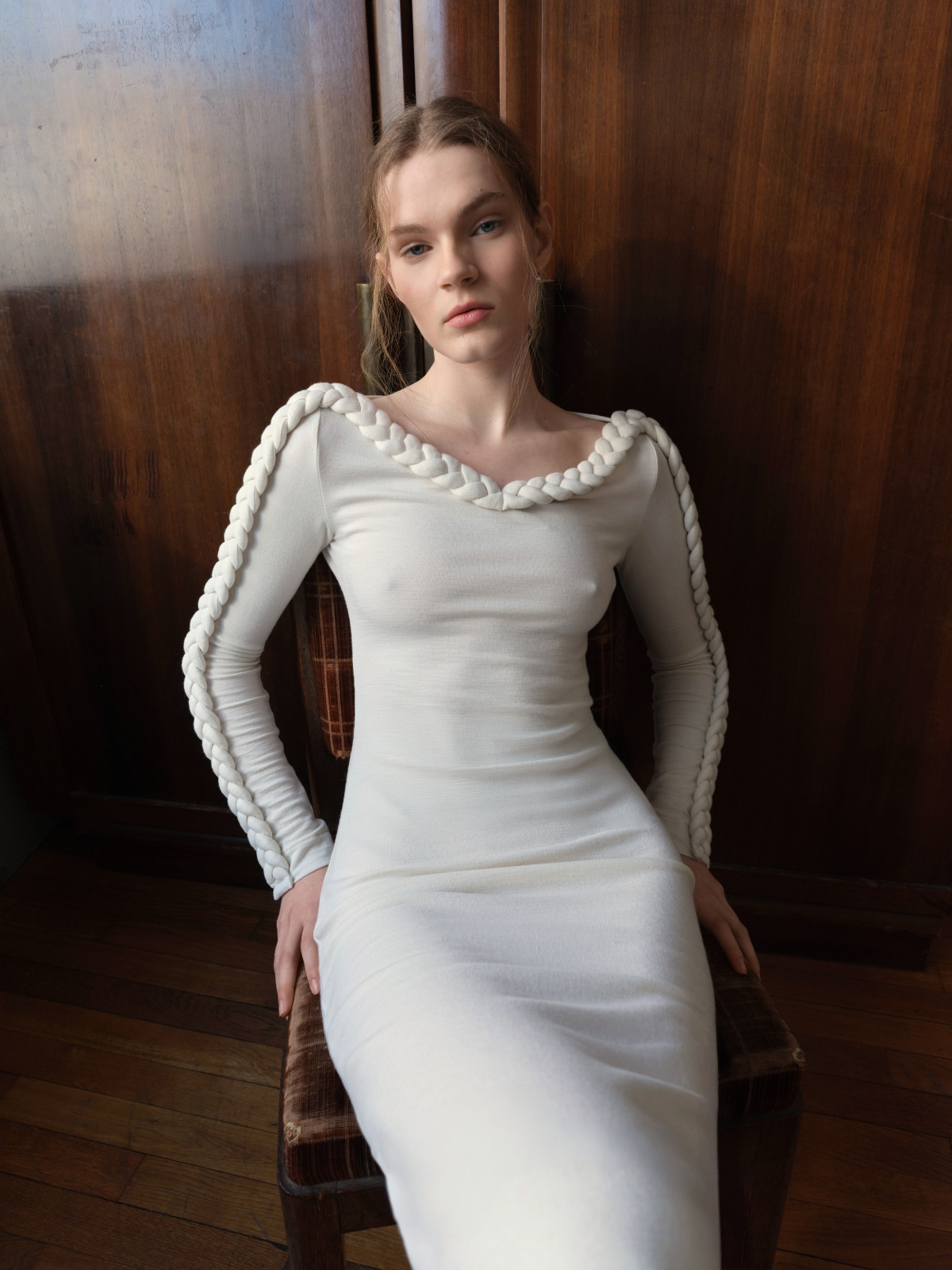 «Я давно стежу за BEVZA — для мене це бренд, що виходить за межі елегантності. Він розповідає історії, чого так бракує моді сьогодні. Для цього кампейну я уявляла жінку, яка самотньо рухається старим паризьким будинком із тихою величчю, приміряє одяг лише для себе, без глядачів і без жодних причин, окрім власного задоволення», — розповідає Еллі.