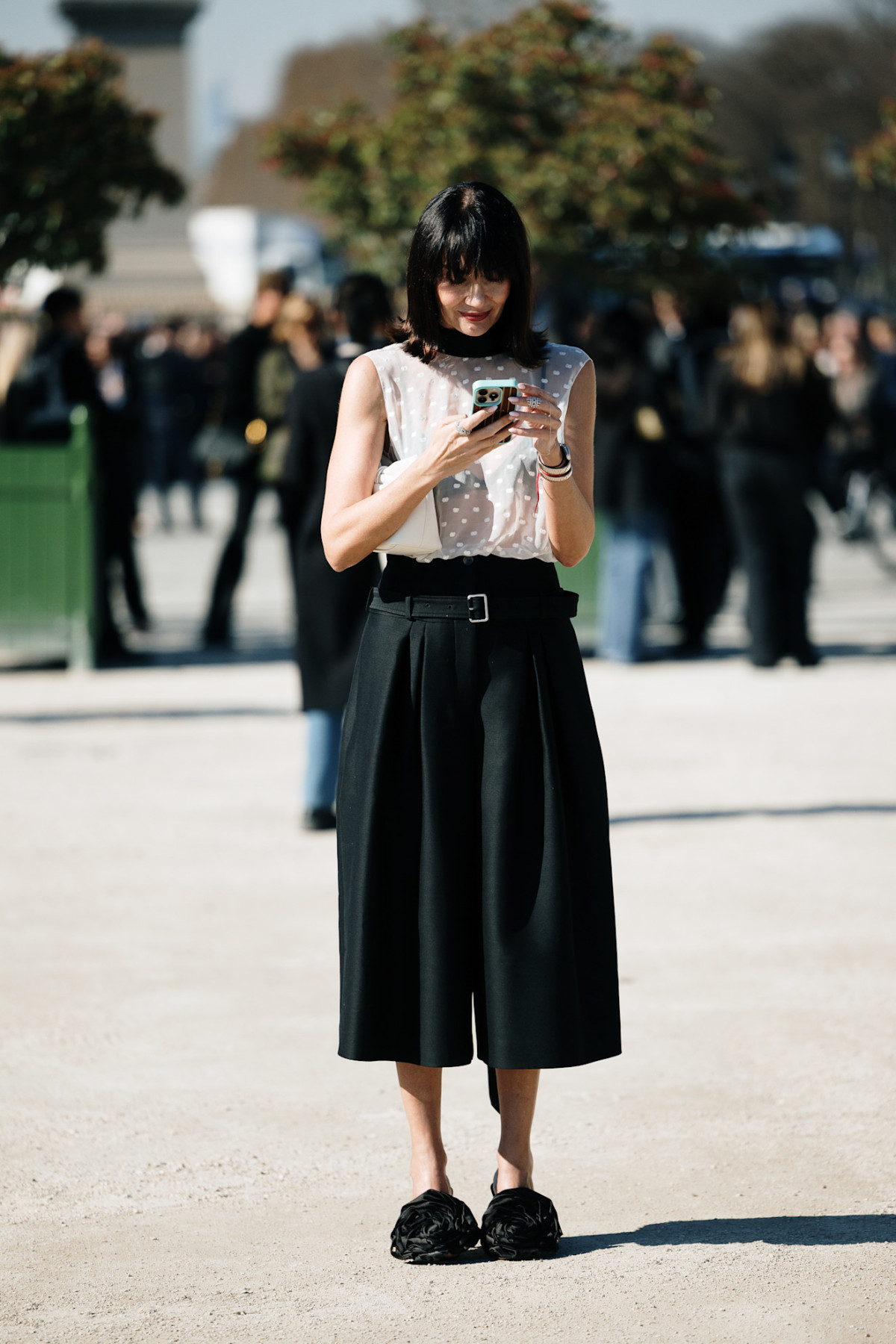 Інший варіант — зіграти на ніжності та жіночності: додати до кюлотів напівпрозорий топ у горох та взуття з декором або зручні мюлі.