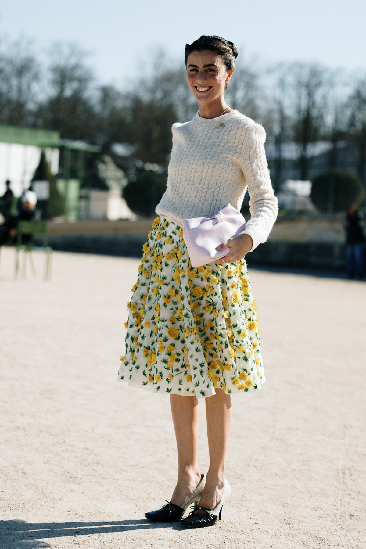 Спідниці міді можуть бути виконані в різних стилях. На паризьких вулицях ми помітили кілька цікавих варіантів. Повітряну спідницю з квітковим декором, що має дуже весняний настрій, можна поєднати зі светром із косами у дусі Ralph Lauren, туфлями на підборах із квадратним носом або трикутним вирізом і м’якою сумкою чи клатчем комплементарного кольору.